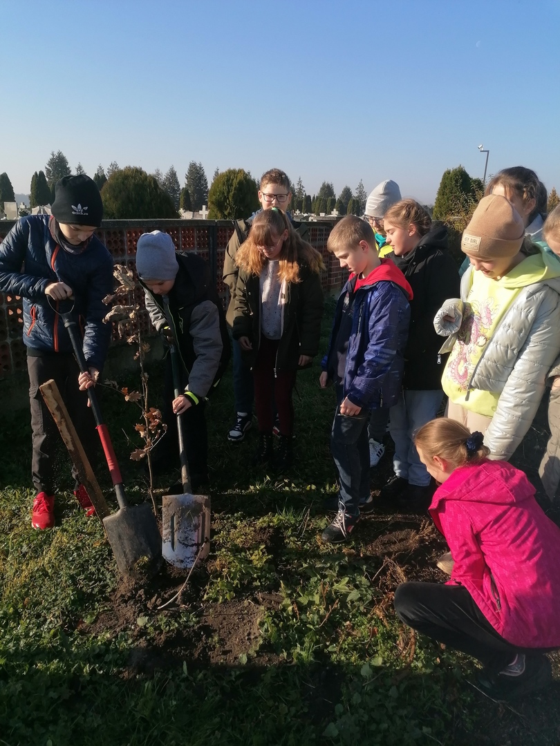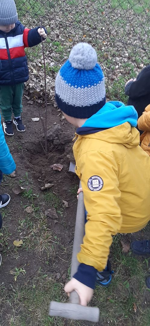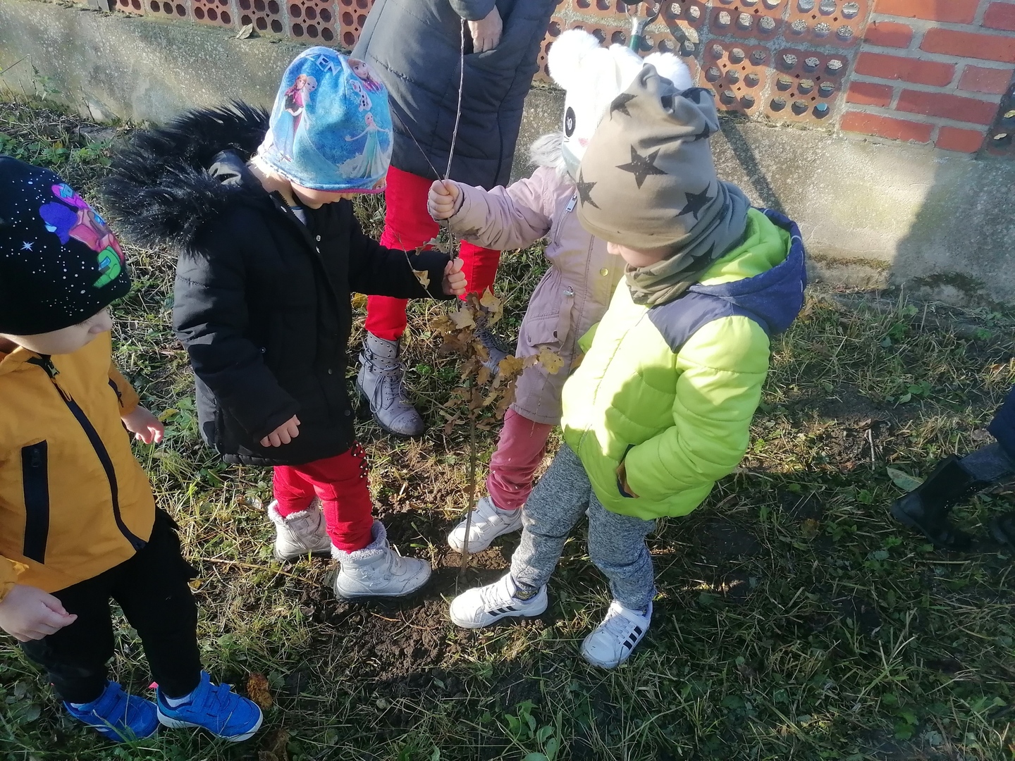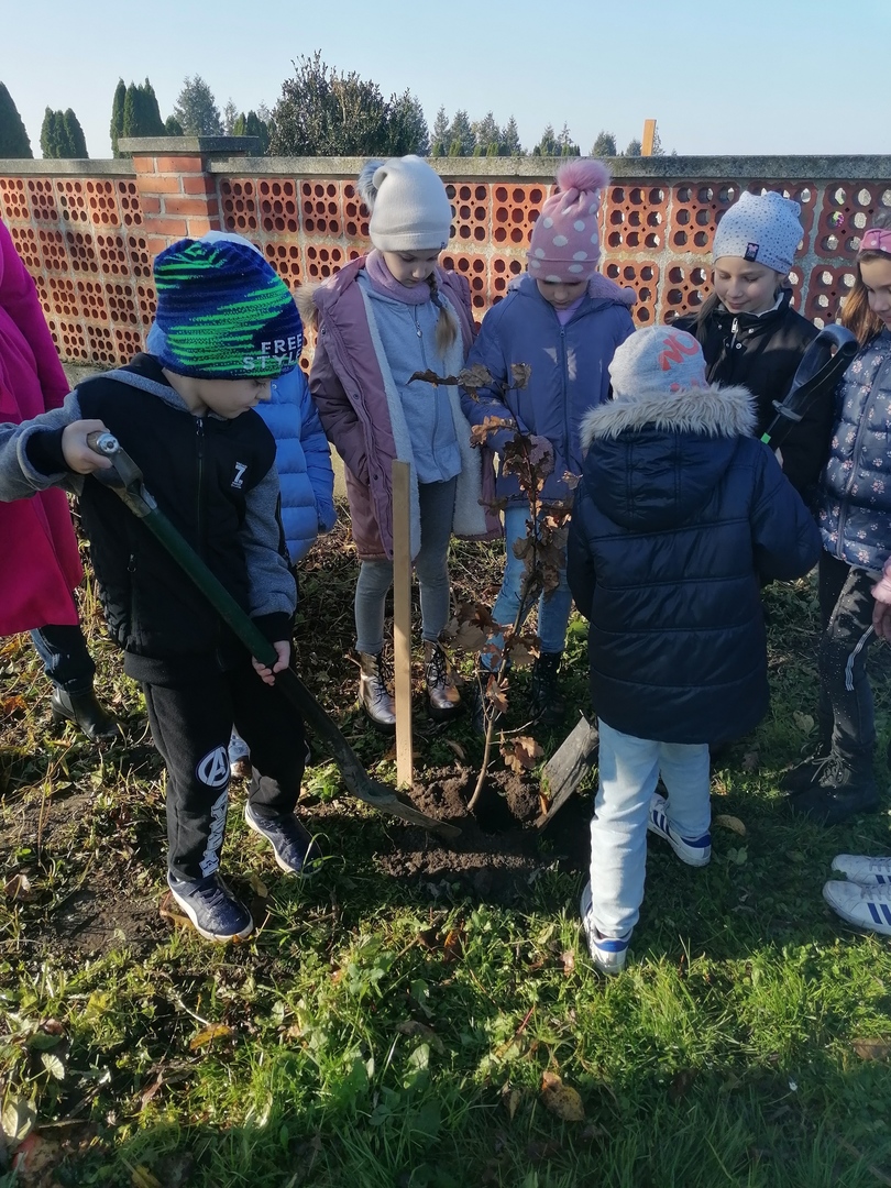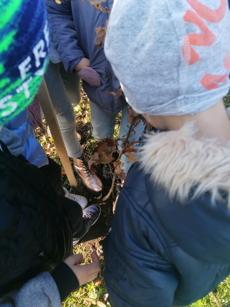 W ramach programu edukacji ekologicznej w naszej szkole w dniu 15 listopada br., w piękne, słoneczne przedpołudnie uczniowie posadzili drzewa na terenie ogrodu szkolnego. Każda klasa otrzymała symboliczną sadzonkę dębu, natomiast dzieci z oddziałów przedszkolnych otrzymały sadzonkę jarzębiny. Podczas całego pobytu w szkole będą pielęgnować i obserwować wzrost drzew. Po wielu latach, jako dorośli ludzie będą mogli zobaczyć co zrobili jako uczniowie tej szkoły. Niech posadzone drzewa będą symbolem upływającego czasu i na zawsze pozostaną ostoją przyrody wokół naszej szkoły.