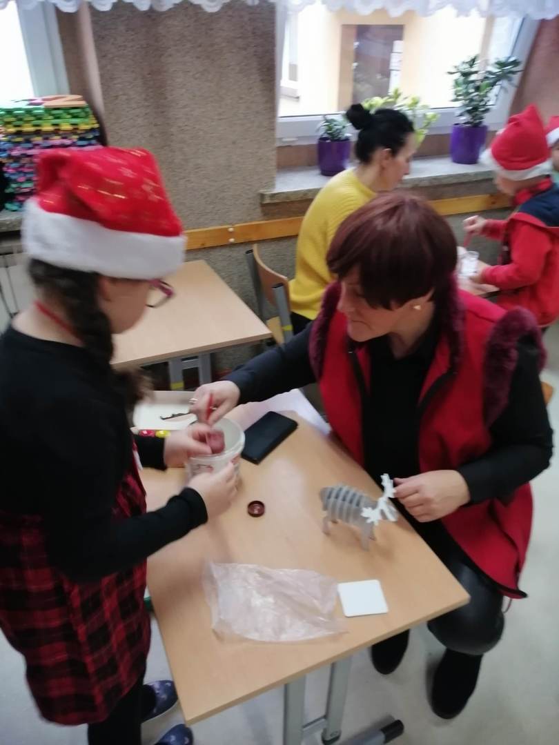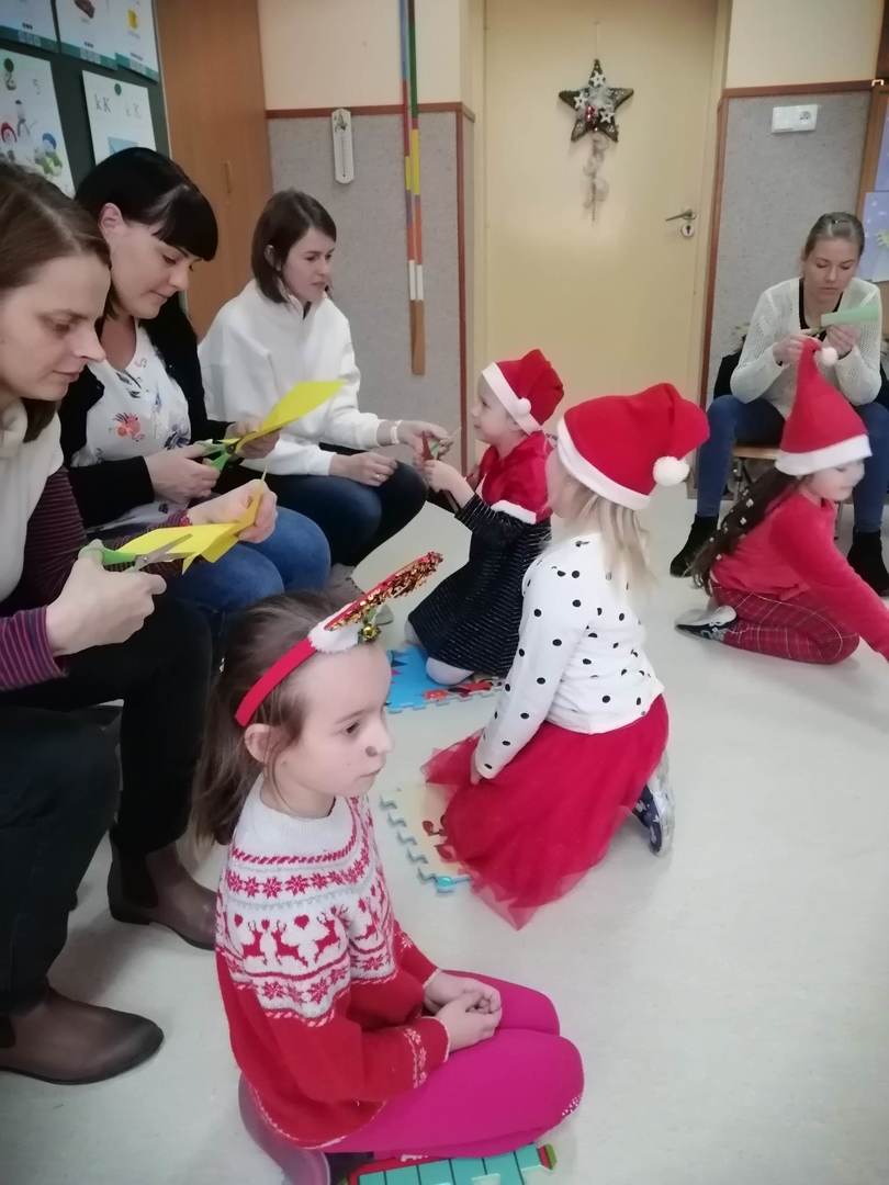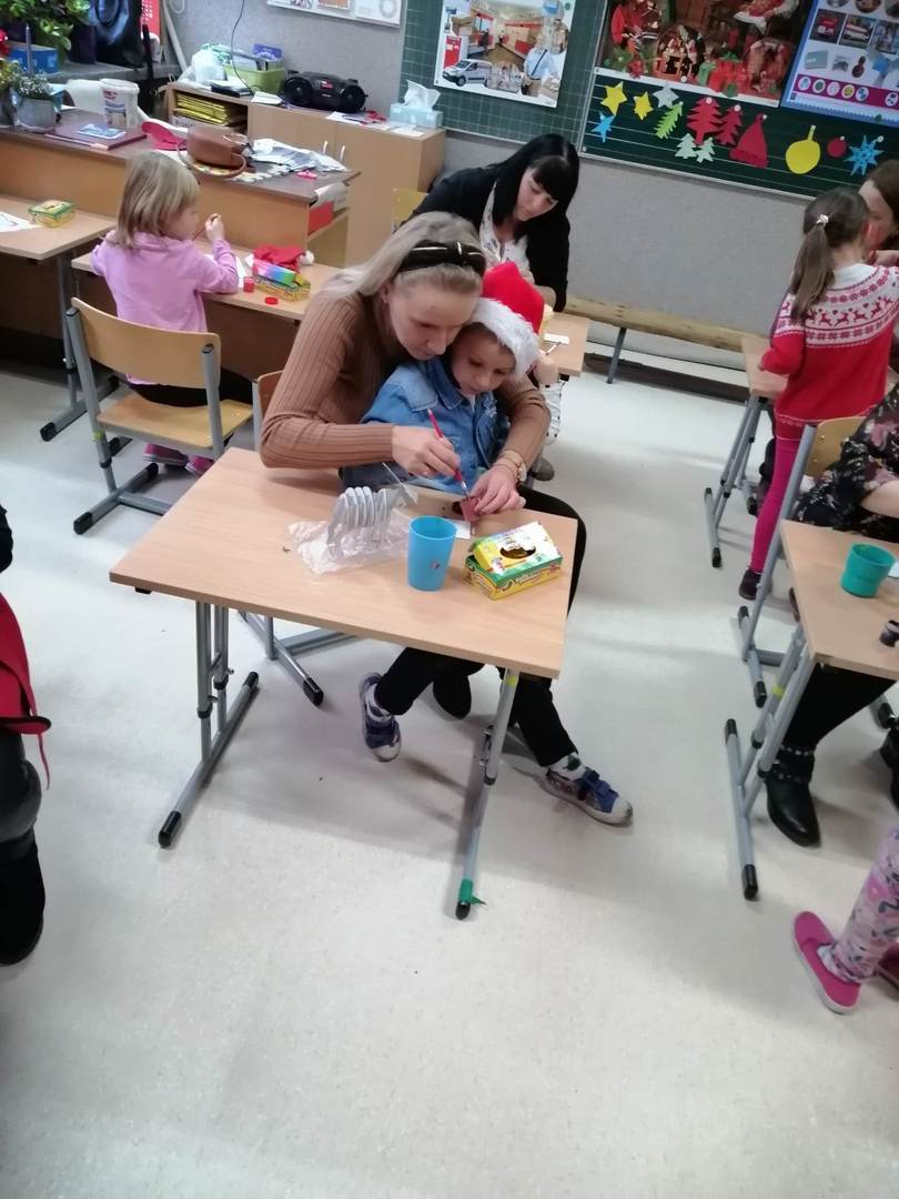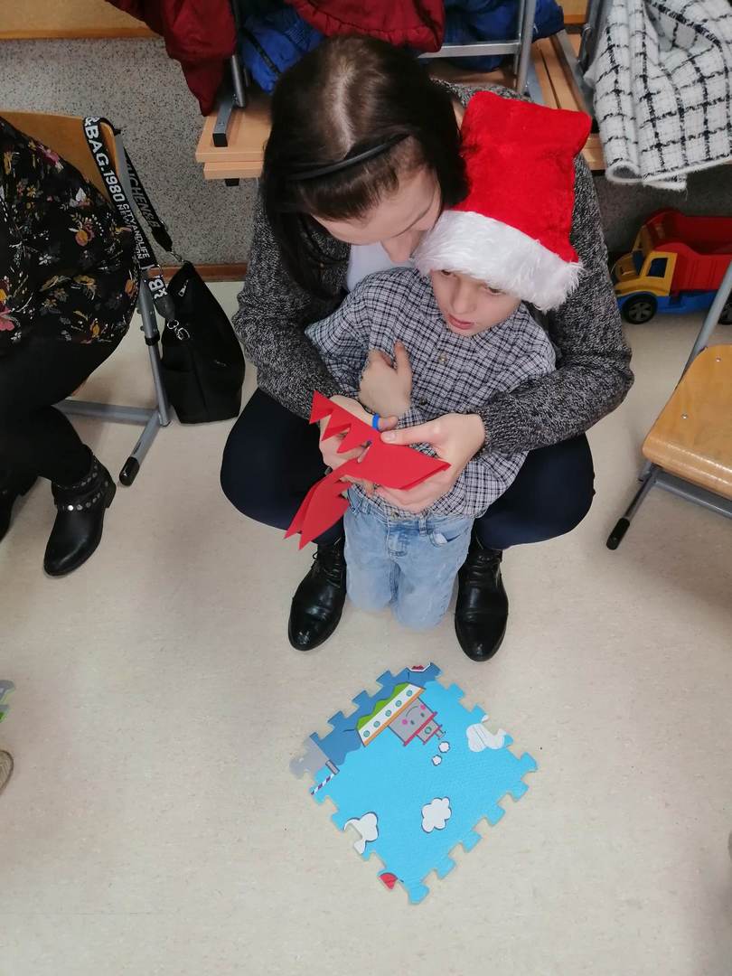 Od rana w przedszkolu zawitał Święty Mikołaj i obdarował dzieci słodkimi upominkami. Sześciolatki pięknie wystąpiły przed świątecznym gościem. Troszkę później w tym oddziale odbyło się spotkanie mikołajkowe, na które zostały zaproszone mamy. Podczas zajęć były tańce do znanych kolęd i pastorałek popularnych w naszym rejonie. Na zakończenie wspólnie wykonano przestrzennego renifera, który przygotowuje się na wigilijny wieczór