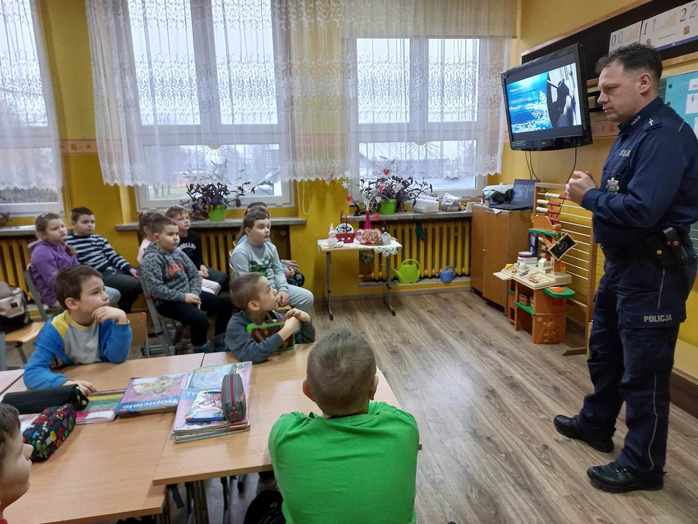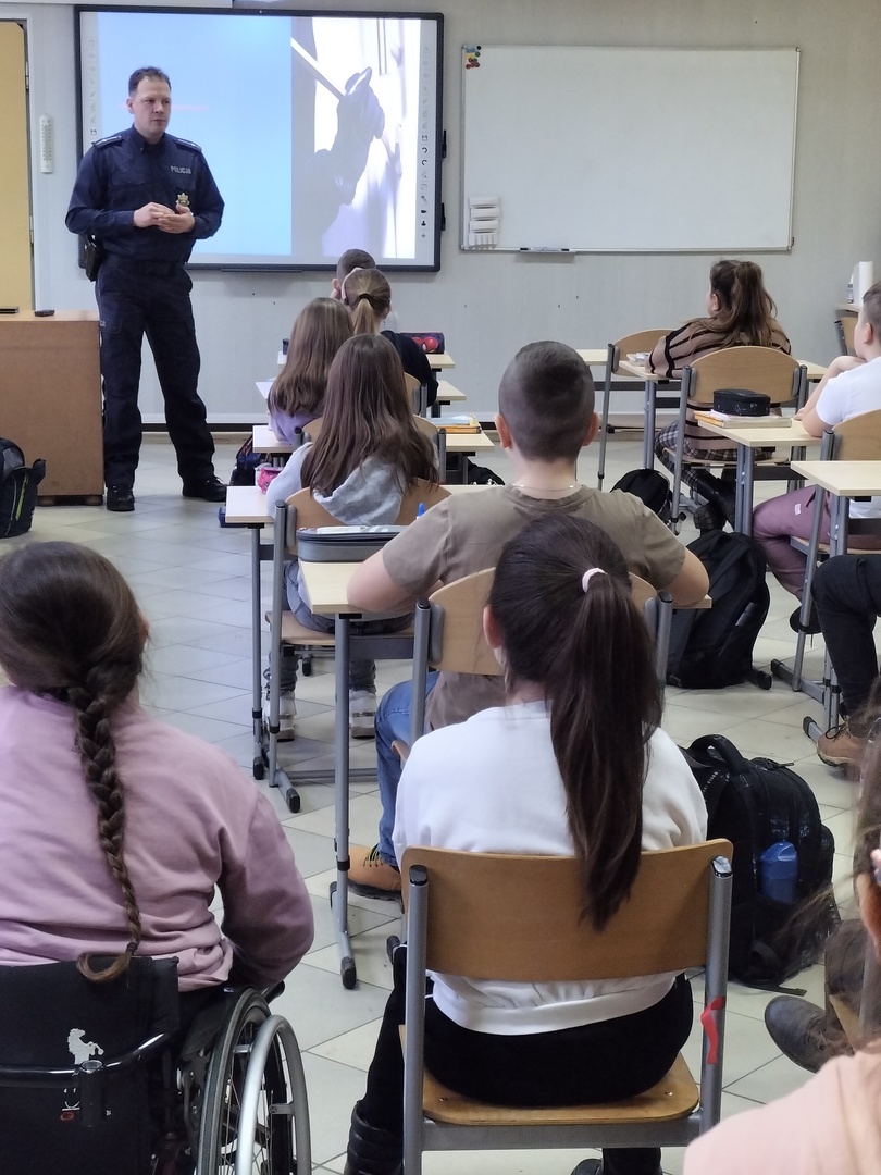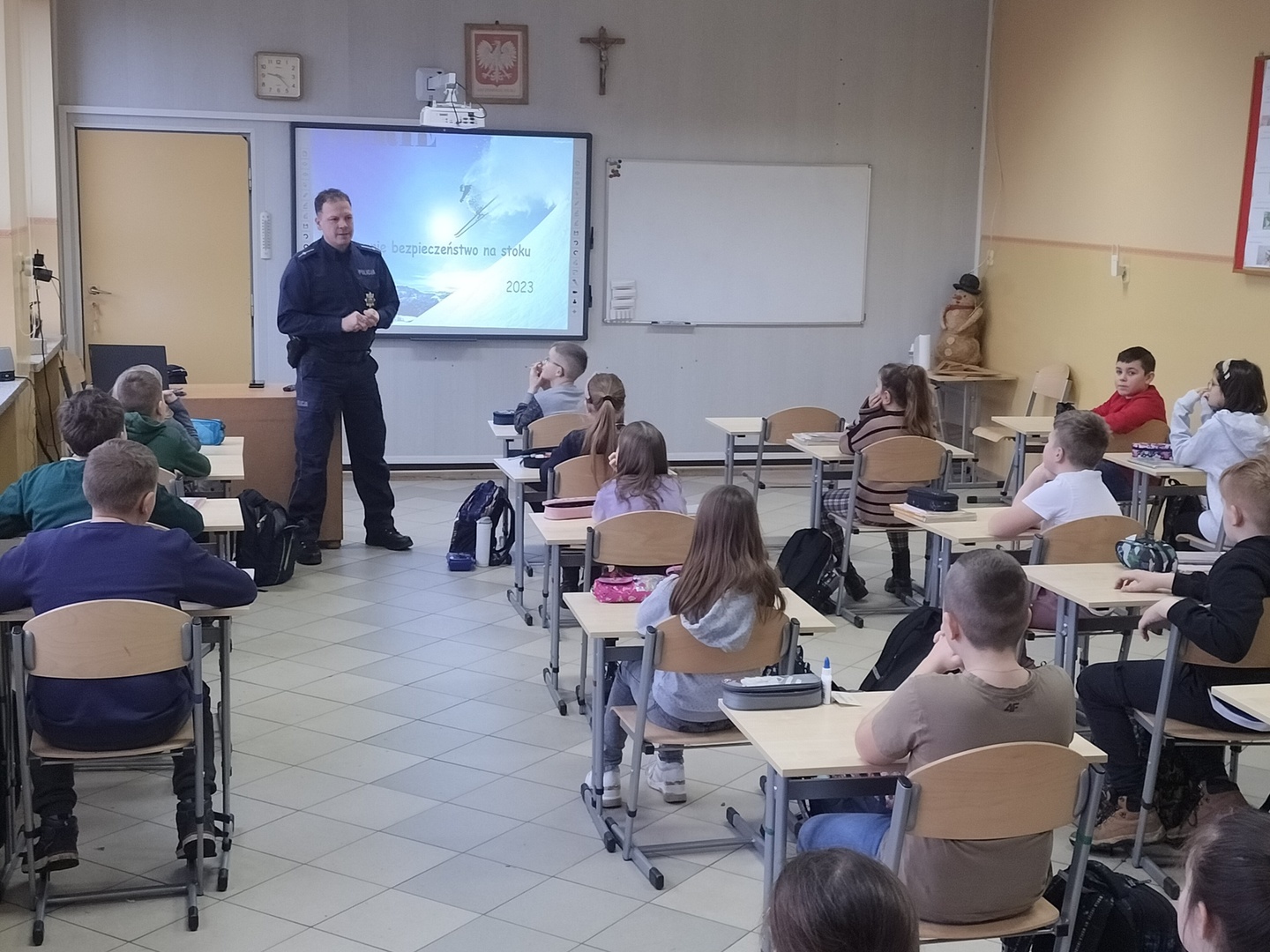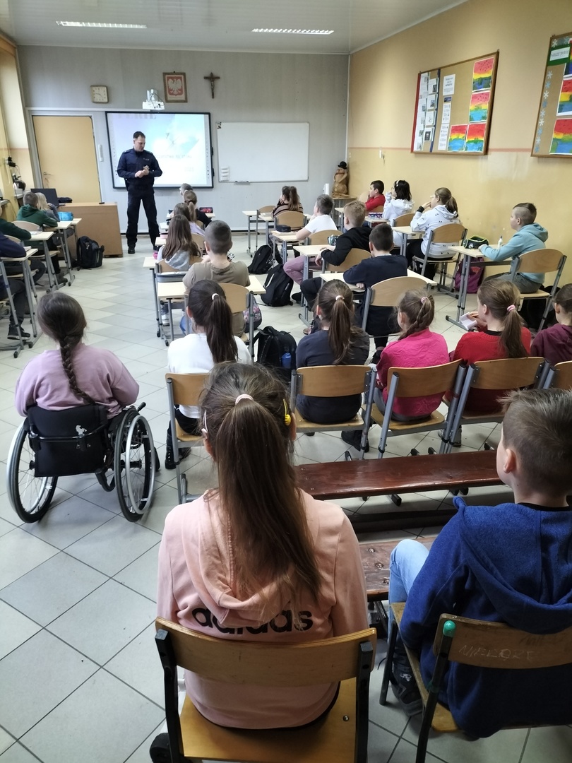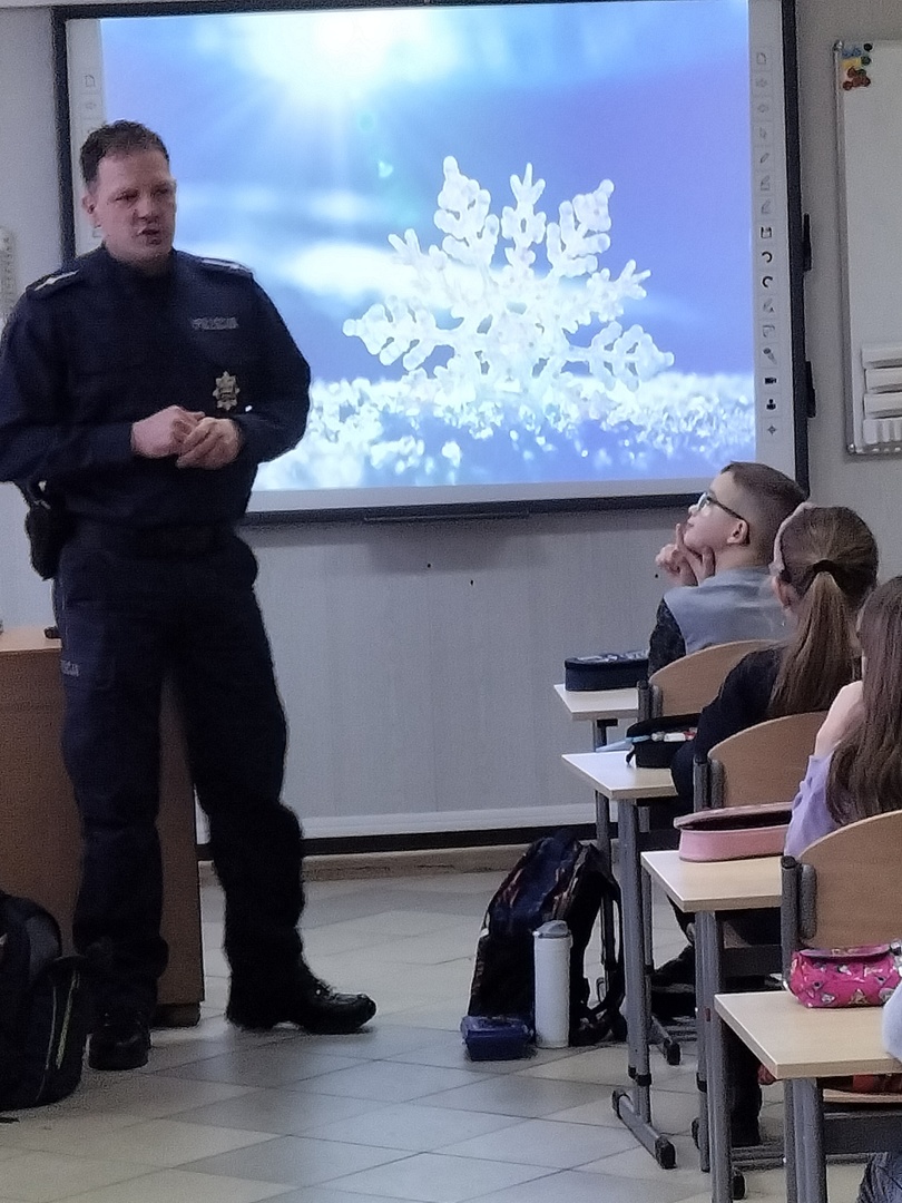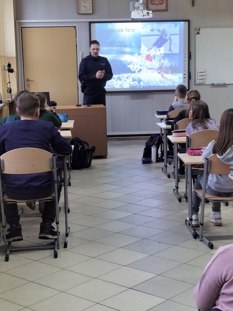 W piątek 27.01.2023 r., tuż przed feriami mł.asp. Bartosz Karwik spotkał się z uczniami klas I-IV na pogadance. Tematem spotkania były zagadnienia związane z bezpieczeństwem podczas ferii zimowych. Omówiono zasady bezpiecznych zabaw na śniegu, niebezpieczeństw związanych z wchodzeniem na lód w miejscach zabronionych oraz postepowania wobec osób nieznajomych próbujących nawiązać kontakt z dziećmi.Na zakończenie życzył wszystkim uczniom wypoczynku ibezpiecznych ferii !