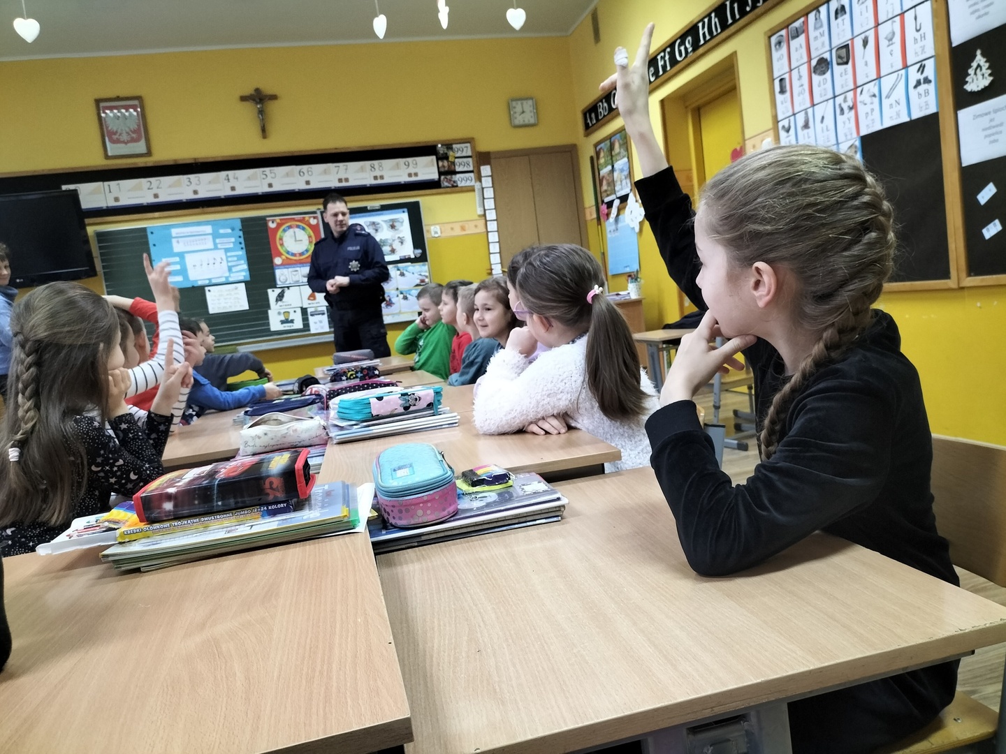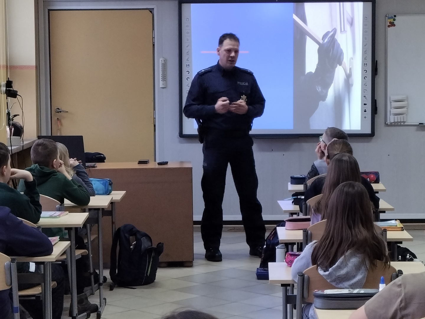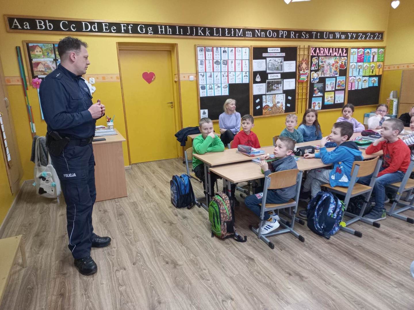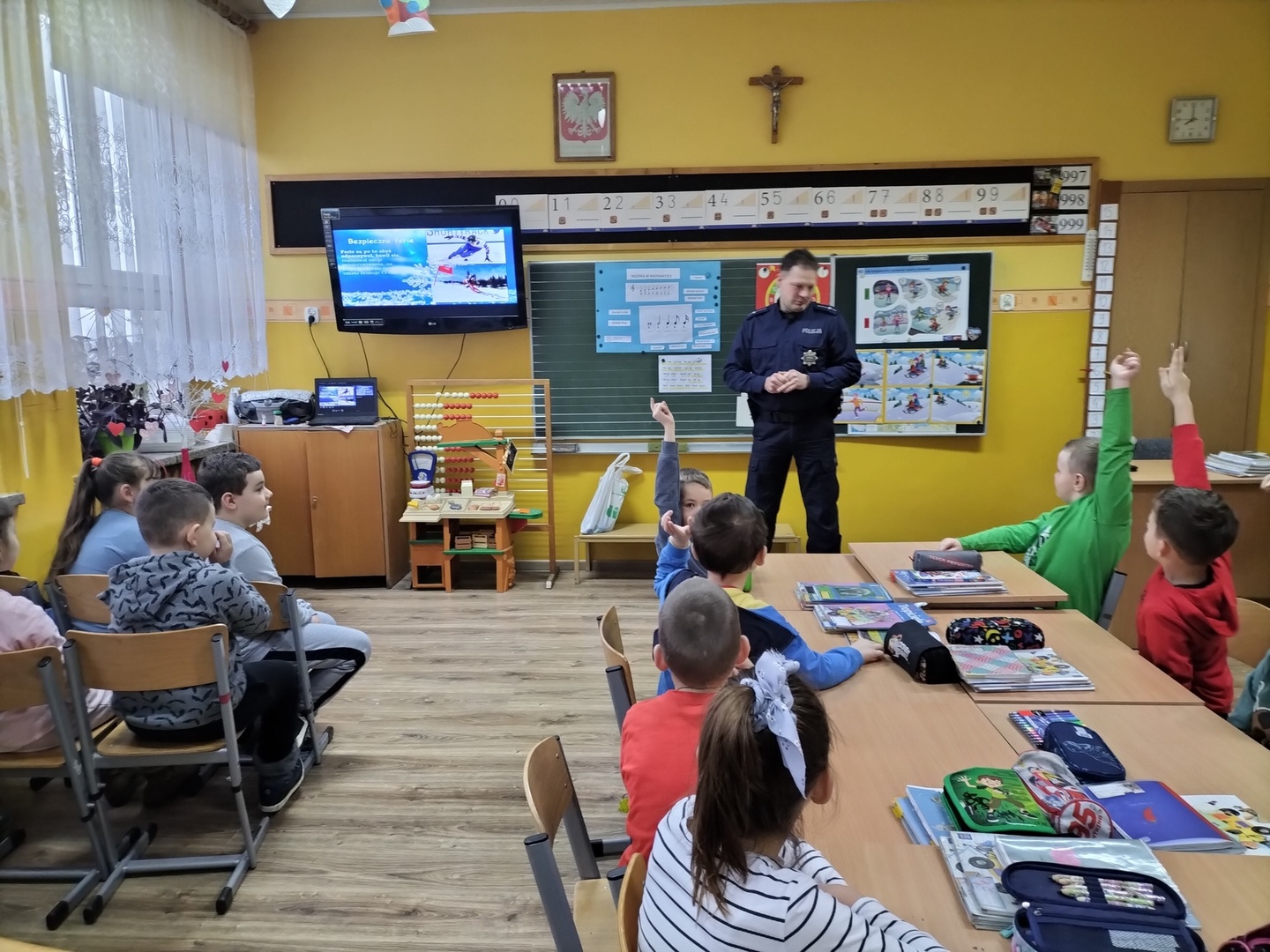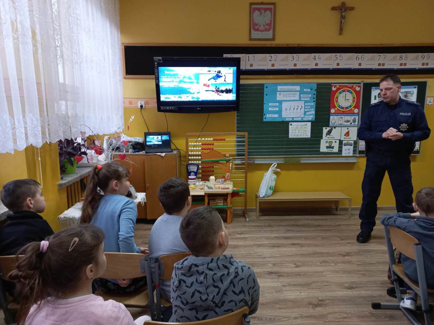 W piątek 27.01.2023 r., tuż przed feriami mł.asp. Bartosz Karwik spotkał się z uczniami klas I-IV na pogadance. Tematem spotkania były zagadnienia związane z bezpieczeństwem podczas ferii zimowych. Omówiono zasady bezpiecznych zabaw na śniegu, niebezpieczeństw związanych z wchodzeniem na lód w miejscach zabronionych oraz postepowania wobec osób nieznajomych próbujących nawiązać kontakt z dziećmi.Na zakończenie życzył wszystkim uczniom wypoczynku ibezpiecznych ferii !