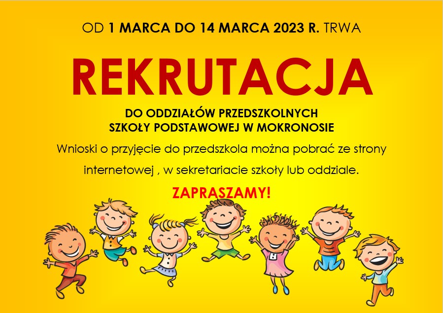 Drodzy Rodzice, uprzejmie informujemy, że w dniach 01.03 - 15.03.2023 r. trwa rekrutacja do oddziałów przedszkolnych Szkoły Podstawowej w Mokronosie na rok szkolny 2023/2024.