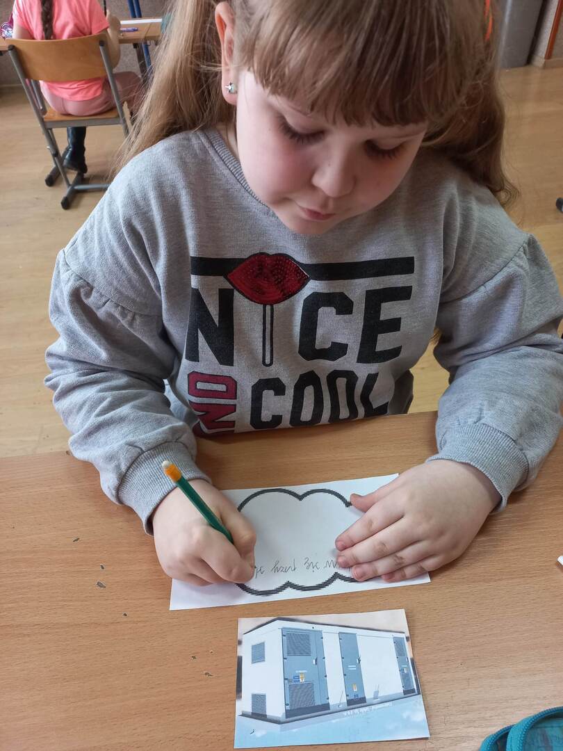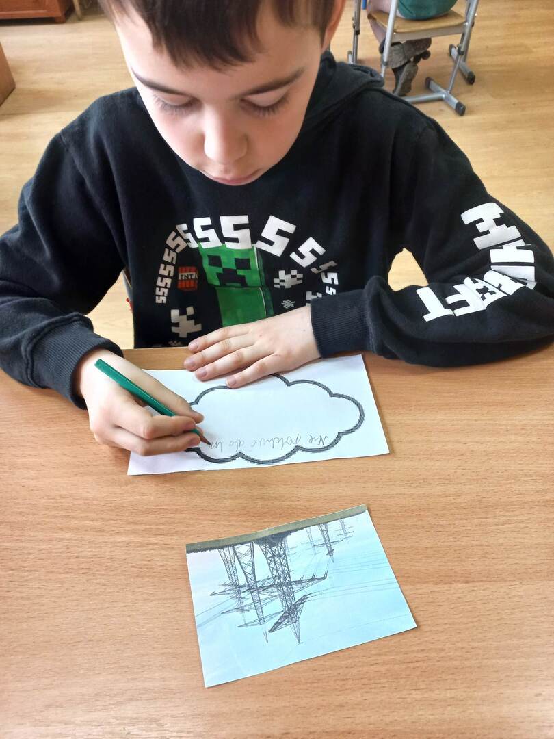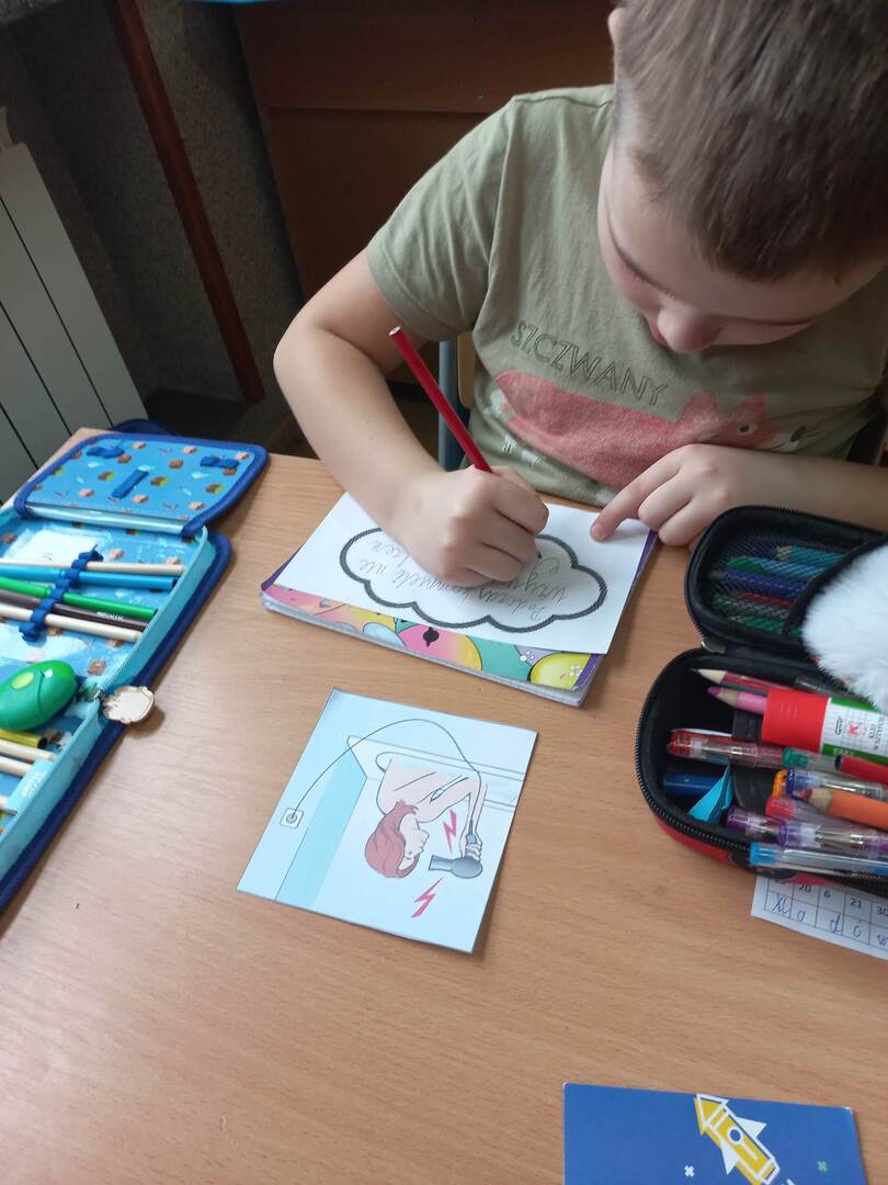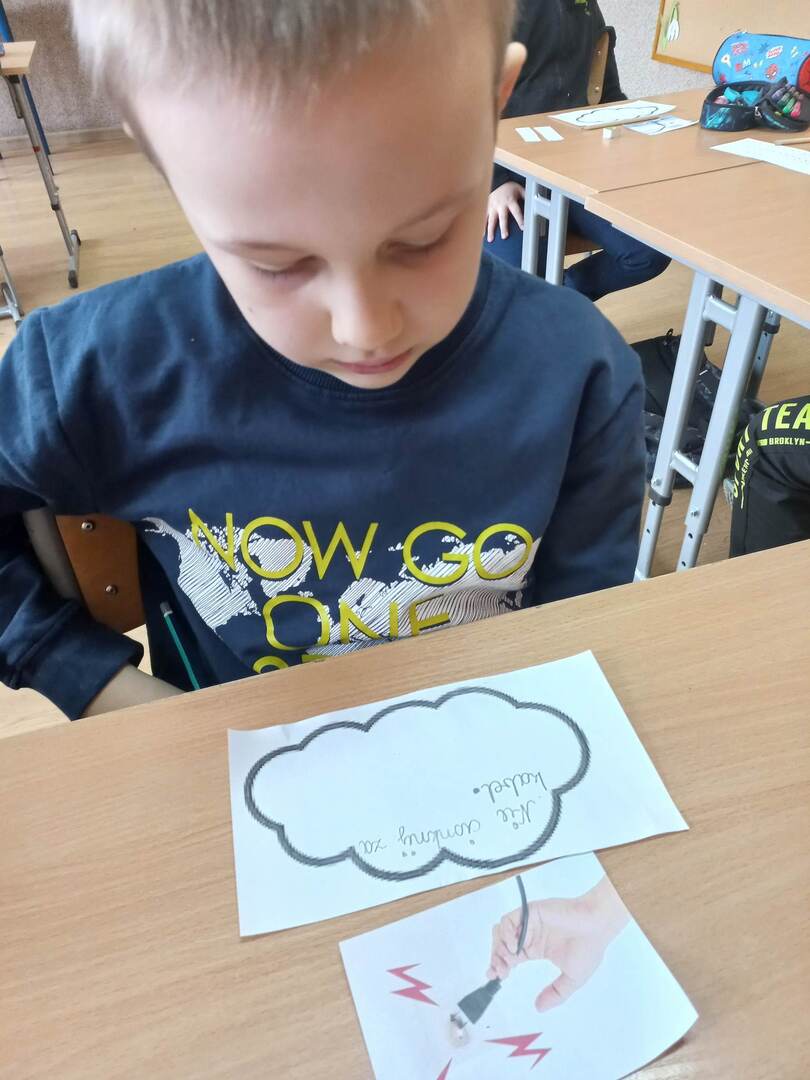 Rozpoczęliśmy od filmu edukacyjnego „Włącz ostrożność” przygotowanego przez TAURONA. Zawarte w nim scenki z udziałem dzieci oraz sugestywne komentarze miały zachęcić uczniów do bezpiecznego korzystania z urządzeń zasilanych prądem oraz właściwego obchodzenia się z infrastrukturą energetyczną. Następnie uczniowie przeszli do zadań praktycznych. W parach odkodowywali nazwy domowych urządzeń elektrycznych i opowiadali o ich przeznaczeniu. Zabawa ruchowa „Uwaga, prąd!” zmuszała uczniów do szukania bezpiecznych elementów wyposażenia będących izolatorami prądu. Kolejne wyzwanie to metoda aktywnego słuchania i wyzwanie: co zrobić w konkretnej sytuacji? Zwieńczeniem zagadnienia był wykonany grupowo plakat promujący odpowiedzialne zachowania: „Jak bezpiecznie korzystać z prądu?”; tutaj każdy uczestnik projektu układał i zapisywał hasło do wylosowanej scenki.