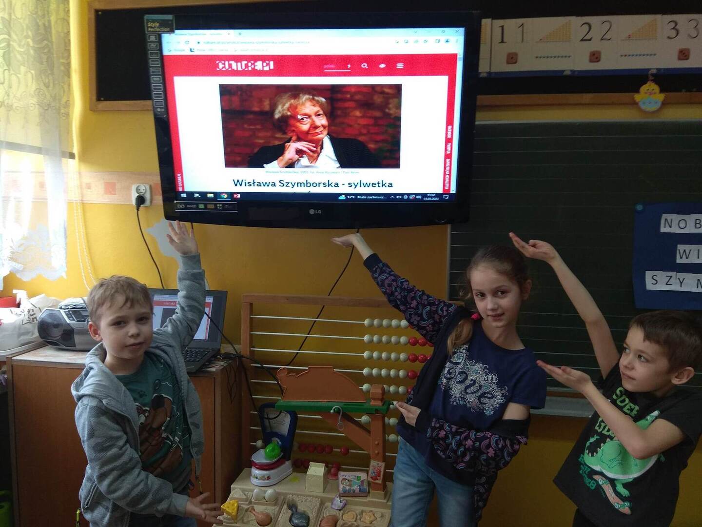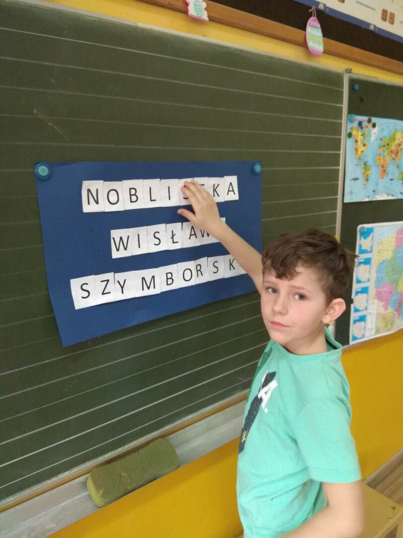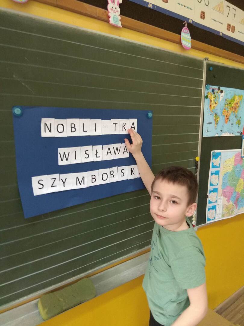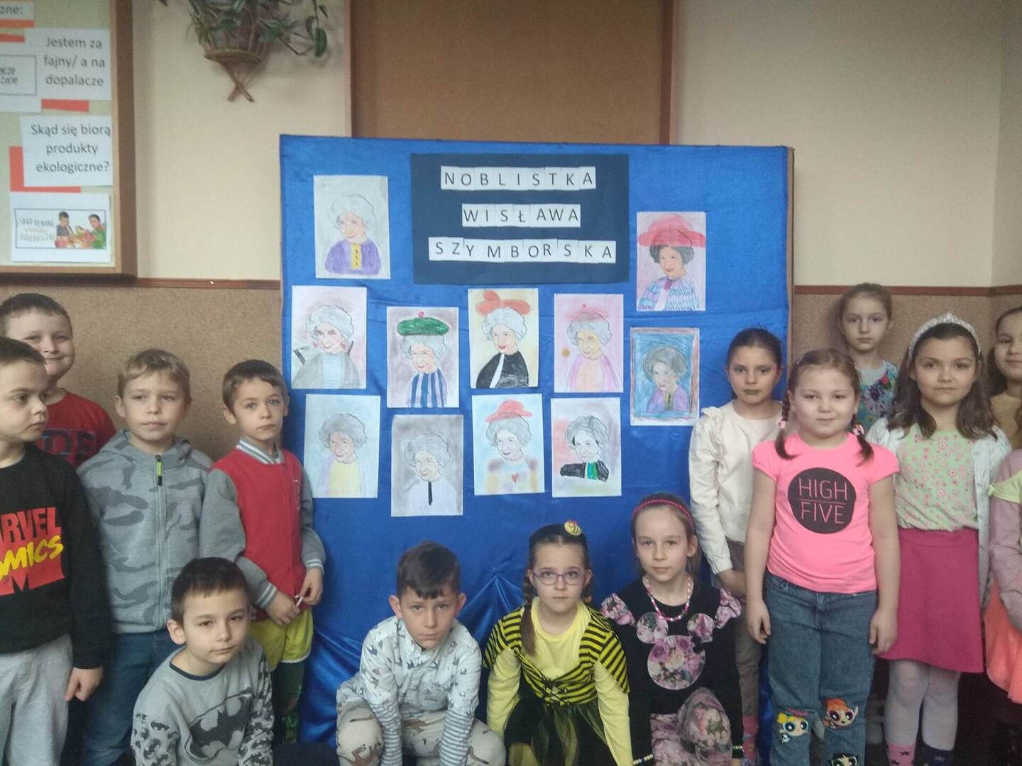Uczniowie klasy I również dołączyli do Ogólnopolskiego projektu „Mistrzyni Szymborska”. Podczas zajęć w zabawowej formie odkodowywali tajemnicze hasło, które brzmiało: Noblistka Wisława Szymborska. W dalszej części obejrzeli prezentację zawierającą ciekawostki z życia wybitnej pisarki. Na zakończenie zajęć wykonali piękne portrety znanej polskiej noblistki.