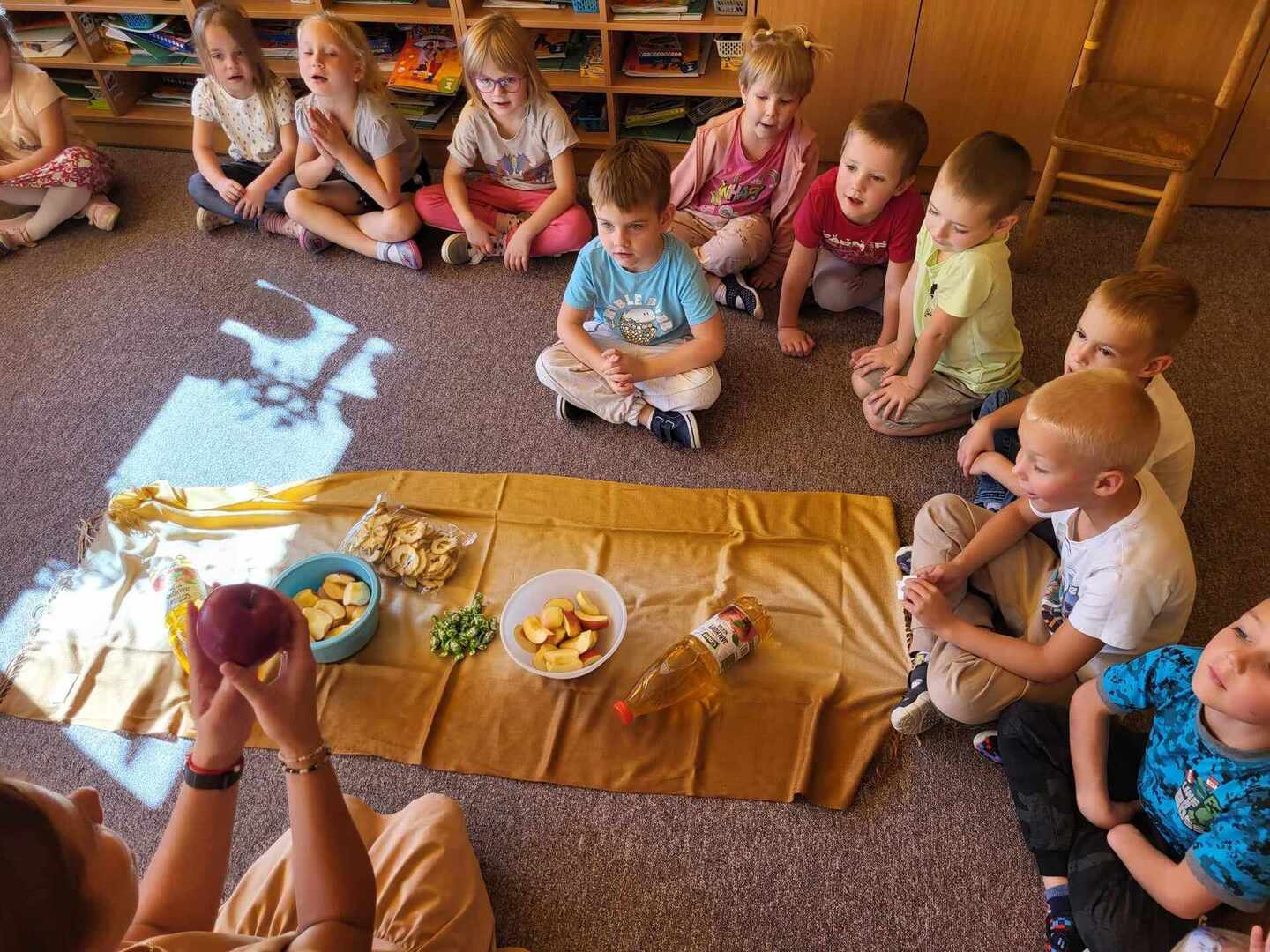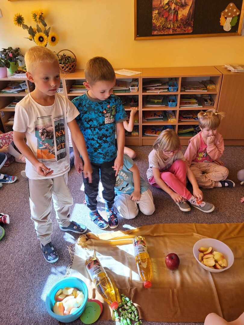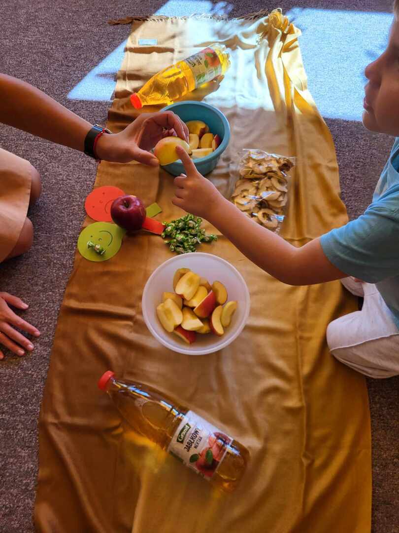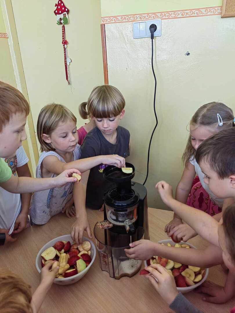 Dzieci z oddziałów przedszkolnych w dniu 28.09 delektowały się wartościami jabłka. W tym dniu zapoznano się z wszystkimi etapami rozwoju tego cennego owocu. Dzieci kosztowały pyszności, które są ukryte w różnych produktach.