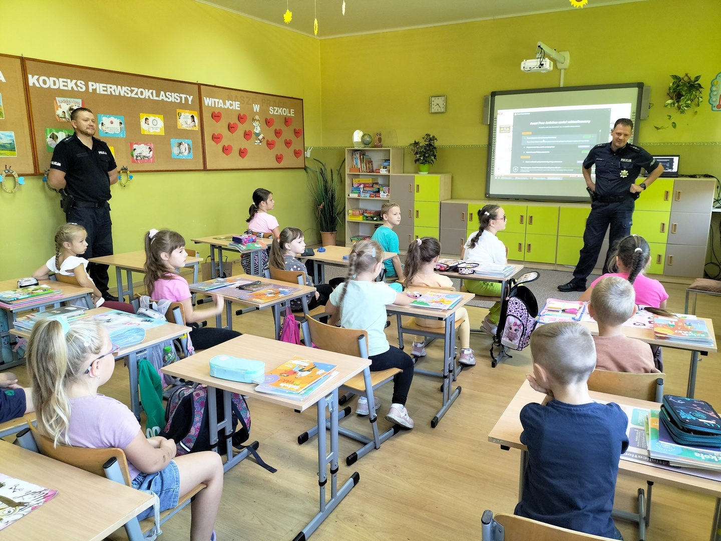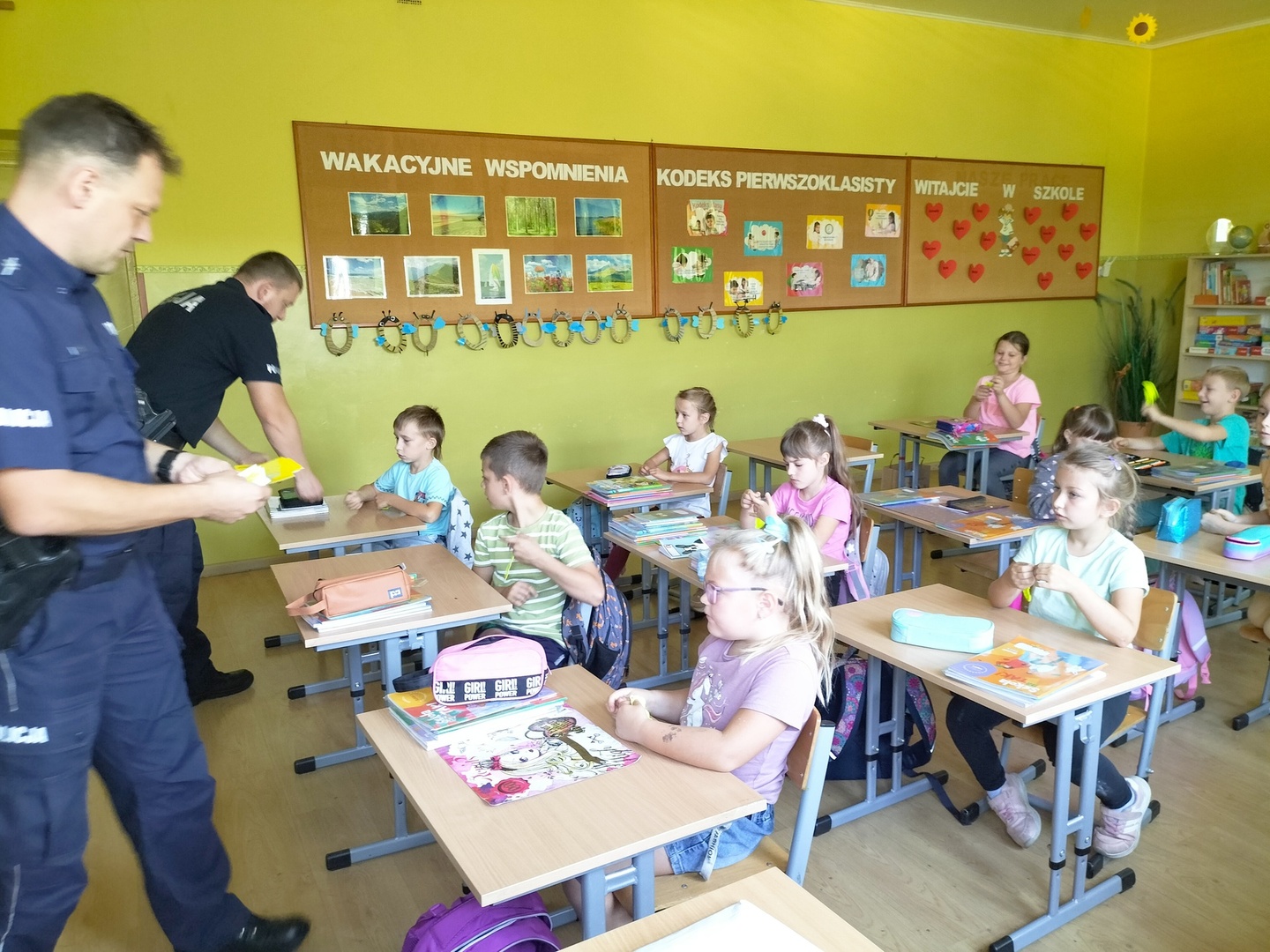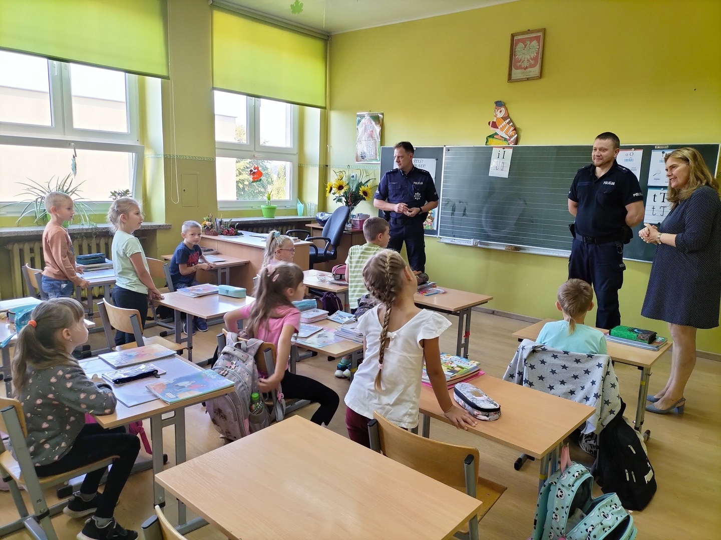 W dniu dzisiejszym naszych Pierwszaków odwiedzili asp. Bartosz Karwik oraz sierż.sztab. Damian Przybył z Komisariatu Policji w Koźminie Wielkopolskim. Funkcjonariusze przypomnieli uczniom o wszystkich zasadach bezpiecznego poruszania się na drodze, bezpieczeństwie w drodze do i ze szkoły i o tym jak ważna jest widoczność czyli noszenie odblaskowych elementów na ubraniu.