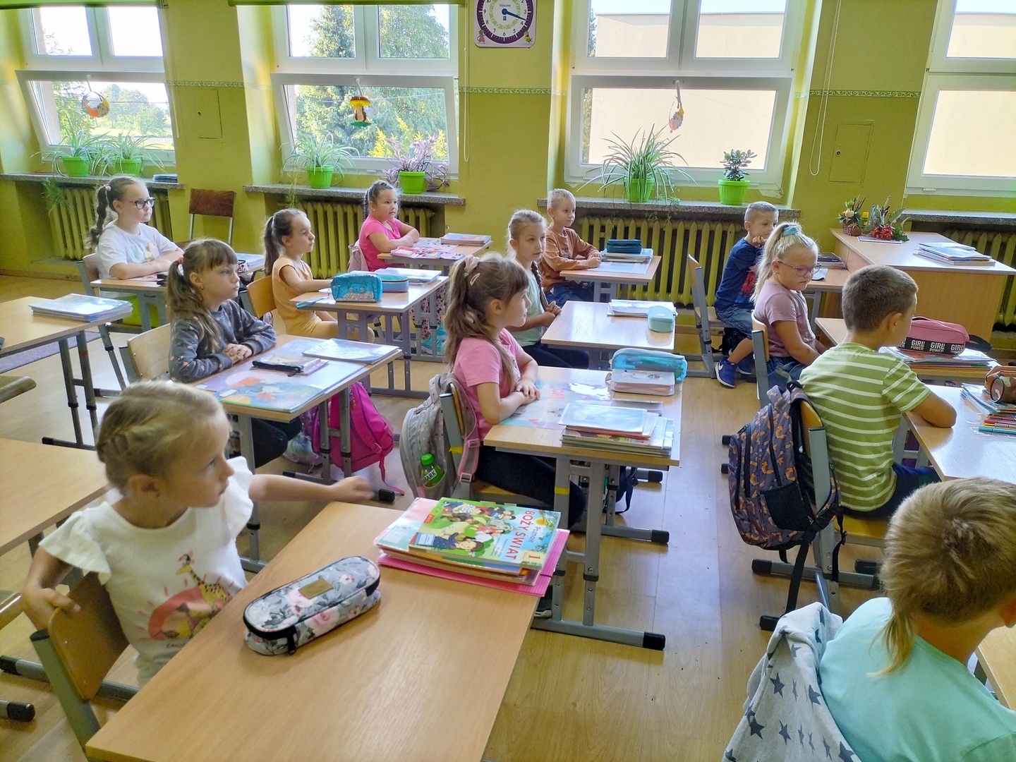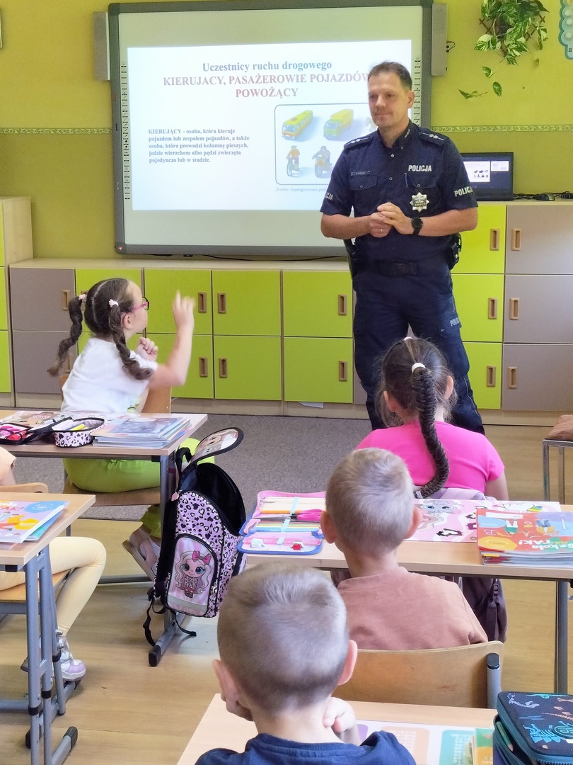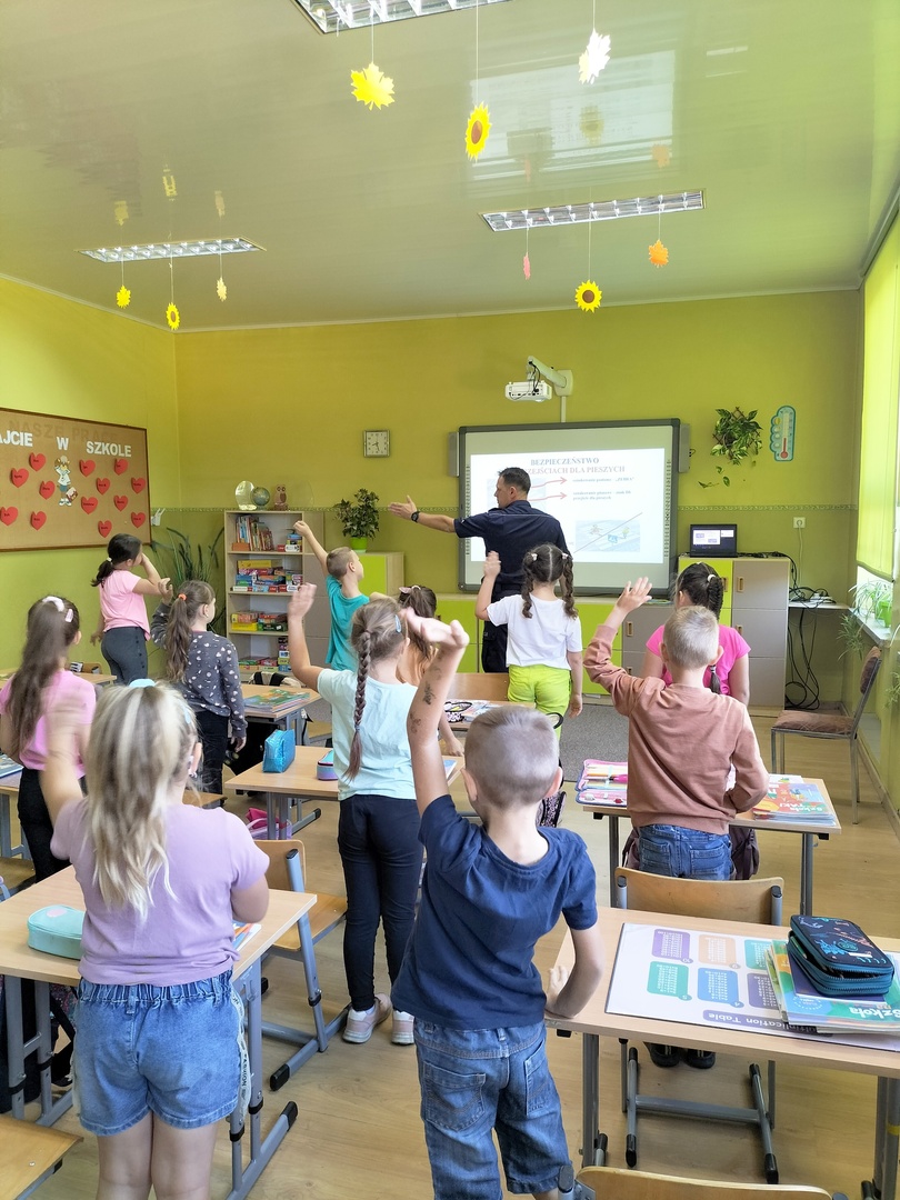 W dniu dzisiejszym naszych Pierwszaków odwiedzili asp. Bartosz Karwik oraz sierż.sztab. Damian Przybył z Komisariatu Policji w Koźminie Wielkopolskim. Funkcjonariusze przypomnieli uczniom o wszystkich zasadach bezpiecznego poruszania się na drodze, bezpieczeństwie w drodze do i ze szkoły i o tym jak ważna jest widoczność czyli noszenie odblaskowych elementów na ubraniu.