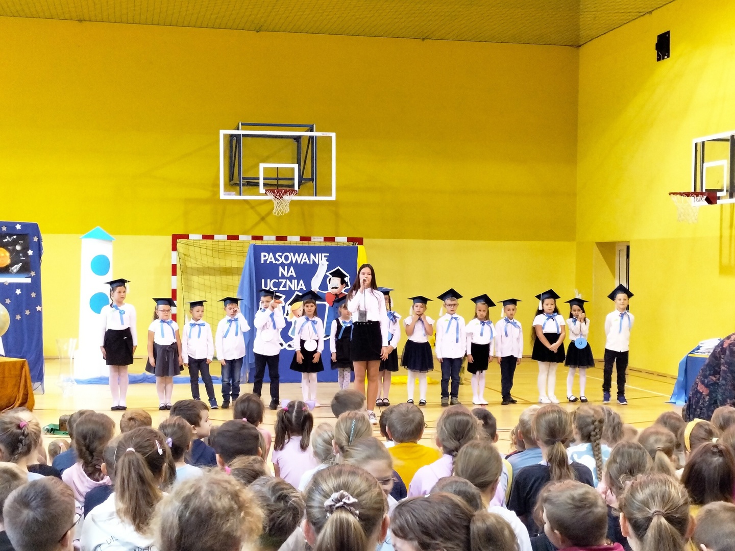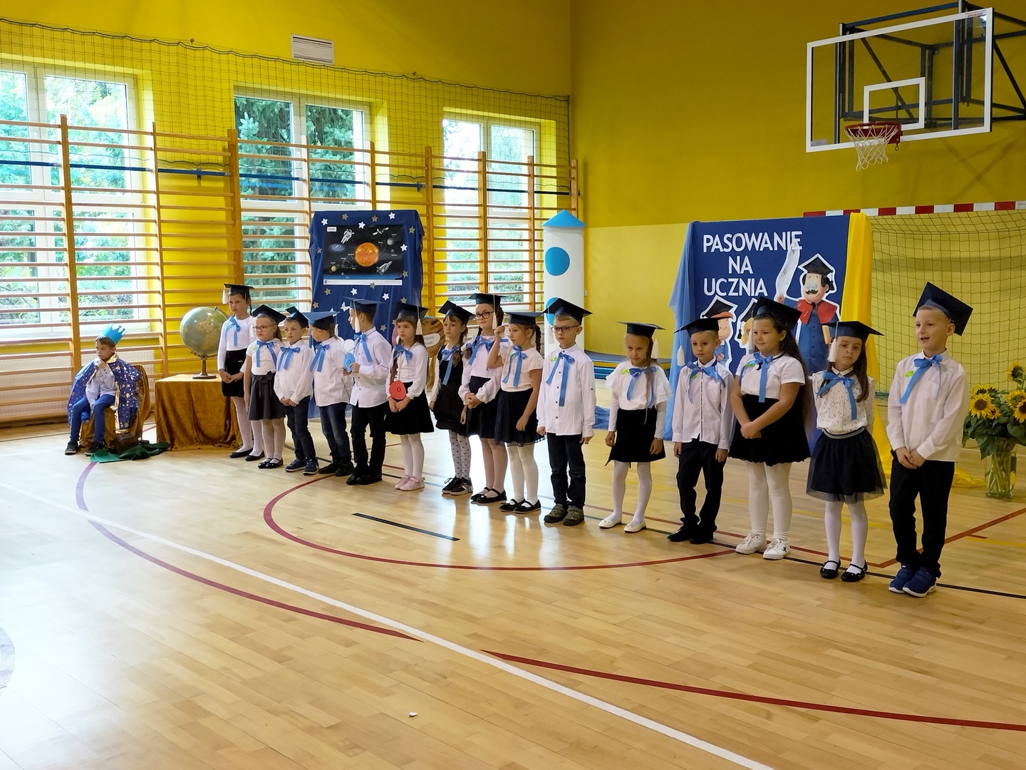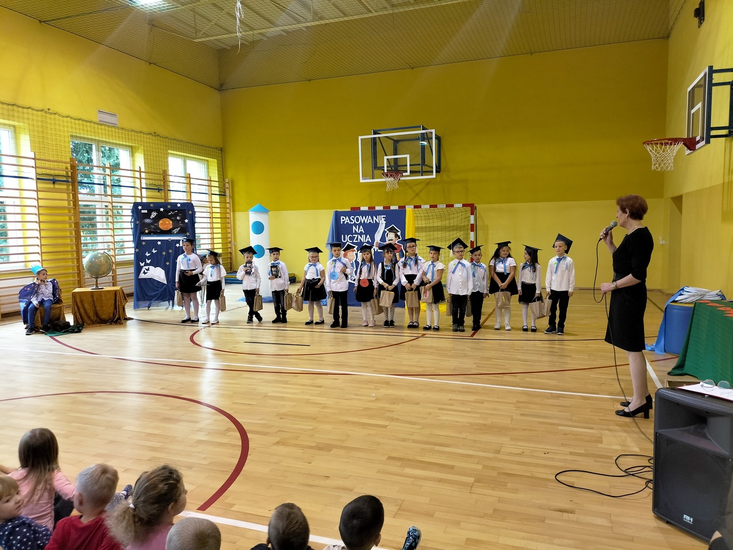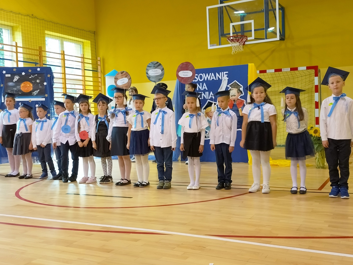 Uczniowie klasy I wyruszyli w wyjątkową, międzyplanetarną podróż w towarzystwie Małego Księcia. Kolejno przemieszczali się na planety : przyjaźni, nauki, bezpieczeństwa i sztuki. Na każdej z tych planet prezentowali swoje umiejętności i z łatwością zdobywali magiczne gwiazdki. Pani Dyrektor Alina Rączka, za pomocą symbolicznego ołówka, oficjalnie przyjęła do braci uczniowskiej - 15 dzieci z klasy I. Zwieńczeniem uroczystości był wspólny taniec "Belgijka" wraz ze starszymi kolegami i koleżankami, jako symbol tego, że pierwszoklasiści zawsze mogą liczyć na ich wsparcie i pomoc. Uroczystość zakończyła się wręczeniem upominków, pamiątkowych dyplomów pasowania oraz wspólną fotografią.