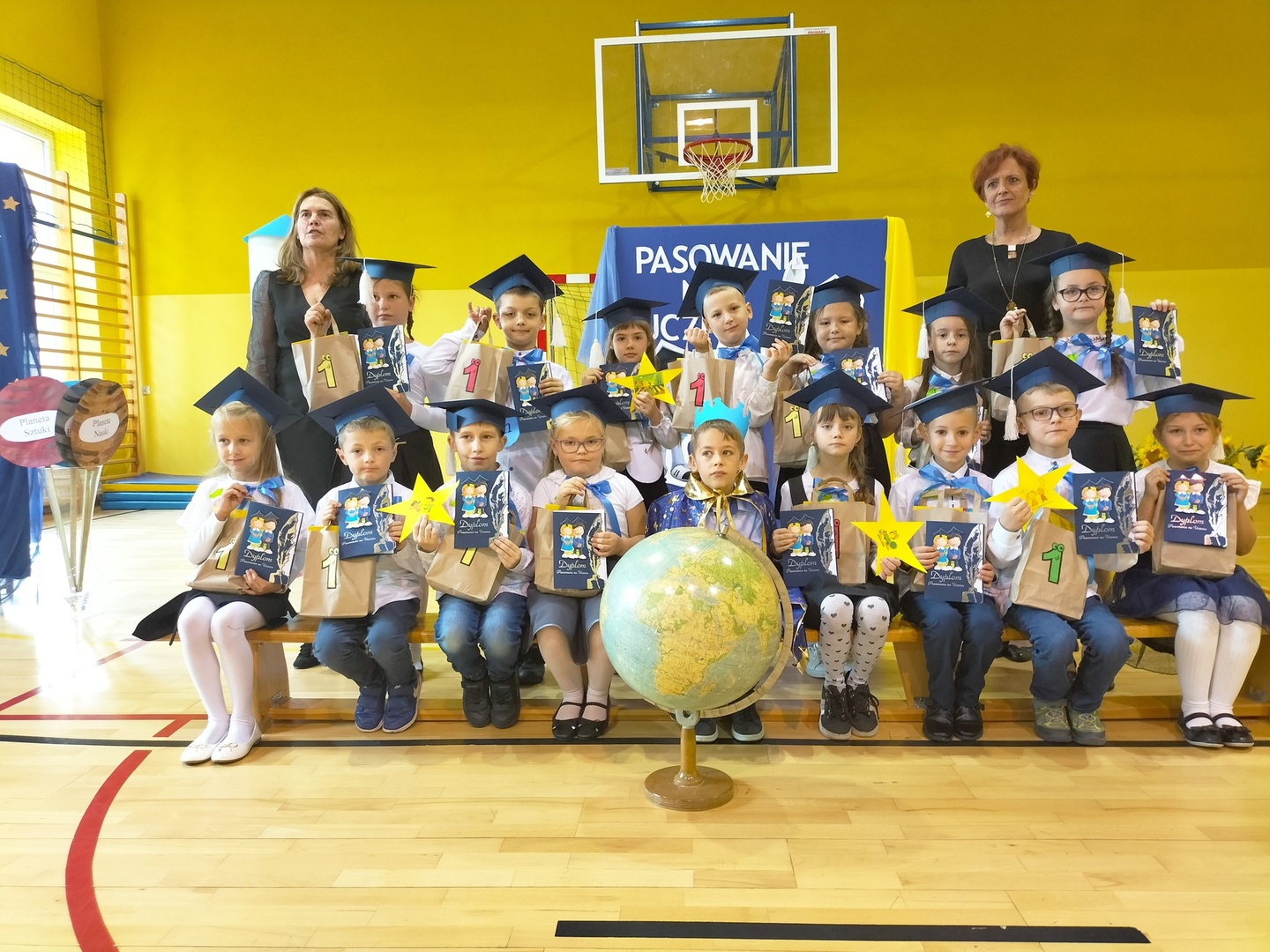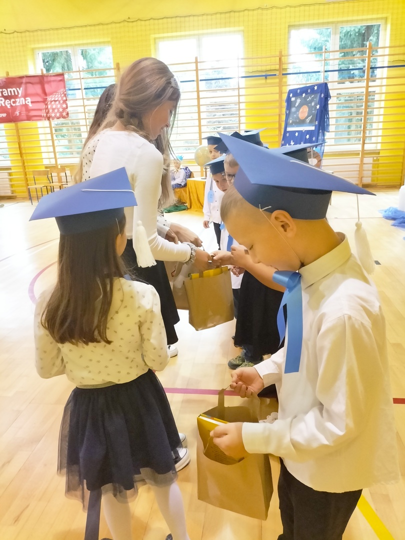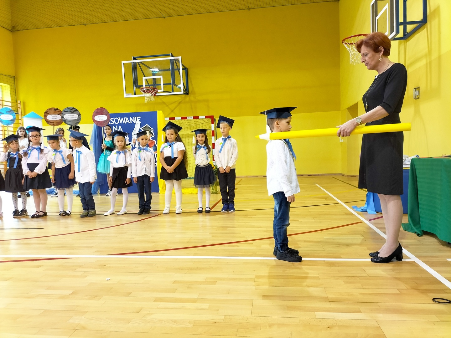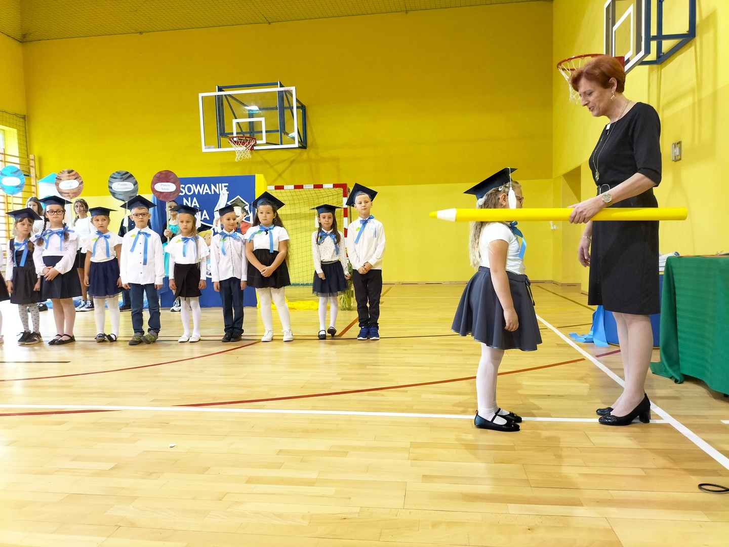 Uczniowie klasy I wyruszyli w wyjątkową, międzyplanetarną podróż w towarzystwie Małego Księcia. Kolejno przemieszczali się na planety : przyjaźni, nauki, bezpieczeństwa i sztuki. Na każdej z tych planet prezentowali swoje umiejętności i z łatwością zdobywali magiczne gwiazdki. Pani Dyrektor Alina Rączka, za pomocą symbolicznego ołówka, oficjalnie przyjęła do braci uczniowskiej - 15 dzieci z klasy I. Zwieńczeniem uroczystości był wspólny taniec "Belgijka" wraz ze starszymi kolegami i koleżankami, jako symbol tego, że pierwszoklasiści zawsze mogą liczyć na ich wsparcie i pomoc. Uroczystość zakończyła się wręczeniem upominków, pamiątkowych dyplomów pasowania oraz wspólną fotografią.
