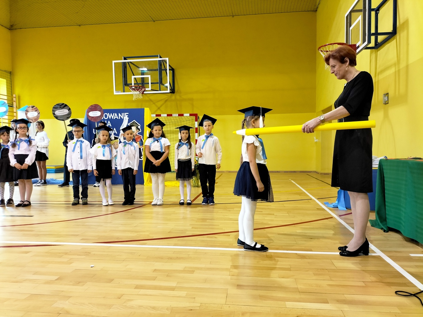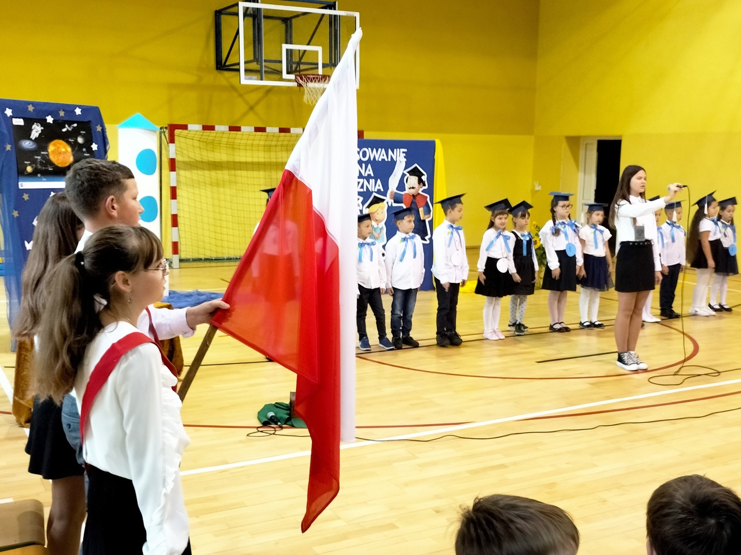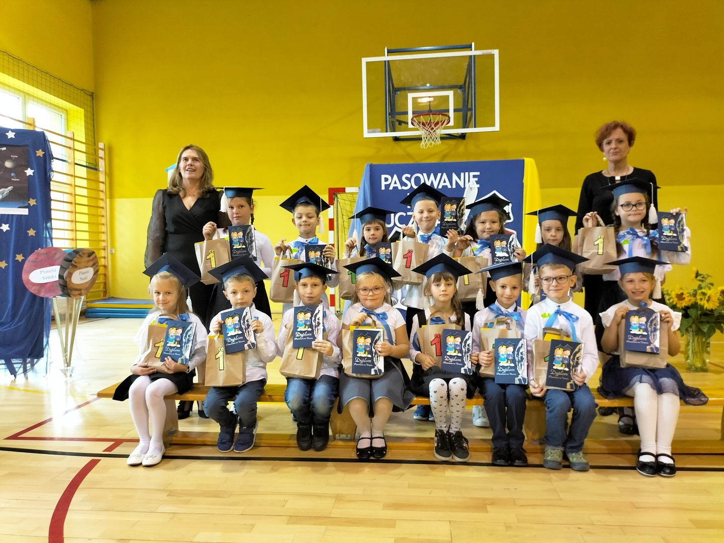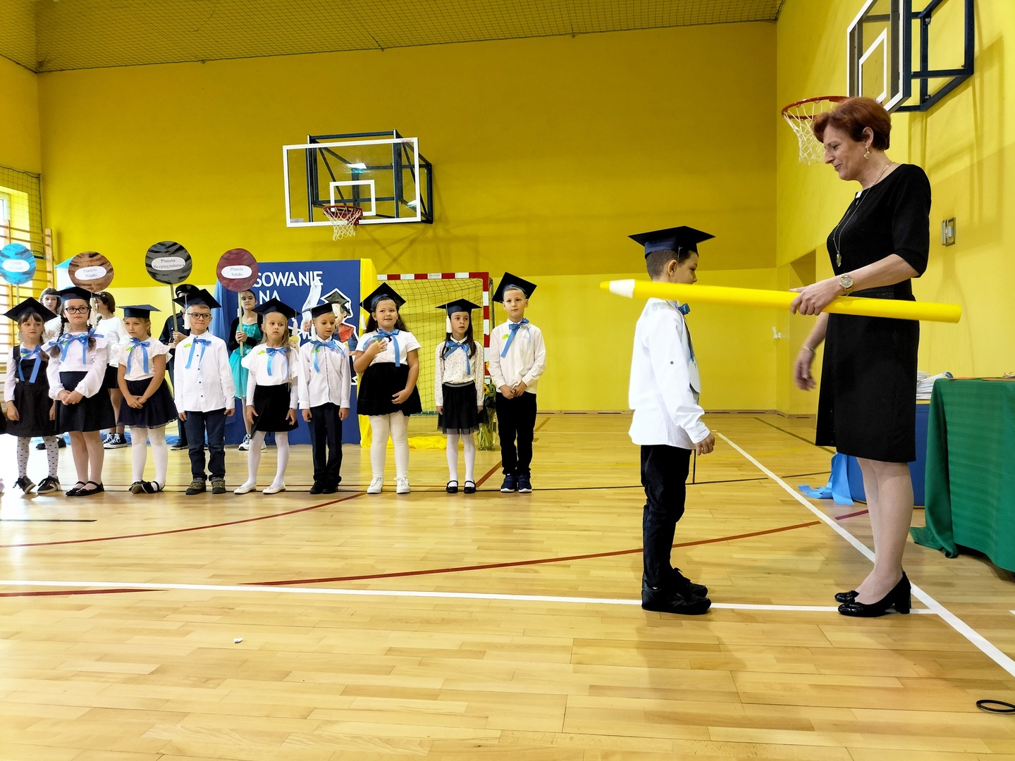 Uczniowie klasy I wyruszyli w wyjątkową, międzyplanetarną podróż w towarzystwie Małego Księcia. Kolejno przemieszczali się na planety : przyjaźni, nauki, bezpieczeństwa i sztuki. Na każdej z tych planet prezentowali swoje umiejętności i z łatwością zdobywali magiczne gwiazdki. Pani Dyrektor Alina Rączka, za pomocą symbolicznego ołówka, oficjalnie przyjęła do braci uczniowskiej - 15 dzieci z klasy I. Zwieńczeniem uroczystości był wspólny taniec "Belgijka" wraz ze starszymi kolegami i koleżankami, jako symbol tego, że pierwszoklasiści zawsze mogą liczyć na ich wsparcie i pomoc. Uroczystość zakończyła się wręczeniem upominków, pamiątkowych dyplomów pasowania oraz wspólną fotografią.