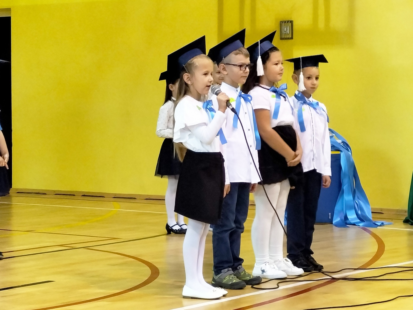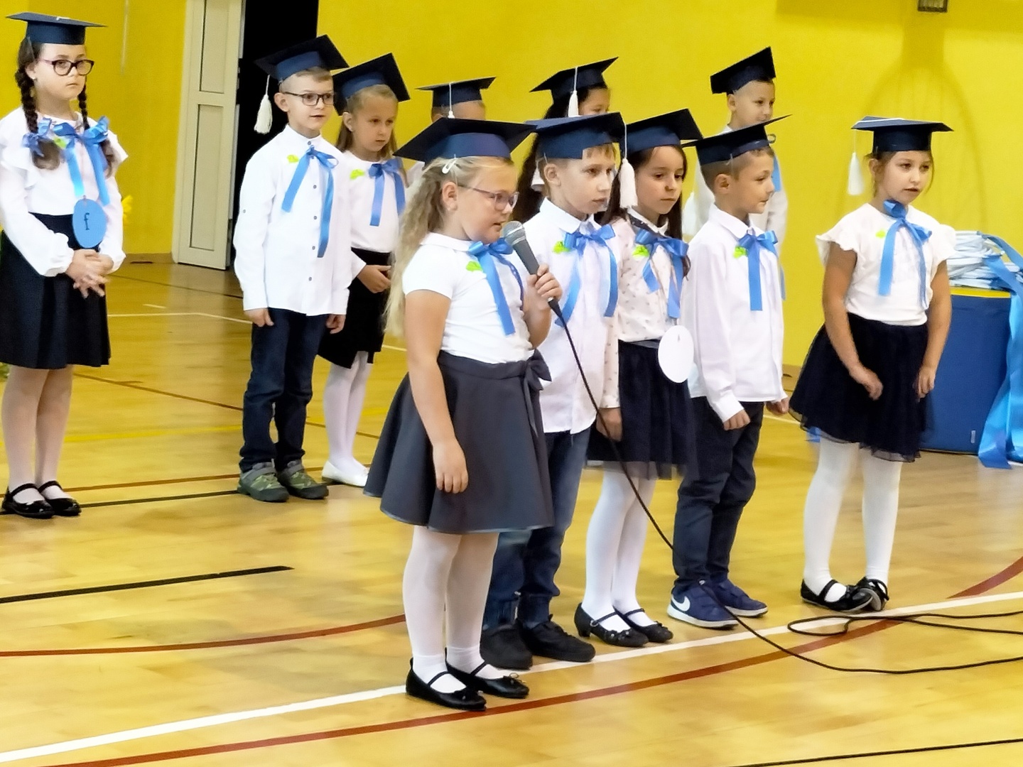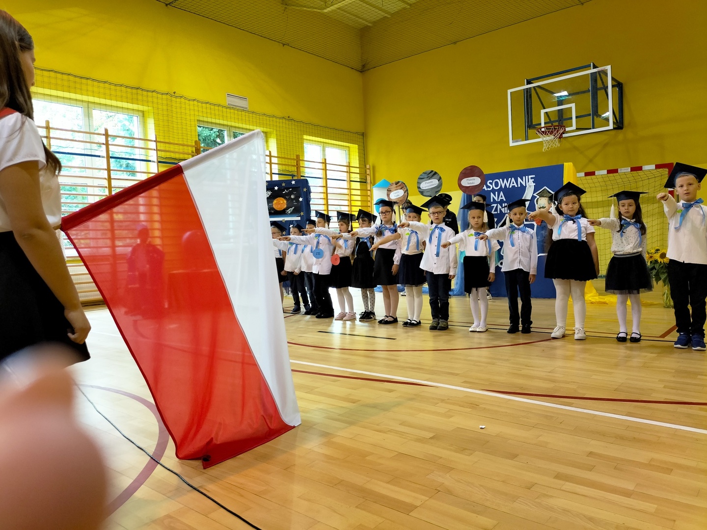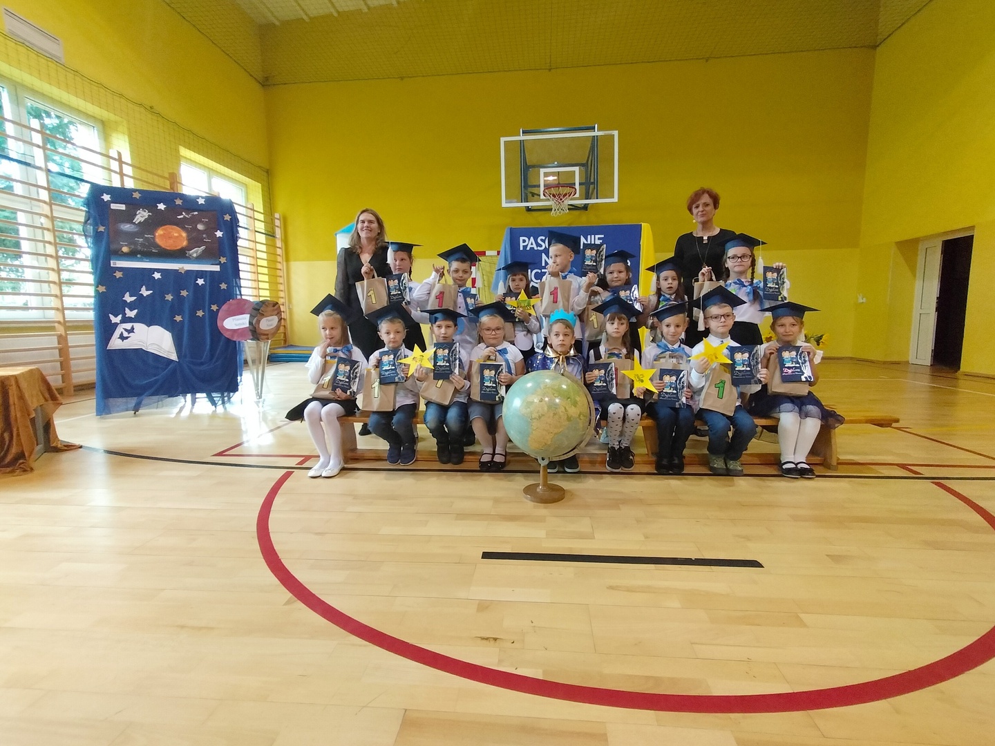 Uczniowie klasy I wyruszyli w wyjątkową, międzyplanetarną podróż w towarzystwie Małego Księcia. Kolejno przemieszczali się na planety : przyjaźni, nauki, bezpieczeństwa i sztuki. Na każdej z tych planet prezentowali swoje umiejętności i z łatwością zdobywali magiczne gwiazdki. Pani Dyrektor Alina Rączka, za pomocą symbolicznego ołówka, oficjalnie przyjęła do braci uczniowskiej - 15 dzieci z klasy I. Zwieńczeniem uroczystości był wspólny taniec "Belgijka" wraz ze starszymi kolegami i koleżankami, jako symbol tego, że pierwszoklasiści zawsze mogą liczyć na ich wsparcie i pomoc. Uroczystość zakończyła się wręczeniem upominków, pamiątkowych dyplomów pasowania oraz wspólną fotografią.