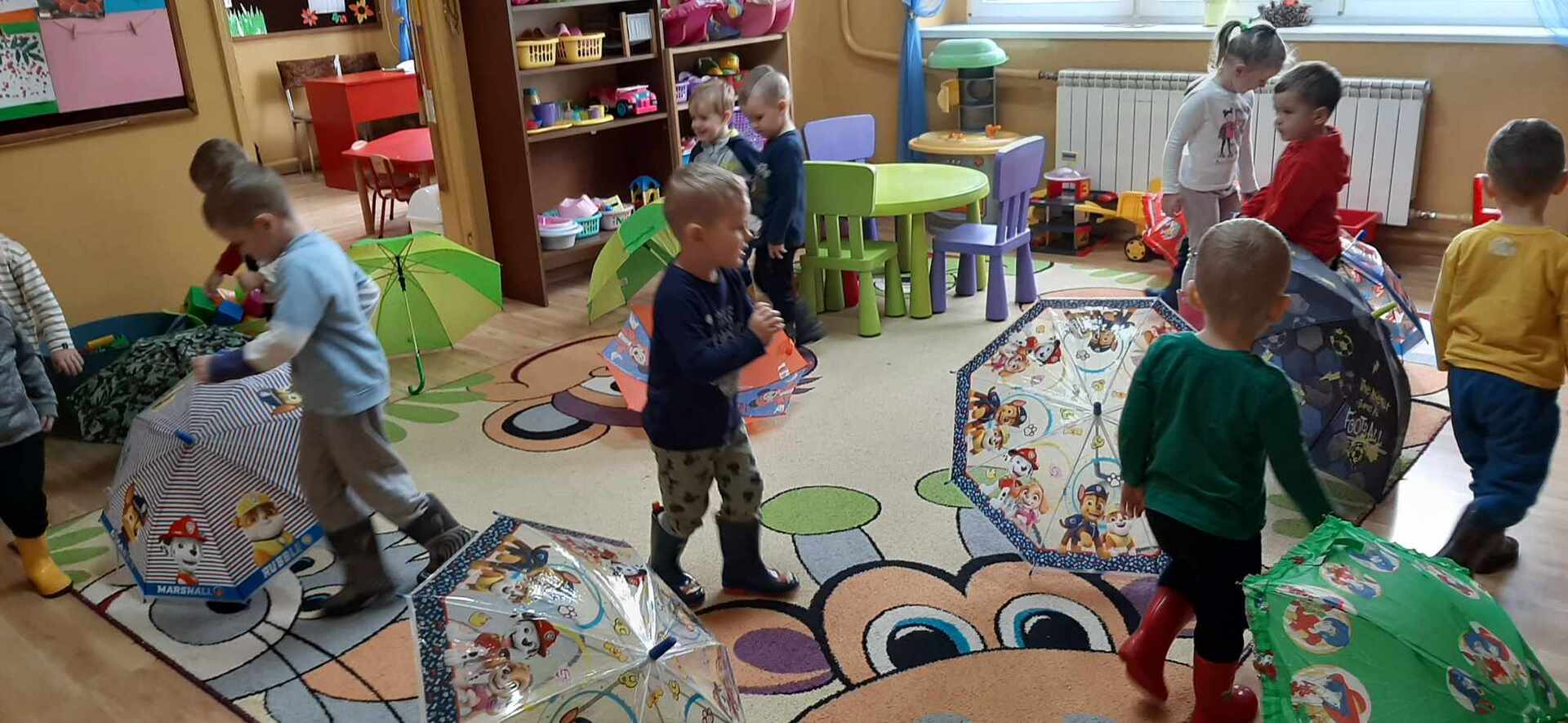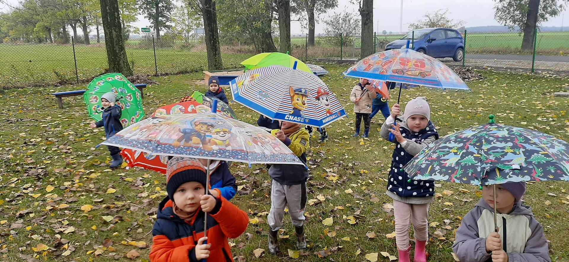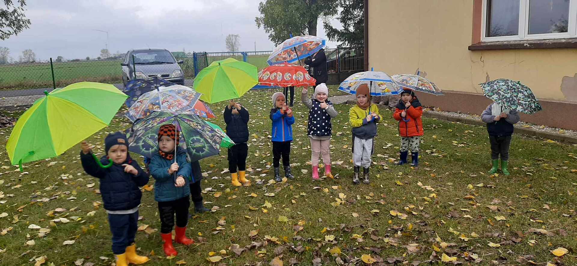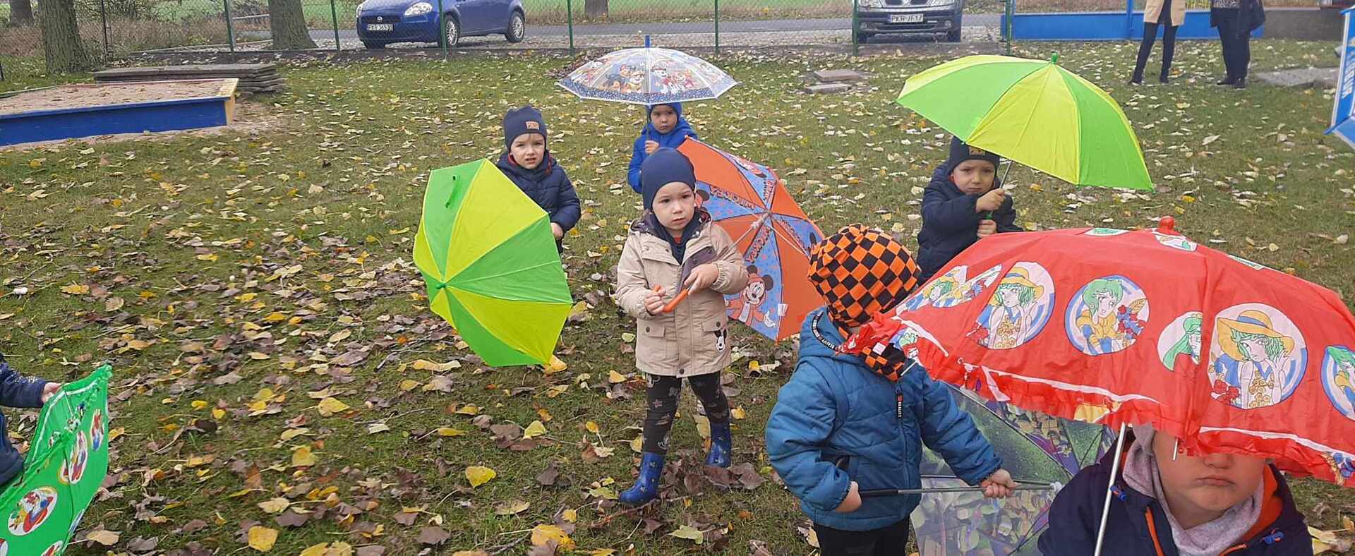 Nie nudzą się na pewno przedszkolaki z Wrotkowa, które znają świetne sposoby na spędzanie wolnego czasu kiedy za oknami brzydka, jesienna pogoda. Z parasolami można potańczyć i pobawić się w sali, można też poskakać w wymyślonych kałużach. A kiedy wie się jaki strój jest odpowiedni na deszczową pogodę to żadna plucha nam nie straszna. I można nawet zaliczyć super kolorowy, jesienny spacer.