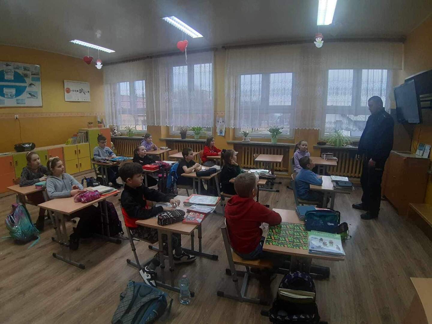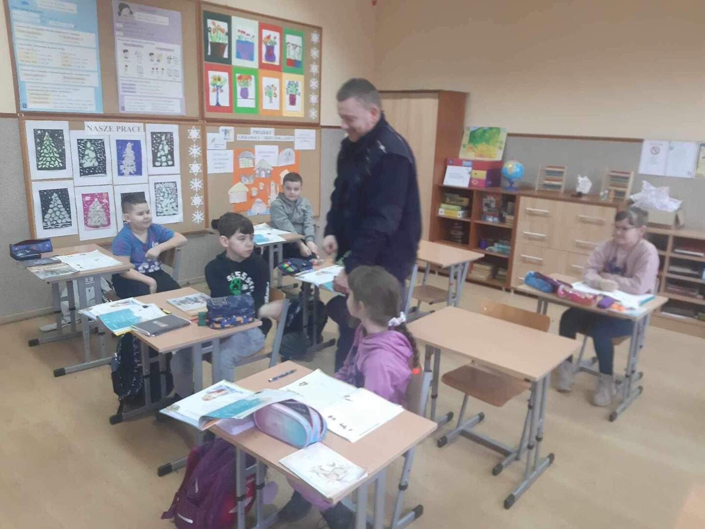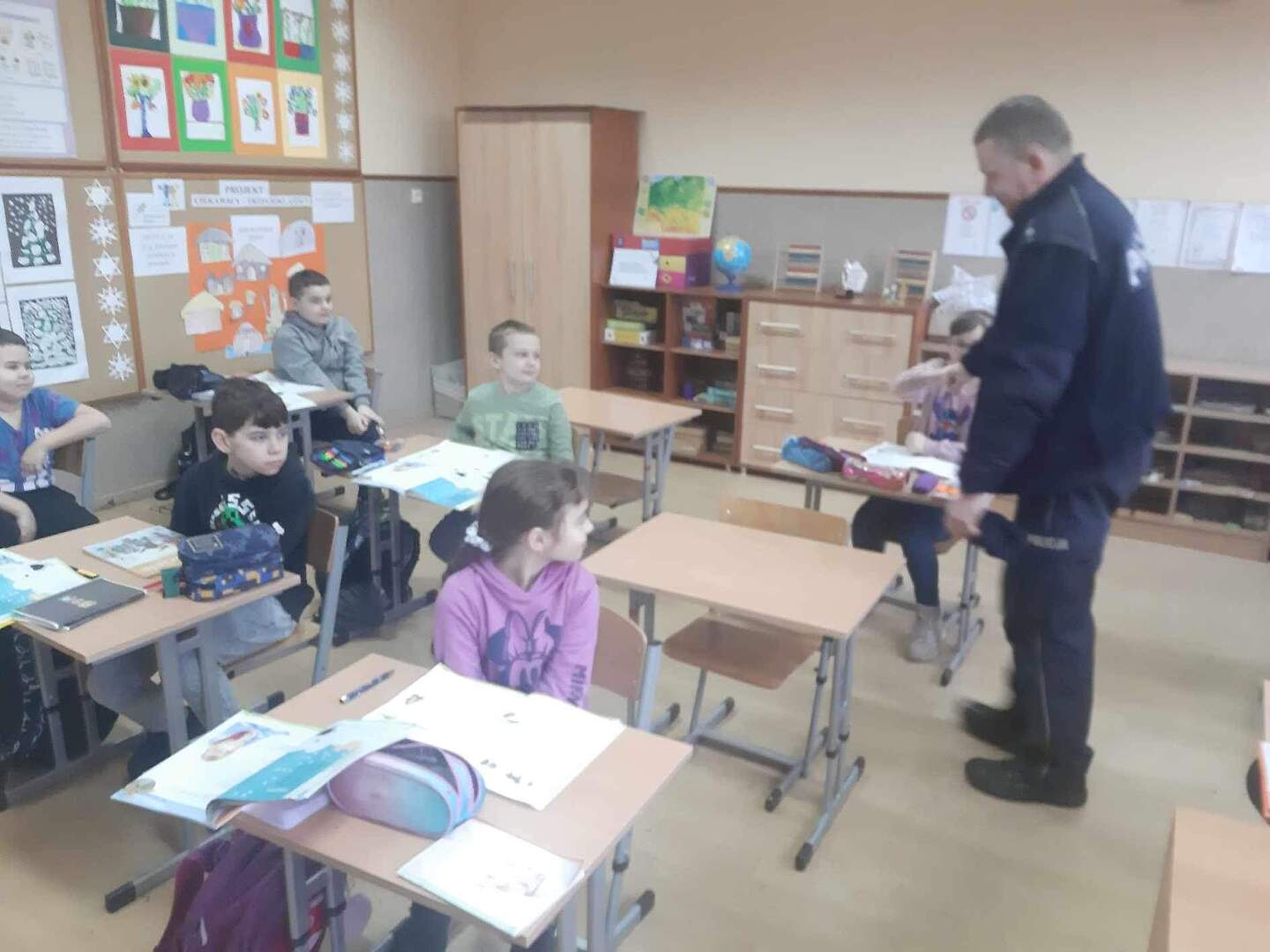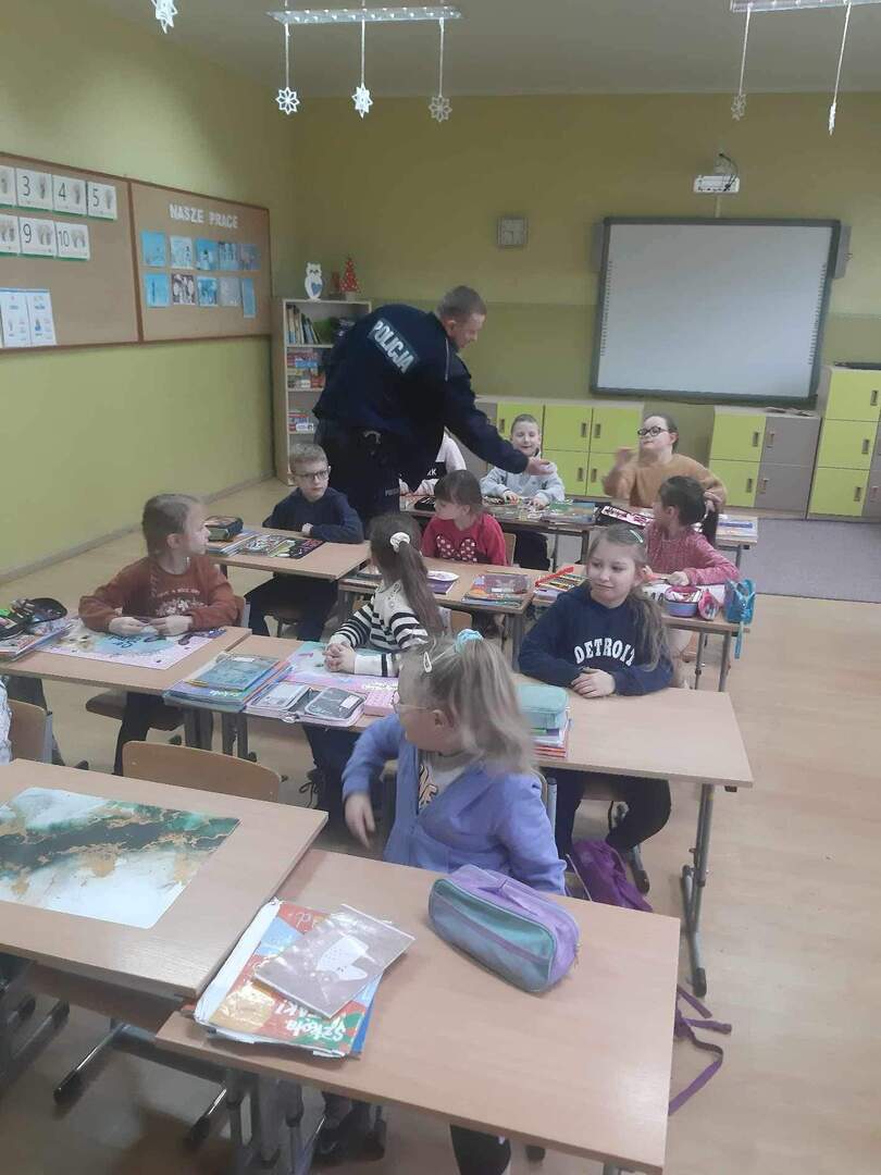 Dbając o bezpieczeństwo naszych najmłodszych uczniów w czasie zbliżających się ferii zimowych, w zeszłym tygodniu odbyły się spotkania z dzielnicowym mł. asp. panem Damianem Przybyłem dla dzieci z oddziałów przedszkolnych oraz uczniów kl. I-V. Podczas prelekcji policjant przypomniał o zagrożeniach mogących pojawić się w trakcie ferii. Szczególnie skupił się na omówieniu zasad bezpieczeństwa podczas uprawiania sportów zimowych oraz gier i zabaw na świeżym powietrzu. Zwrócił on szczególną uwagę na unikanie wchodzenia na zamarznięte zbiorniki wodne. Przestrzegał przed zjeżdżaniem na sankach z górki w pobliżu jezdni. Przypomniał zasady postępowania wobec nieznajomej osoby: „Nie rozmawiaj...", „Nie ufaj...", „Nie wpuszczaj do domu...”, ale również uświadomili dzieciom do kogo mogą zwrócić się o pomoc w przypadku zgubienia się w obcym miejscu. Udzielił wskazówek, jak korzystać z Internetu, a przede wszystkim przypomniał o ograniczeniu czasu używaniu laptopa/komputera, telewizora, i telefonu! Ważnym elementem spotkania była także rozmowa o przestrzeganiu zasad poruszania się po drogach, szczególnie po zmroku, kiedy niezbędne stają się elementy odblaskowe.