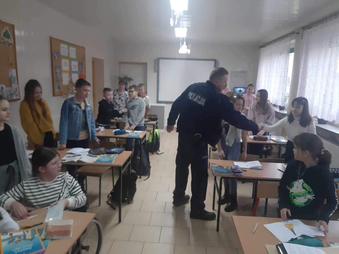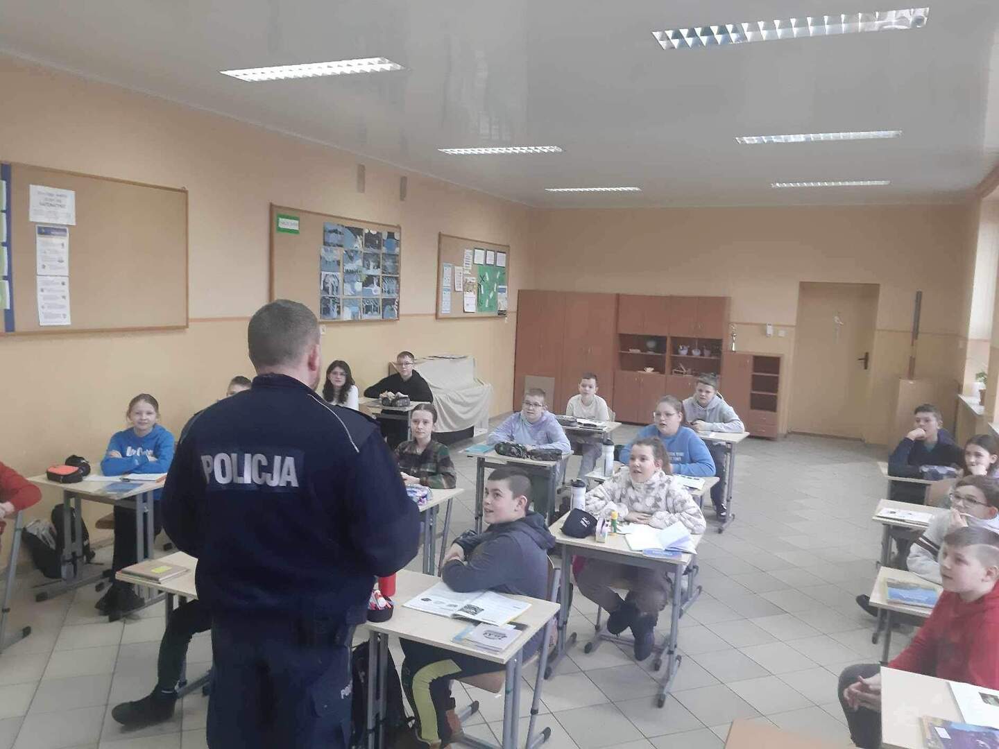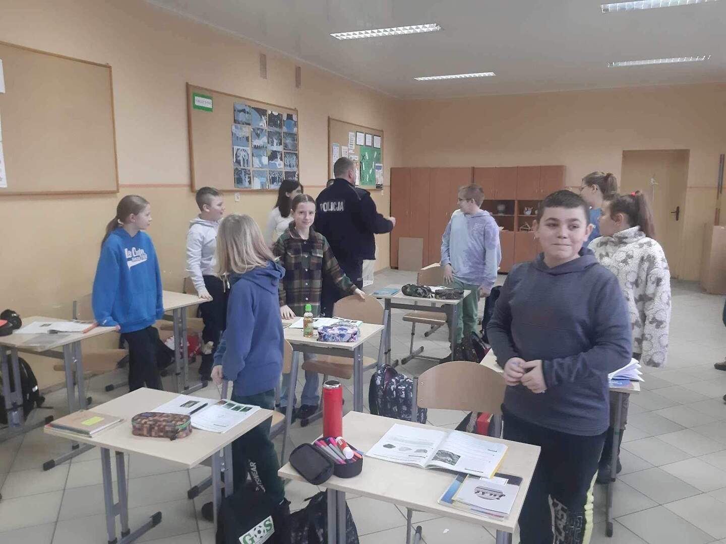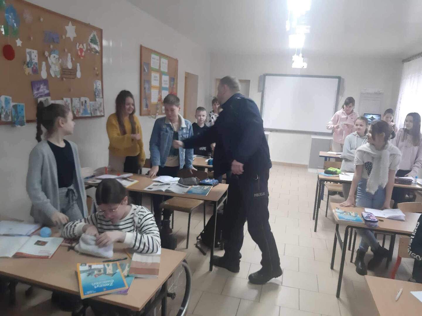 Dbając o bezpieczeństwo naszych najmłodszych uczniów w czasie zbliżających się ferii zimowych, w zeszłym tygodniu odbyły się spotkania z dzielnicowym mł. asp. panem Damianem Przybyłem dla dzieci z oddziałów przedszkolnych oraz uczniów kl. I-V. Podczas prelekcji policjant przypomniał o zagrożeniach mogących pojawić się w trakcie ferii. Szczególnie skupił się na omówieniu zasad bezpieczeństwa podczas uprawiania sportów zimowych oraz gier i zabaw na świeżym powietrzu. Zwrócił on szczególną uwagę na unikanie wchodzenia na zamarznięte zbiorniki wodne. Przestrzegał przed zjeżdżaniem na sankach z górki w pobliżu jezdni. Przypomniał zasady postępowania wobec nieznajomej osoby: „Nie rozmawiaj...", „Nie ufaj...", „Nie wpuszczaj do domu...”, ale również uświadomili dzieciom do kogo mogą zwrócić się o pomoc w przypadku zgubienia się w obcym miejscu. Udzielił wskazówek, jak korzystać z Internetu, a przede wszystkim przypomniał o ograniczeniu czasu używaniu laptopa/komputera, telewizora, i telefonu! Ważnym elementem spotkania była także rozmowa o przestrzeganiu zasad poruszania się po drogach, szczególnie po zmroku, kiedy niezbędne stają się elementy odblaskowe.