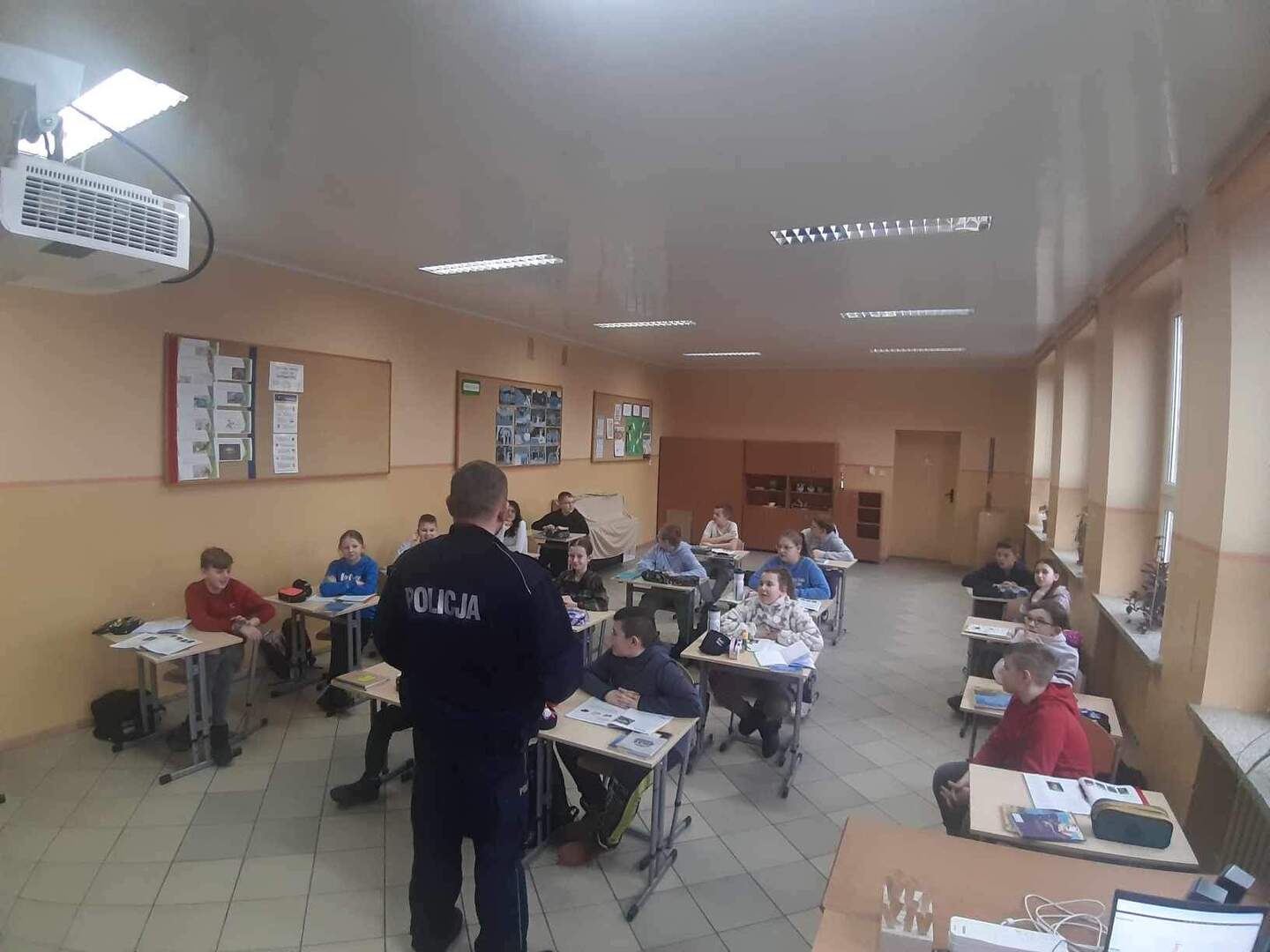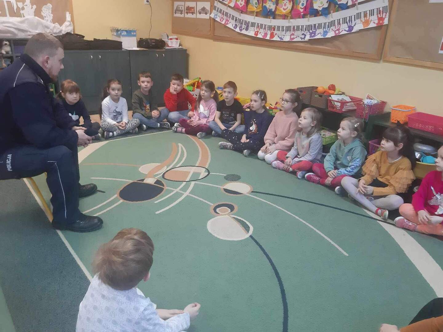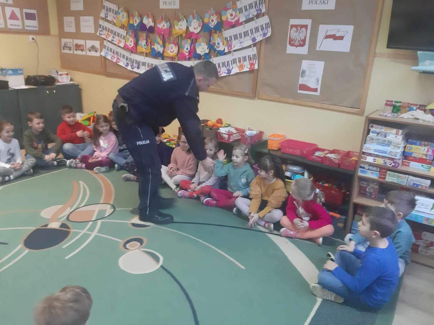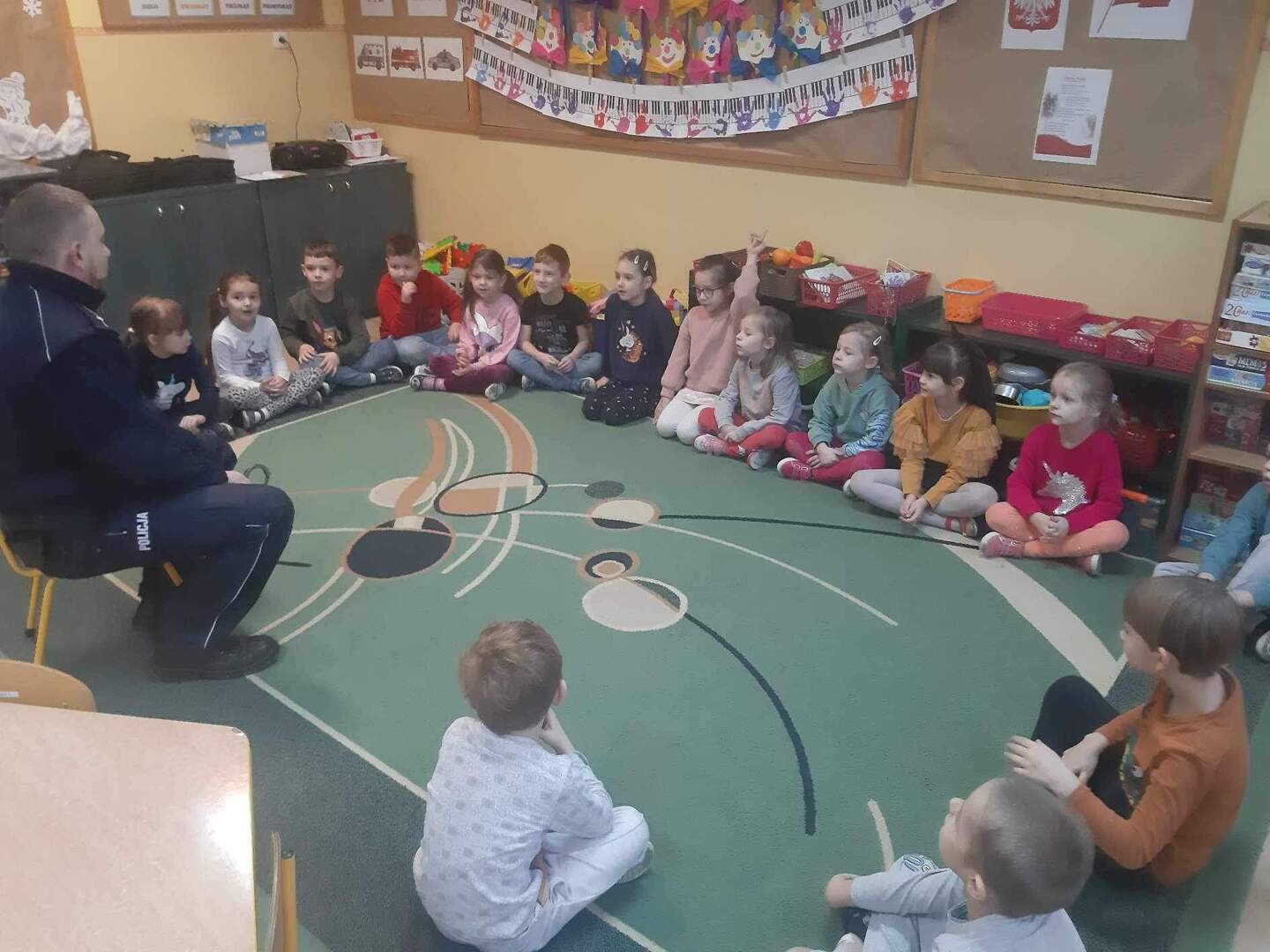Dbając o bezpieczeństwo naszych najmłodszych uczniów w czasie zbliżających się ferii zimowych, w zeszłym tygodniu odbyły się spotkania z dzielnicowym mł. asp. panem Damianem Przybyłem dla dzieci z oddziałów przedszkolnych oraz uczniów kl. I-V. Podczas prelekcji policjant przypomniał o zagrożeniach mogących pojawić się w trakcie ferii. Szczególnie skupił się na omówieniu zasad bezpieczeństwa podczas uprawiania sportów zimowych oraz gier i zabaw na świeżym powietrzu. Zwrócił on szczególną uwagę na unikanie wchodzenia na zamarznięte zbiorniki wodne. Przestrzegał przed zjeżdżaniem na sankach z górki w pobliżu jezdni. Przypomniał zasady postępowania wobec nieznajomej osoby: „Nie rozmawiaj...", „Nie ufaj...", „Nie wpuszczaj do domu...”, ale również uświadomili dzieciom do kogo mogą zwrócić się o pomoc w przypadku zgubienia się w obcym miejscu. Udzielił wskazówek, jak korzystać z Internetu, a przede wszystkim przypomniał o ograniczeniu czasu używaniu laptopa/komputera, telewizora, i telefonu! Ważnym elementem spotkania była także rozmowa o przestrzeganiu zasad poruszania się po drogach, szczególnie po zmroku, kiedy niezbędne stają się elementy odblaskowe.