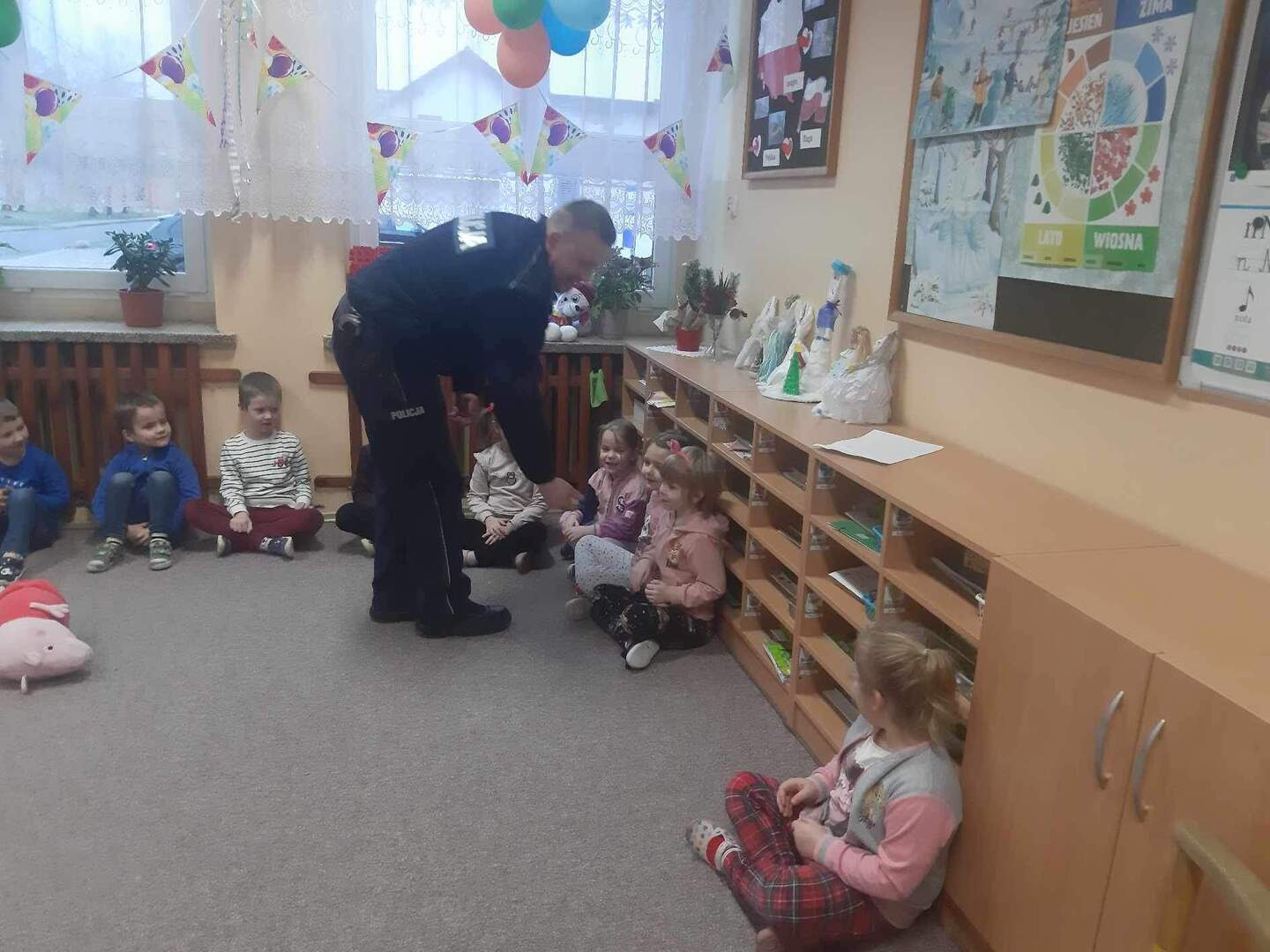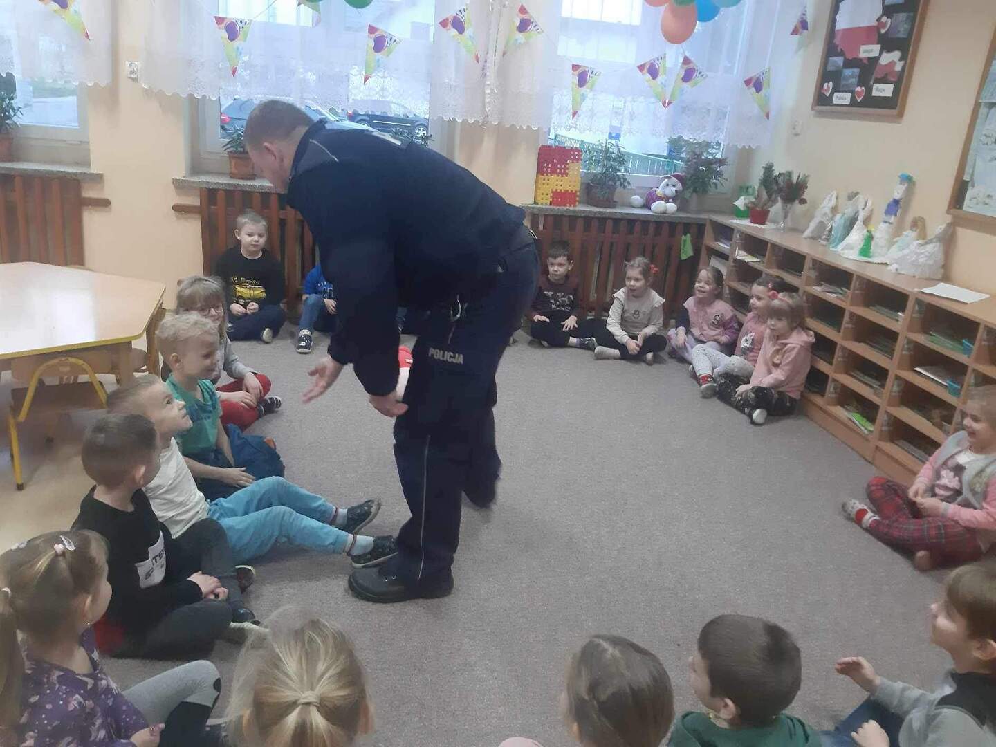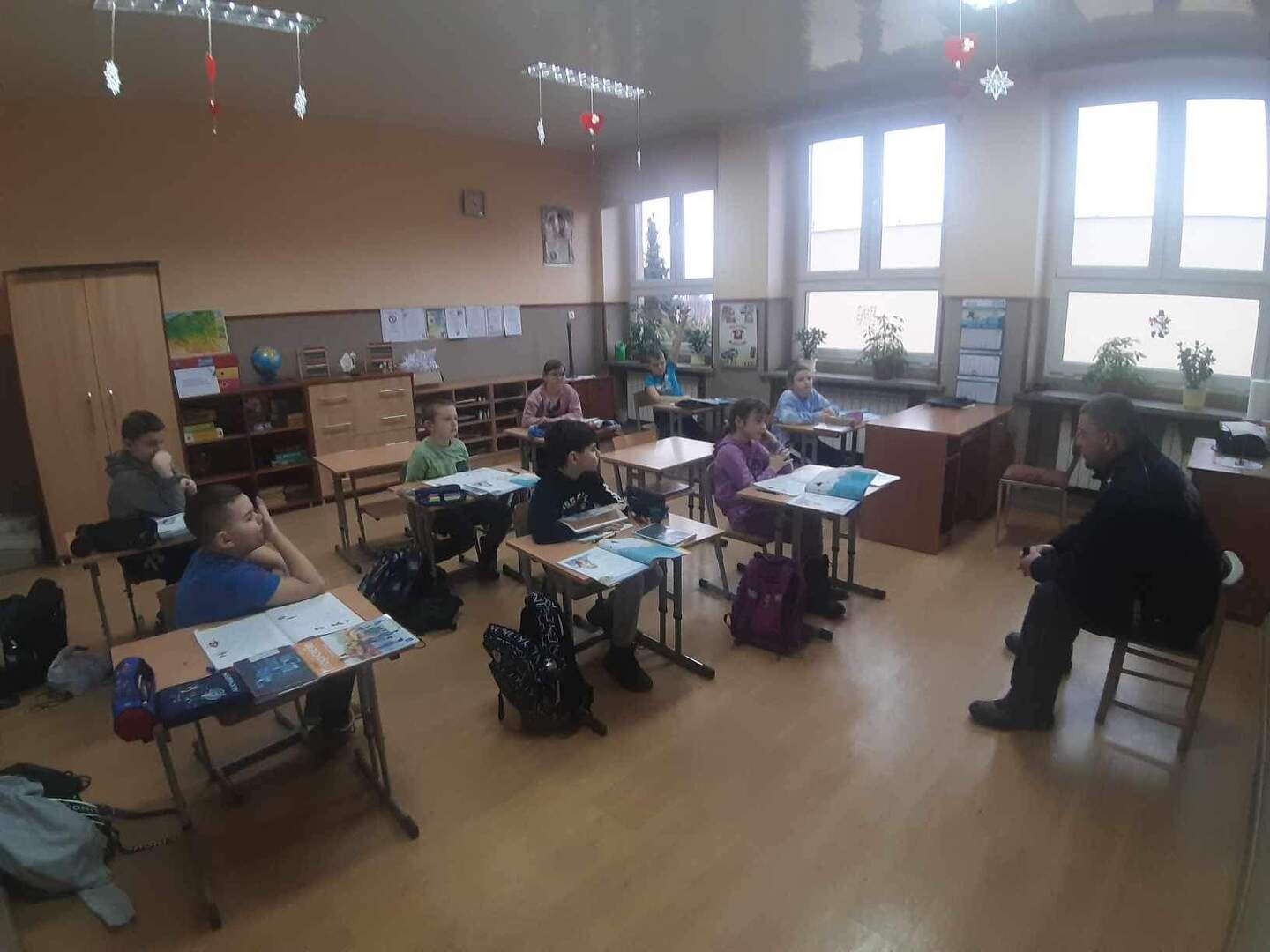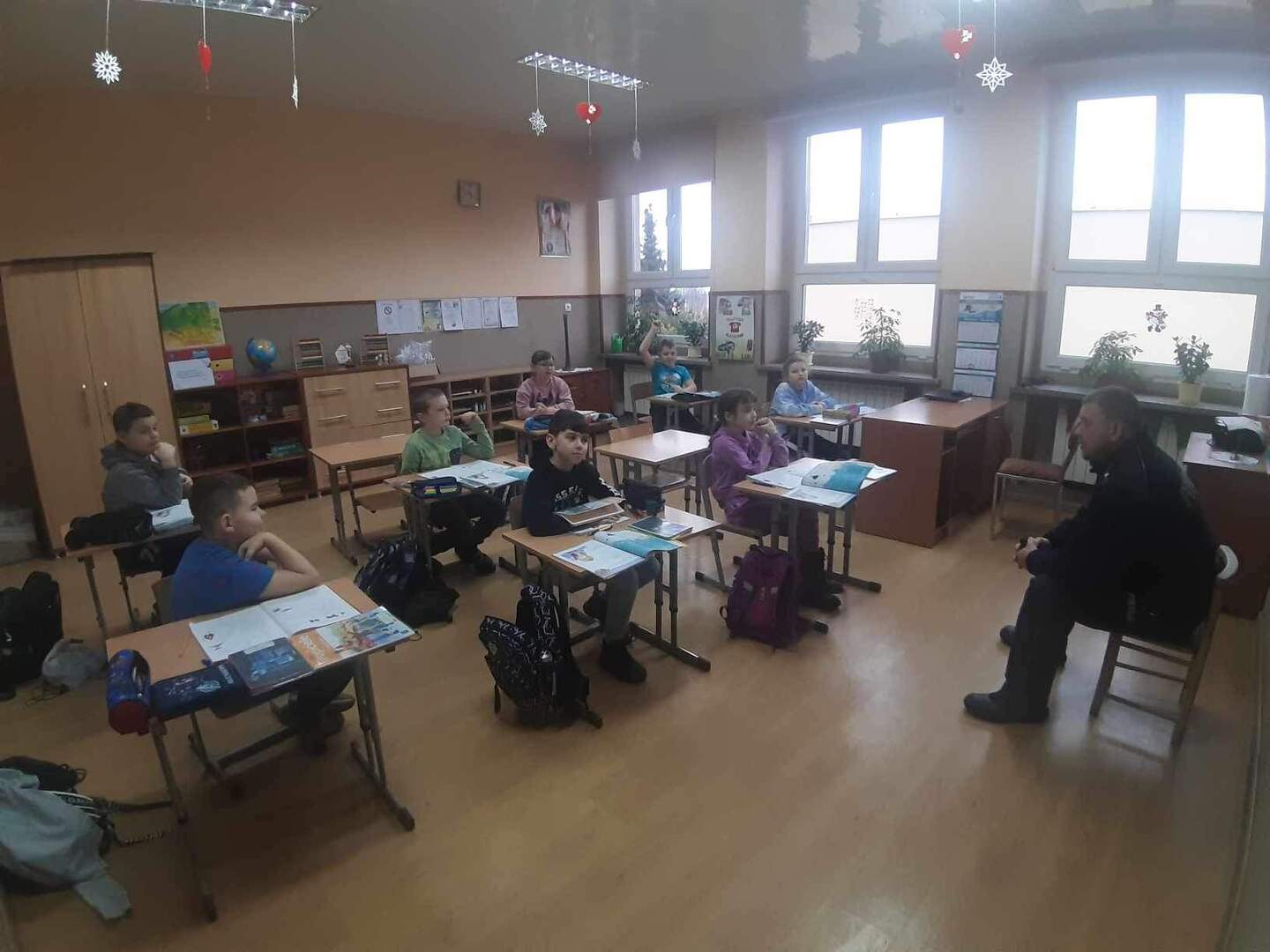 Dbając o bezpieczeństwo naszych najmłodszych uczniów w czasie zbliżających się ferii zimowych, w zeszłym tygodniu odbyły się spotkania z dzielnicowym mł. asp. panem Damianem Przybyłem dla dzieci z oddziałów przedszkolnych oraz uczniów kl. I-V. Podczas prelekcji policjant przypomniał o zagrożeniach mogących pojawić się w trakcie ferii. Szczególnie skupił się na omówieniu zasad bezpieczeństwa podczas uprawiania sportów zimowych oraz gier i zabaw na świeżym powietrzu. Zwrócił on szczególną uwagę na unikanie wchodzenia na zamarznięte zbiorniki wodne. Przestrzegał przed zjeżdżaniem na sankach z górki w pobliżu jezdni. Przypomniał zasady postępowania wobec nieznajomej osoby: „Nie rozmawiaj...", „Nie ufaj...", „Nie wpuszczaj do domu...”, ale również uświadomili dzieciom do kogo mogą zwrócić się o pomoc w przypadku zgubienia się w obcym miejscu. Udzielił wskazówek, jak korzystać z Internetu, a przede wszystkim przypomniał o ograniczeniu czasu używaniu laptopa/komputera, telewizora, i telefonu! Ważnym elementem spotkania była także rozmowa o przestrzeganiu zasad poruszania się po drogach, szczególnie po zmroku, kiedy niezbędne stają się elementy odblaskowe.