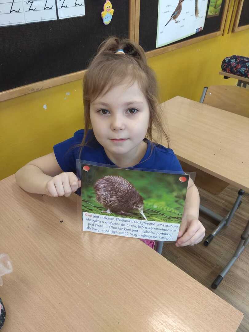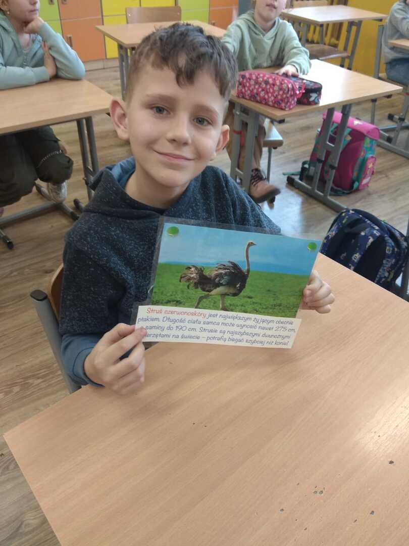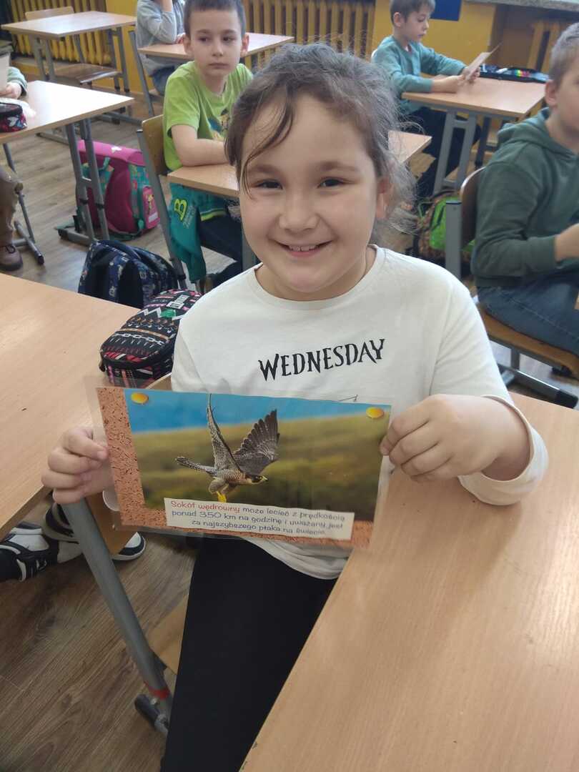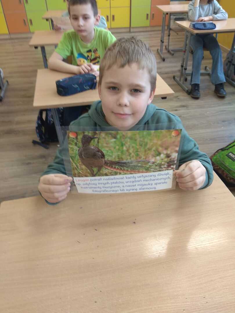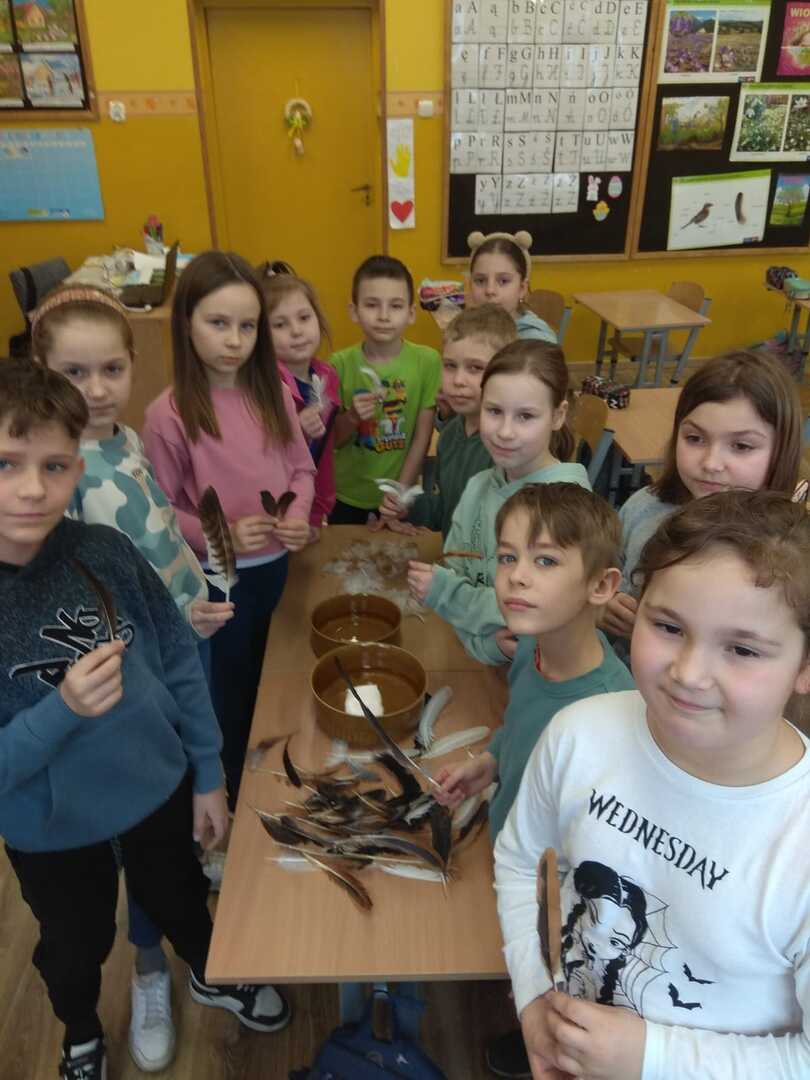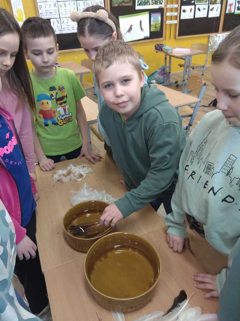 Podczas zajęć uczniowie poznali rodzaje i budowę piór. Rozwiązywali zagadki o niezwykłych ptakach zamieszkujących naszą Ziemię. W dalszej części zajęć wykonali gazetkę, na której umieścili informacje i rysunki niezwykłych ptaków żyjących na różnych kontynentach. Brali udział w doświadczeniu w wyniku, którego dowiedzieli się jak ważne jest dbanie o czystość wód na kuli ziemskiej, albowiem pióra ptaka po zetknięciu z zanieczyszczoną wodą stają się ciężkie. Ptak nie może wtedy latać i gnie.