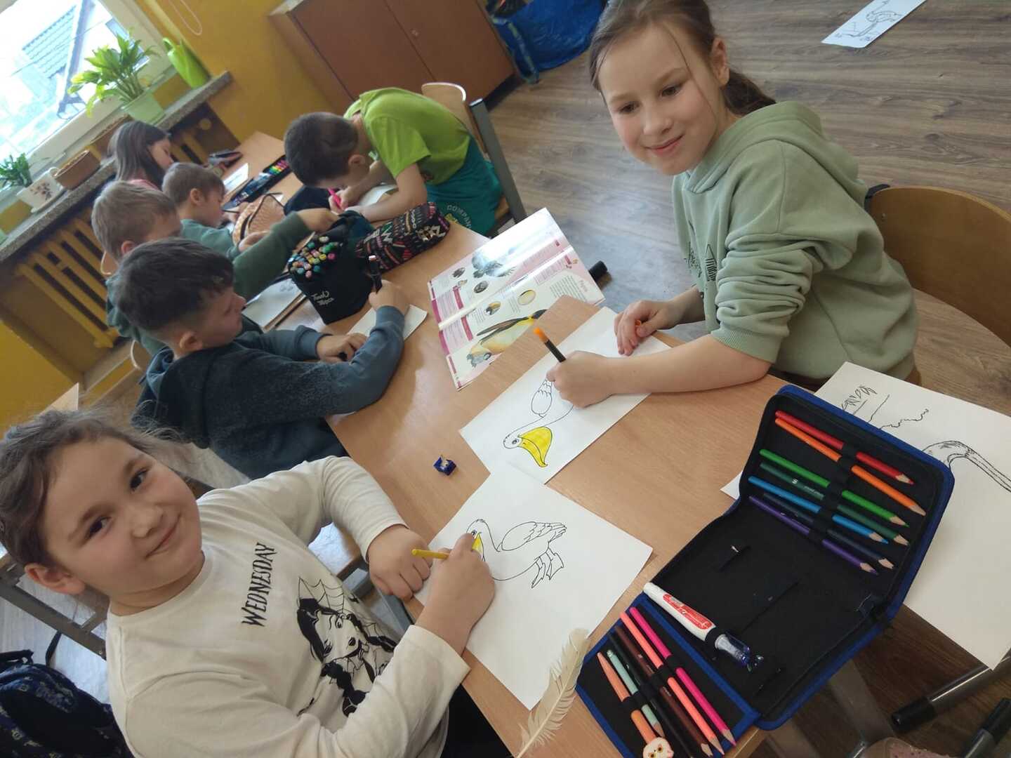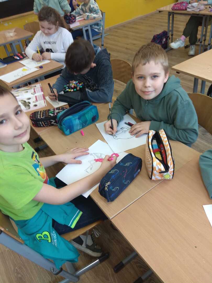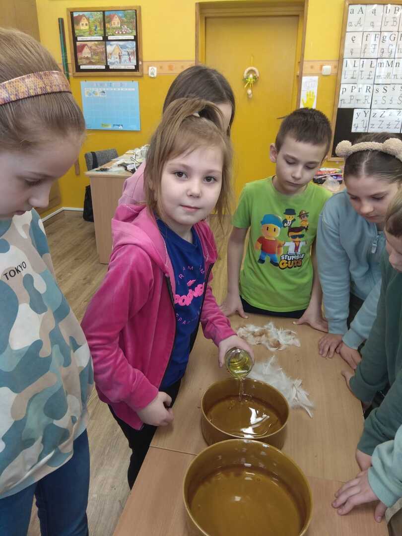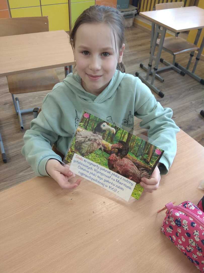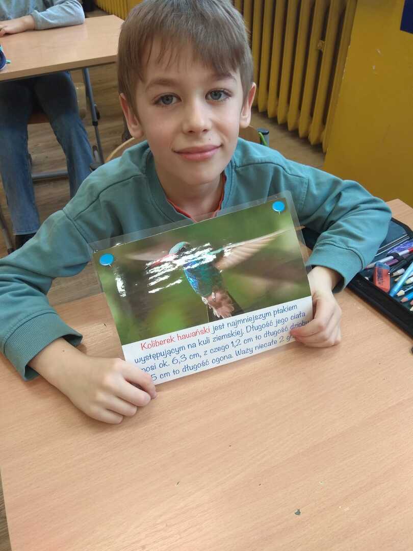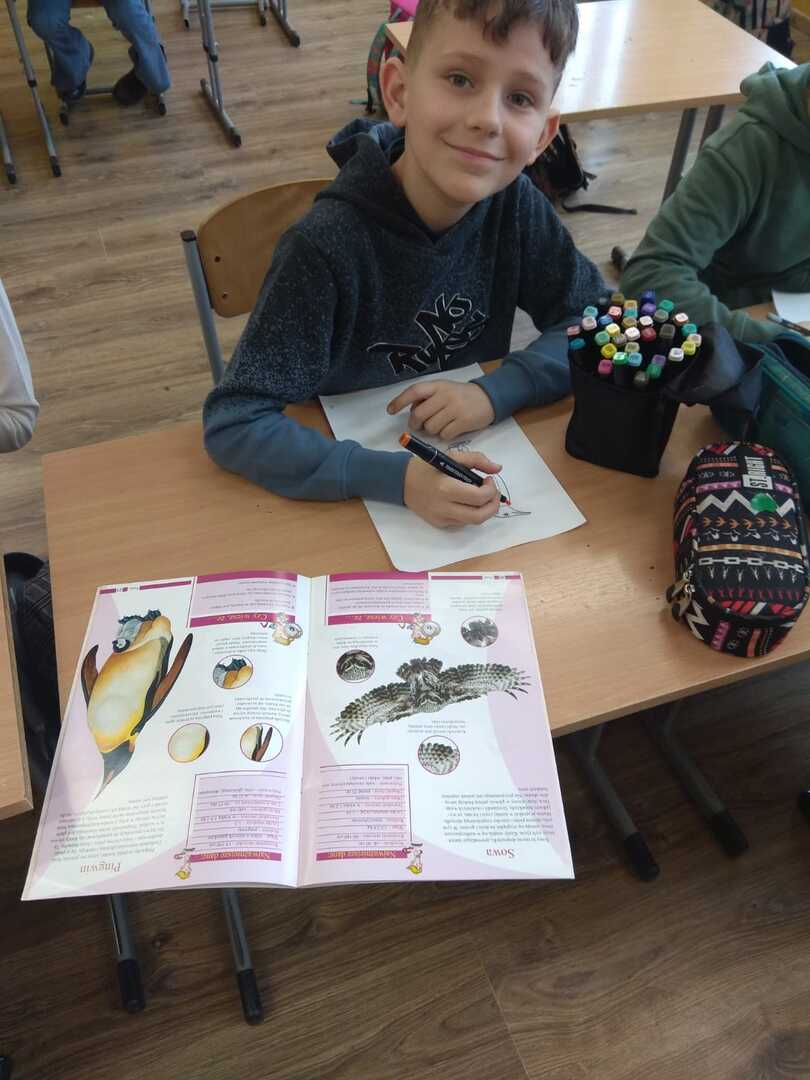 Podczas zajęć uczniowie poznali rodzaje i budowę piór. Rozwiązywali zagadki o niezwykłych ptakach zamieszkujących naszą Ziemię. W dalszej części zajęć wykonali gazetkę, na której umieścili informacje i rysunki niezwykłych ptaków żyjących na różnych kontynentach. Brali udział w doświadczeniu w wyniku, którego dowiedzieli się jak ważne jest dbanie o czystość wód na kuli ziemskiej, albowiem pióra ptaka po zetknięciu z zanieczyszczoną wodą stają się ciężkie. Ptak nie może wtedy latać i gnie.