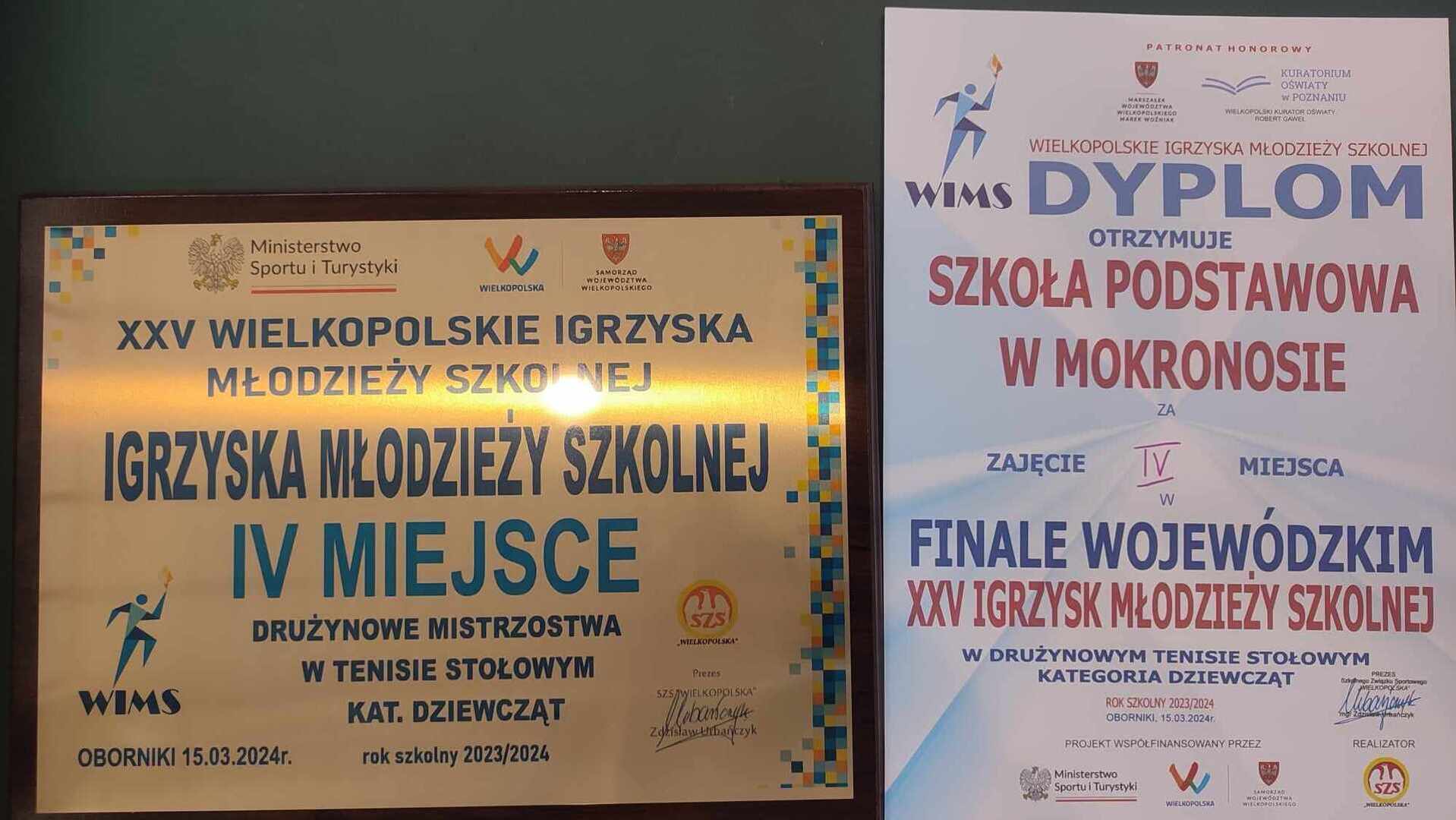 Ogromny sukces dla Szkoły Podstawowej w Mokronosie wywalczyła drużyna dziewcząt, która w finale wojewódzkim zajęła 4 miejsce. Dziewczynki zwyciężając 2 pierwsze mecze wygrały swoją grupę a następnie wygrały ćwierćfinał ; w walce o finał ustąpiły drużynie z Puszczykowa. Chciałbym nadmienić iż w szkole działa sekcja tenisa stołowego w ramach projektu SKS "Szkolny Klub Sportowy" , gdzie dziewczęta i chłopcy regularnie trenują co przynosi oczekiwane efekty. Nasza Szkoła pierwszy raz miała okazję uczestniczyć w zawodach na najwyższym szczeblu – 4 miejsce, które udało nam się uzyskać jest dla Nas ogromnym sukcesem, na pewno trudnym do powtórzenia. Gratulacje dla naszych tenisistek.