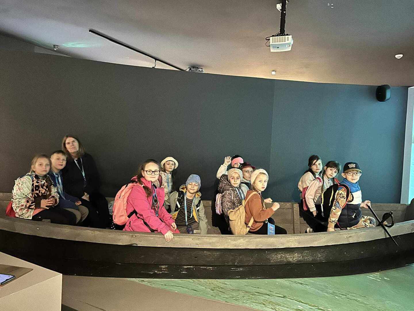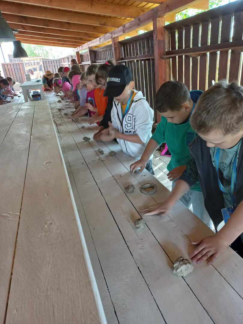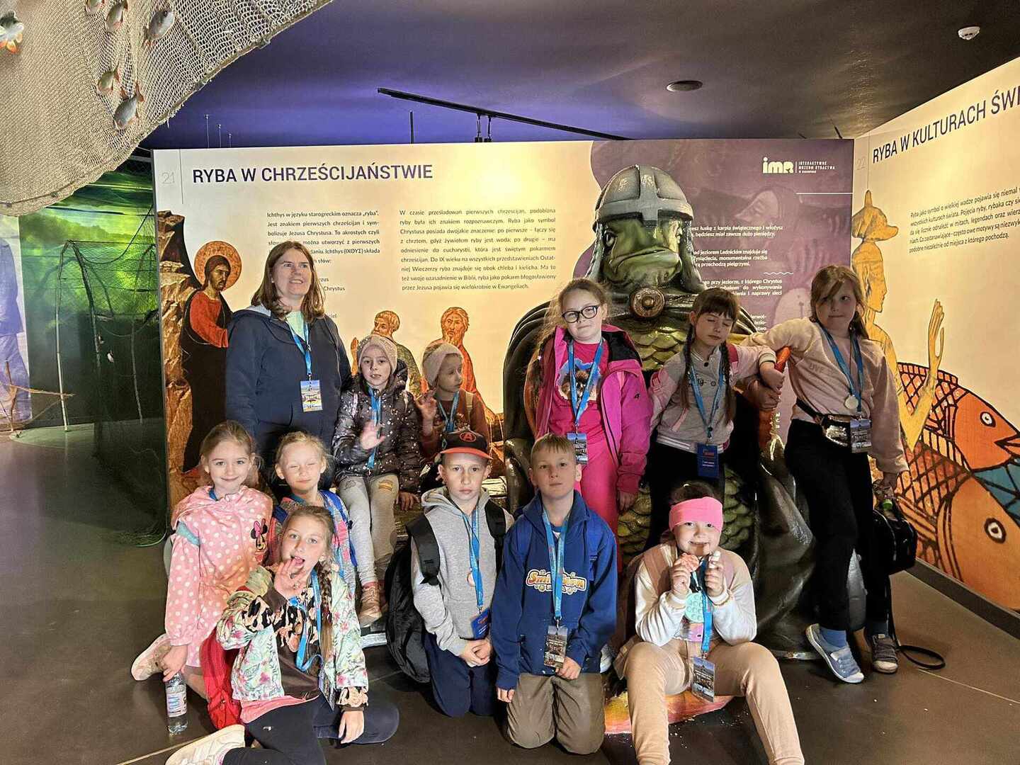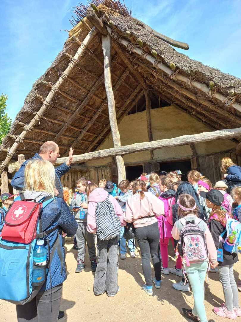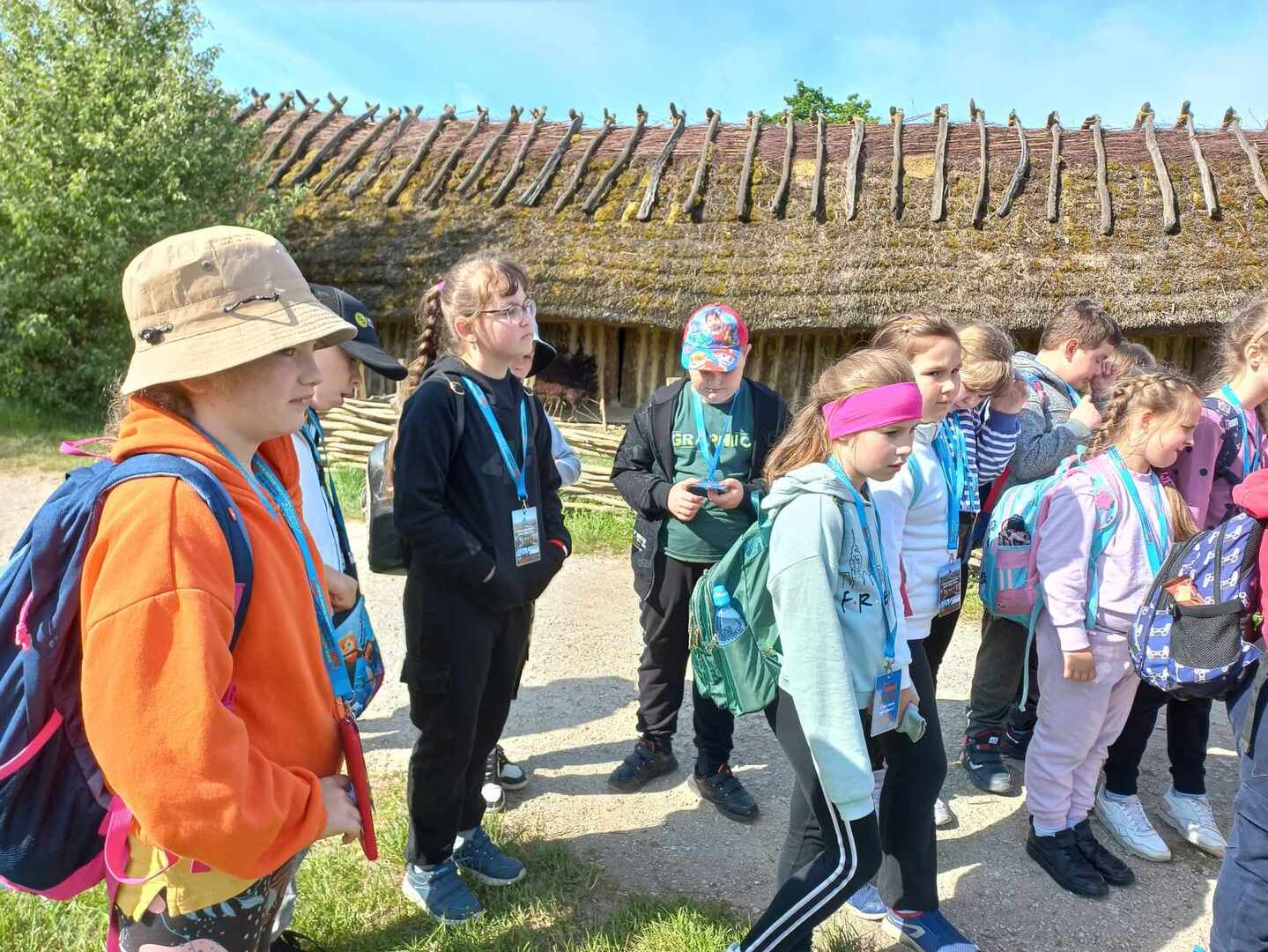 Pierwszym punktem programu był Biskupin. Pan przewodnik przybliżył uczestnikom wycieczki dzieje prastarego grodu na przestrzeni wieków. Można było zobaczyć, jak żyli i pracowali ludzie grodu nad Jeziorem Biskupińskim. Następnie dzieci udały się na warsztaty lepienia z gliny oraz malowania na szkle. Powstały naprawdę oryginalne dzieła. Dużym zainteresowaniem cieszyło się Interaktywne Muzeum Rybactwa. Z ogromnym zaciekawieniem dzieci słuchały przekazu przewodnika, a potem miały okazję poeksperymentować. Z Biskupina wszyscy udali się kolejką do Wenecji, podziwiając panoramę okolicy oraz zachowane ruiny starych budowli w Wenecji. Stamtąd trasa wycieczki wiodła do Rogowa. Spacerując w Parku Dinozaurów uczniowie podziwiali i zachwycali się potęgą wymarłych okazów sprzed milionów lat. W Rogowie był też czas na zabawy na placu zabaw, pokonywanie toru przeszkód i przechodzenie przez labirynt. Oczywiście nie mogło zabraknąć wycieczkowych trofeów – każdy chciał zakupić dla siebie i najbliższych pamiątki z wyjazdu.