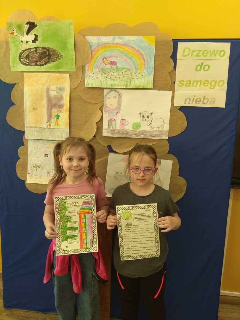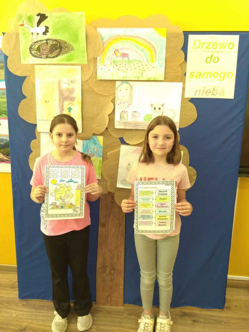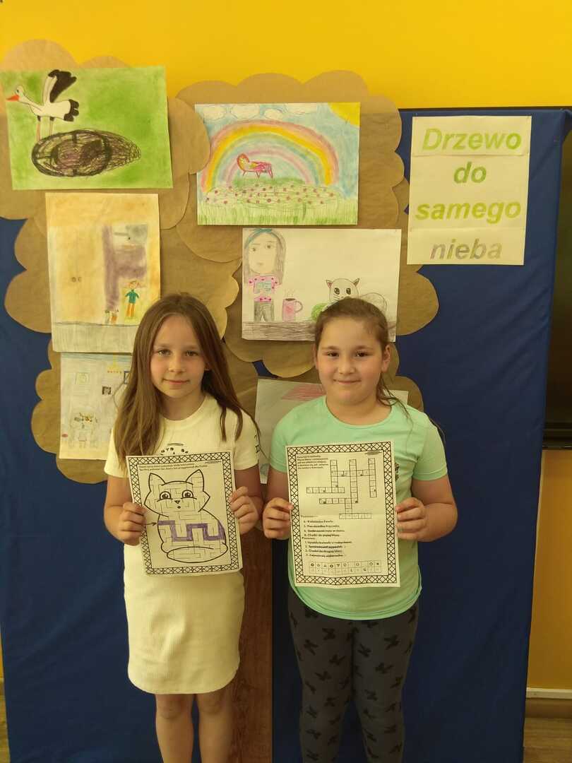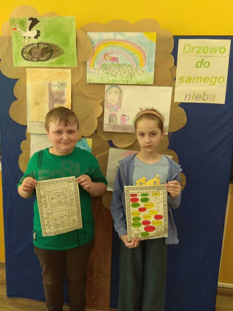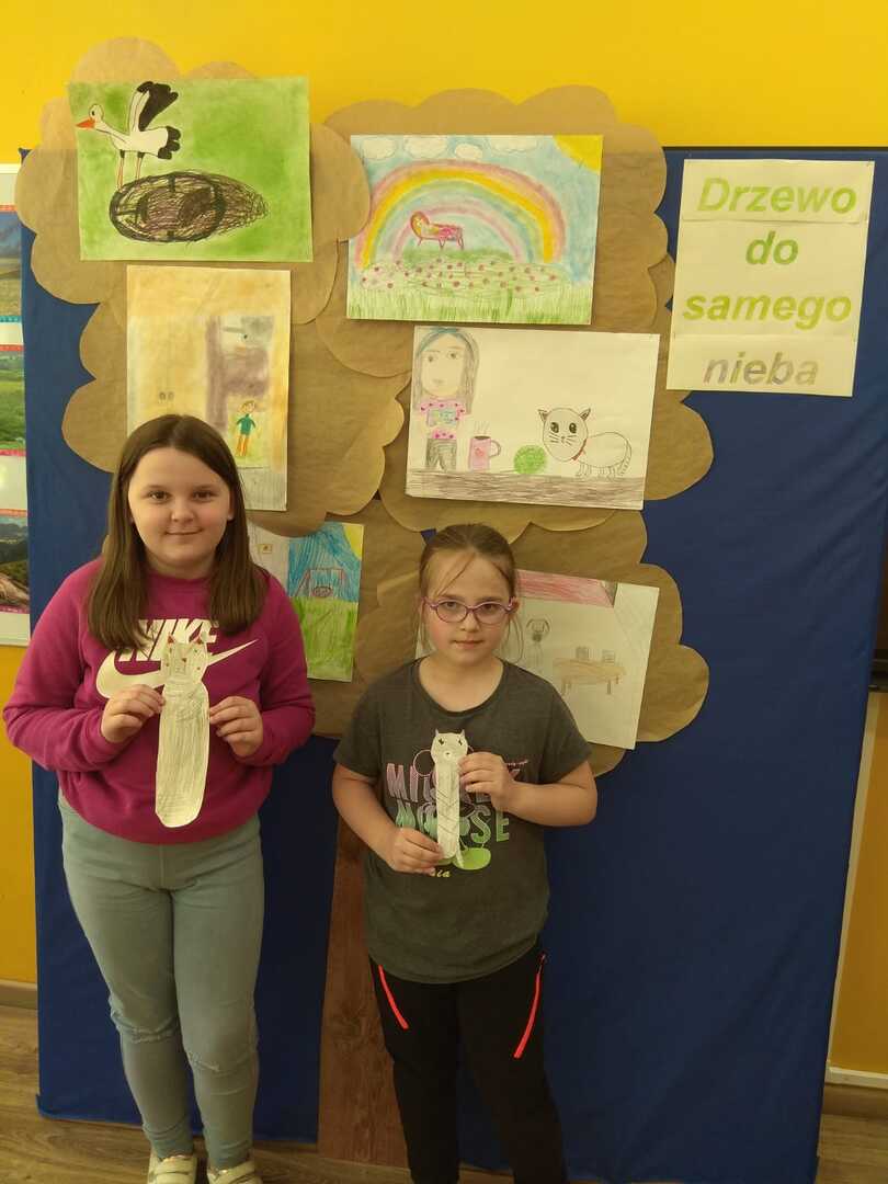 Realizując projekt stworzyliśmy teczki zawierające skarby, zagadki, kolorowanki i elementy rozrywkowe, powiązane z treścią lektury. Podczas zajęć plastycznych w naszej klasie stworzyliśmy …drzewo do samego nieba oraz „zezusiowe” zakładki do książek.