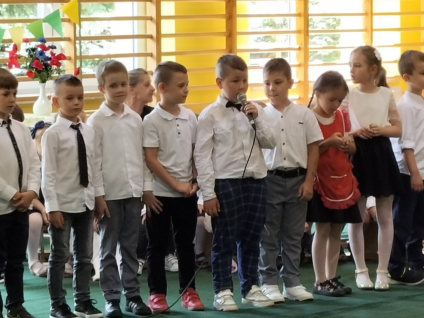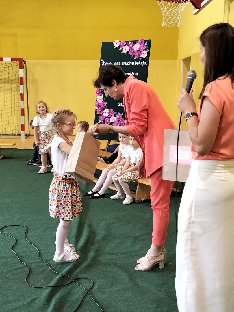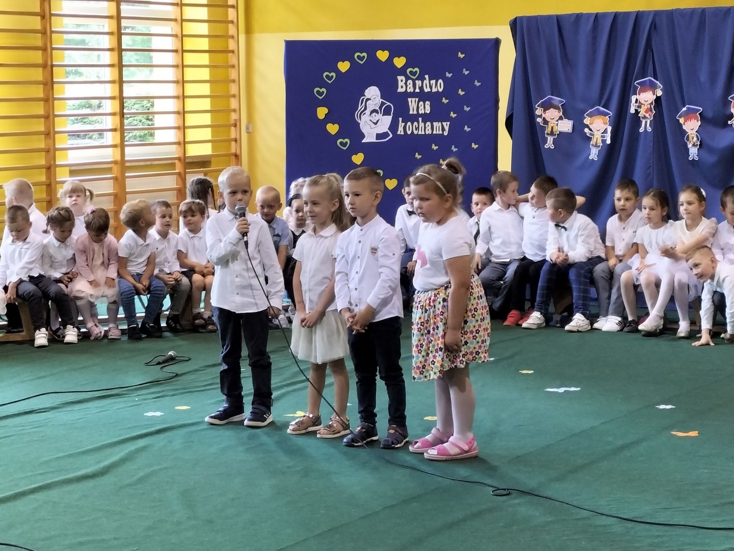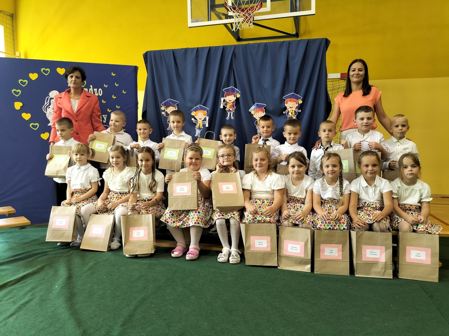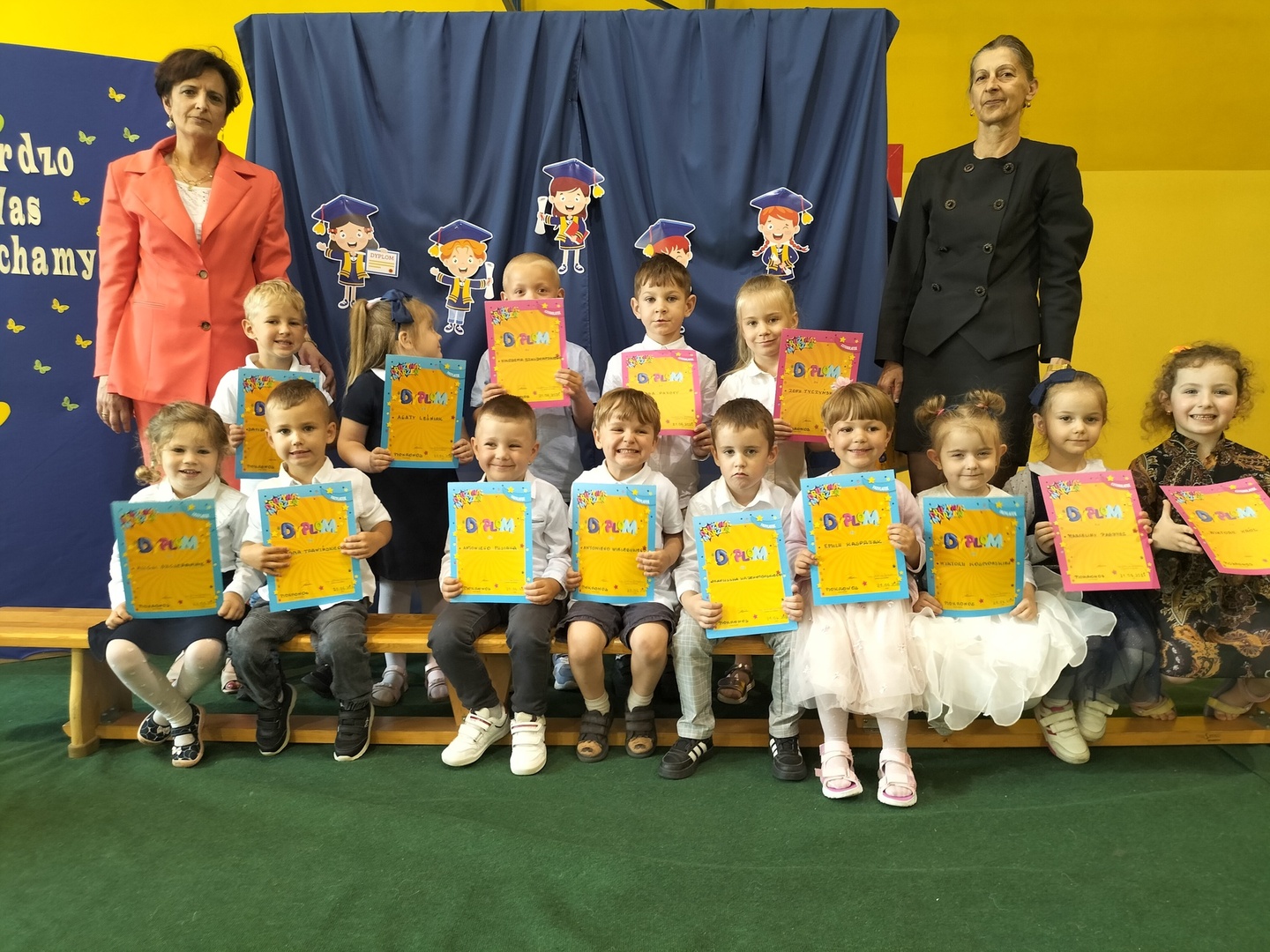 Czas leci nieubłaganie i te dzieci, które jeszcze niedawno przekraczały po raz pierwszy progi przedszkola po wakacjach wkraczają w kolejny etap edukacyjny. Był to wyjątkowy dzień dla całej naszej przedszkolnej społeczności. Tego dnia odbyło się uroczyste pożegnanie starszaków. Dzieci wspaniale zaprezentowały program artystyczny. Były wierszyki, piosenki i tańce. Emocji nie brakowało. Starszaki, jak przystało na absolwentów przedszkola, w odświętnych strojach i z powagą w głosie, recytowały wiersze, śpiewały piosenki i zatańczyły Poloneza. Podczas tej uroczystości dzieci również podziękowały swoim rodzicom za obecność, miłość, troskę i każdy zwyczajny dzień. Na zakończenie wręczył drobny upominek z okazji ich święta. Dzieci natomiast zostały obdrowane dyplomami oraz prezentami.