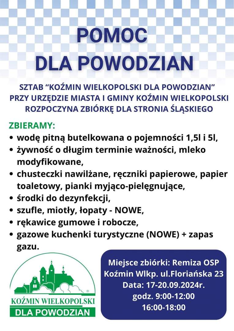 Wraz z Miasto i Gmina Koźmin Wielkopolski , szkołami oraz innymi instytucjami z terenu naszej gminy włączmy się w akcję pomocy potrzebującym i poszkodowanym w wyniku powodzi na południu Polski.