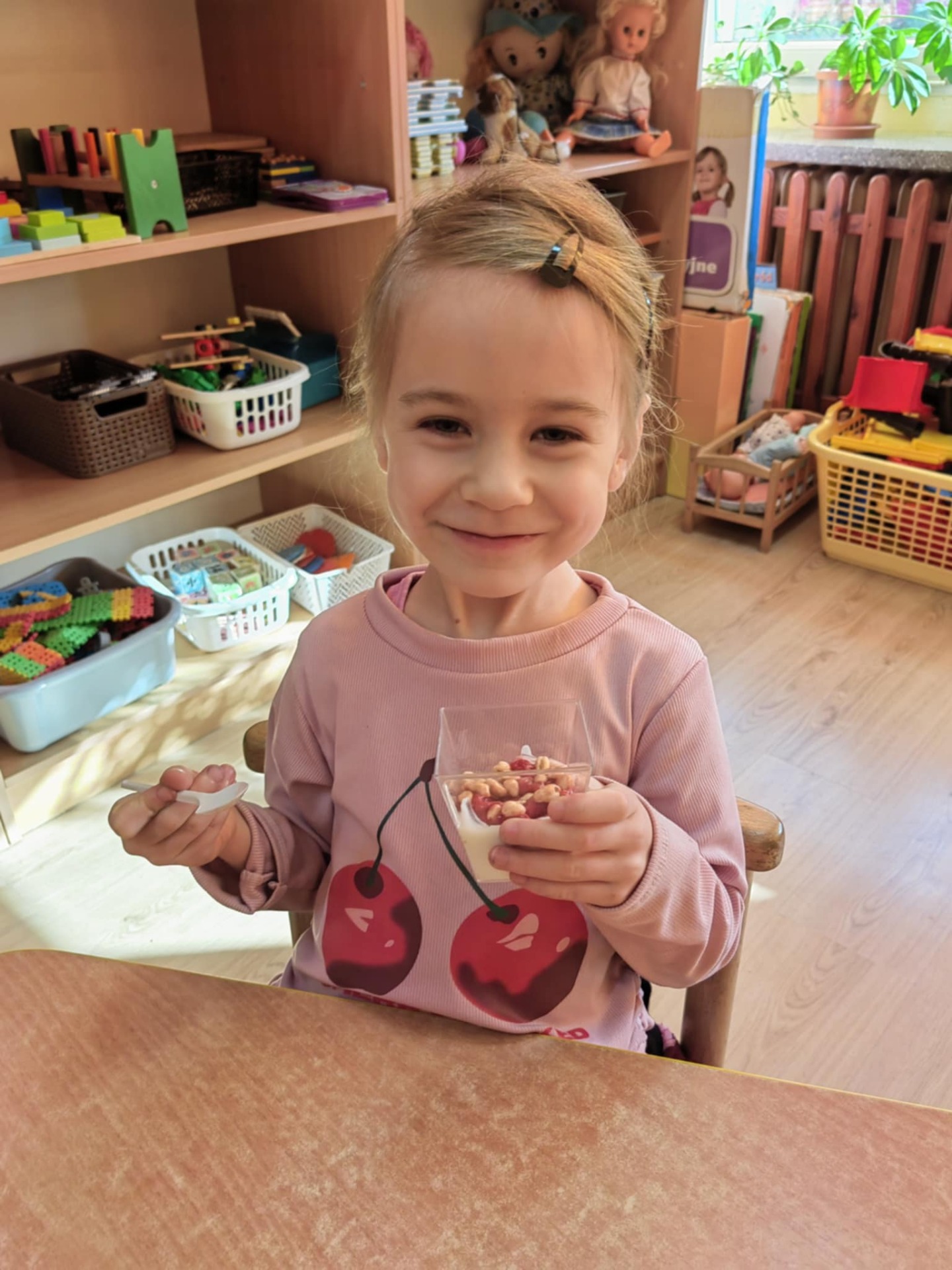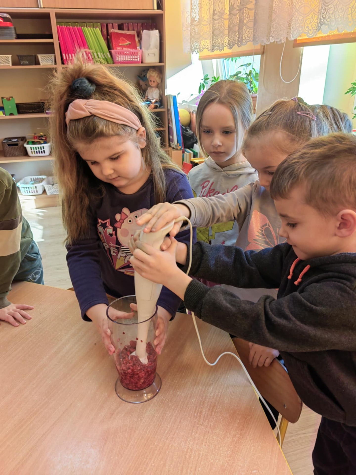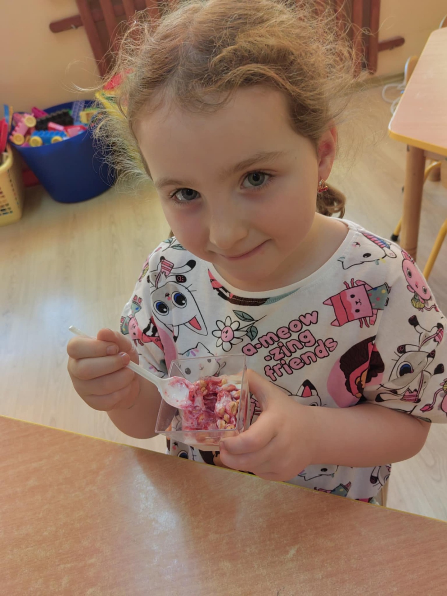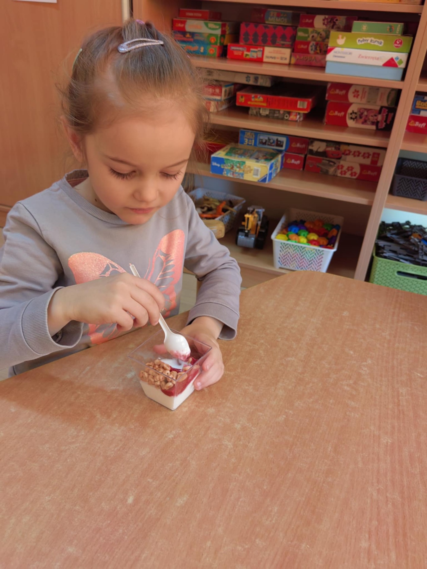 Grupa 4-5 latki zrealizowała kolejne zadanie tym razem „Wiemy po co jemy” w ramach programu edukacyjnego „Gotuj się na zmiany”. Celem zajęć było wprowadzenie dzieci w świat prawidłowych nawyków żywieniowych poprzez ciekawe i angażujące zabawy. Przedszkolaki poznały jakie warzywa i owoce wpływają na nasza odporność, wzrok, skórę, pracę mózgu oraz jelit. Zorganizowane zostały zabawy dla rozwoju grafomotoryki dużej oraz małej. Na zakończenie przygotowały zdrowy, owocowy deser.