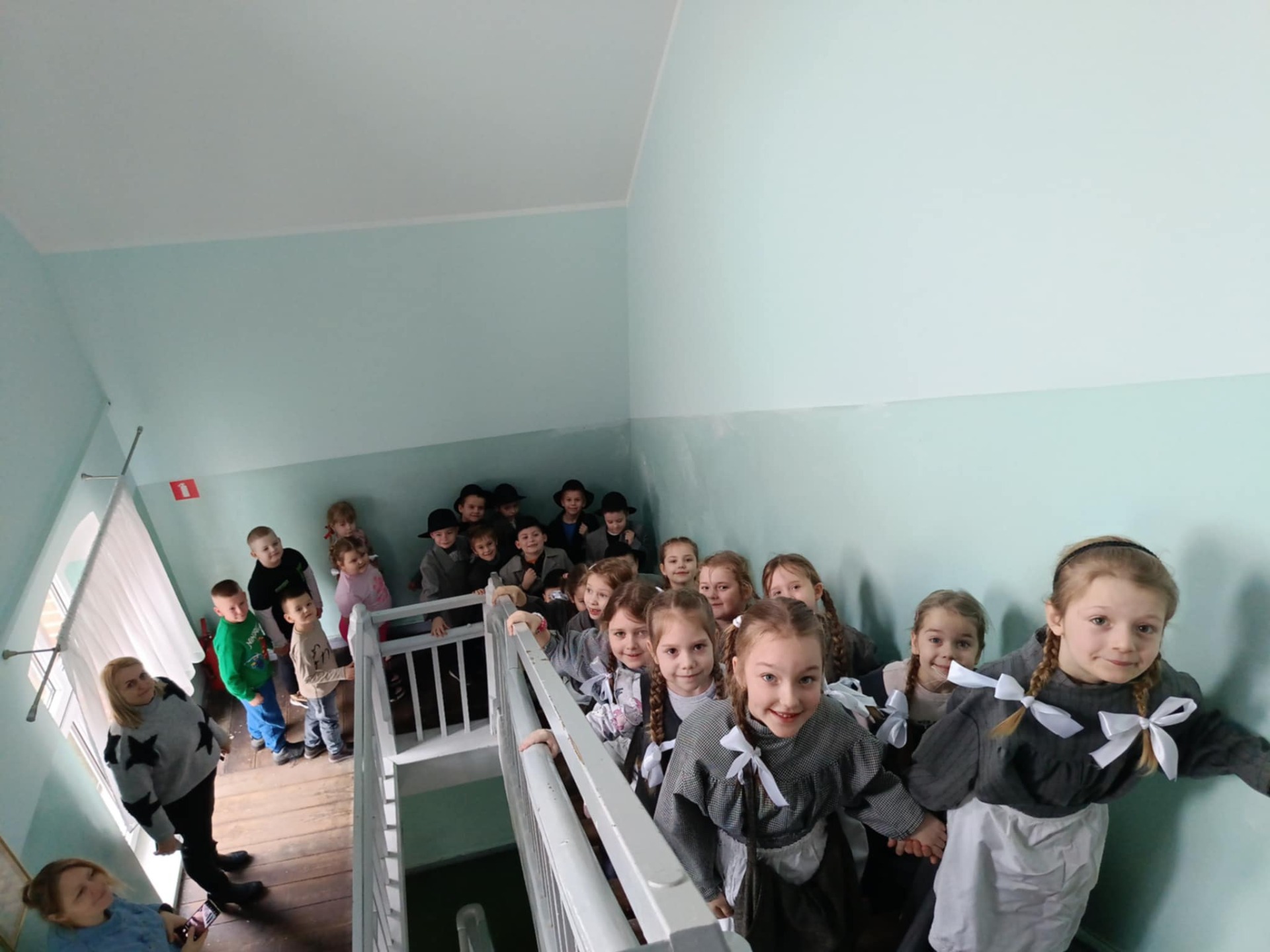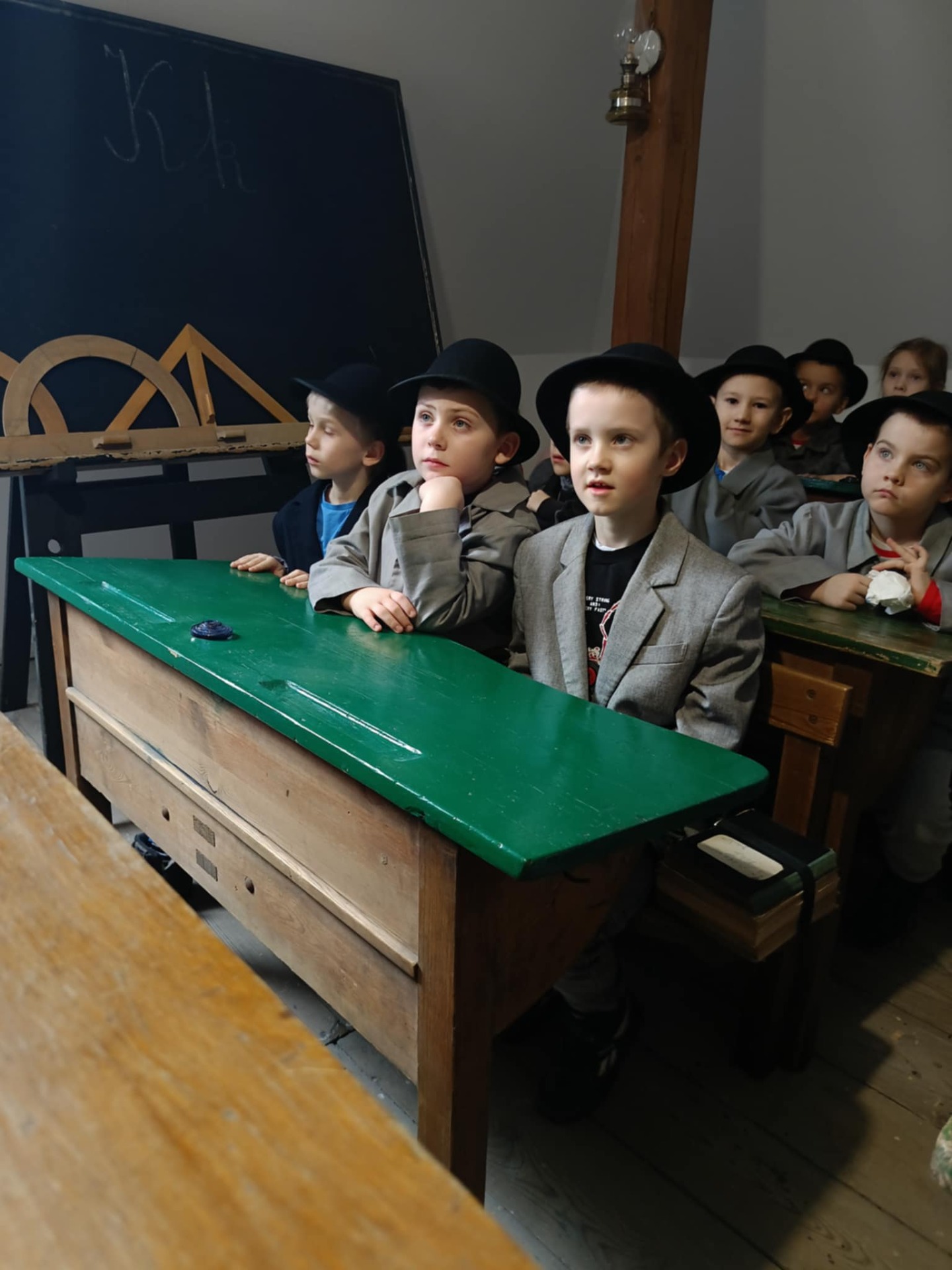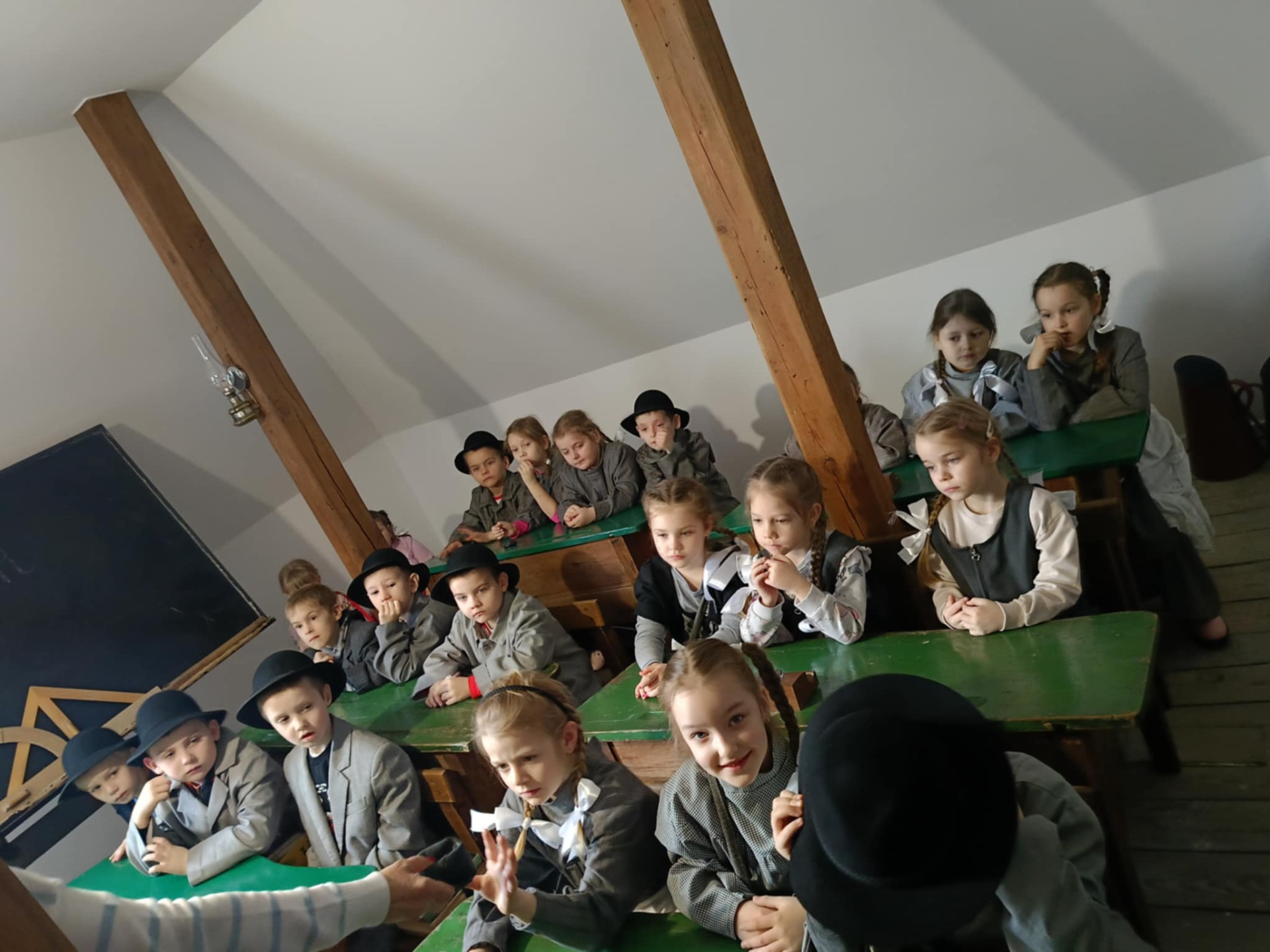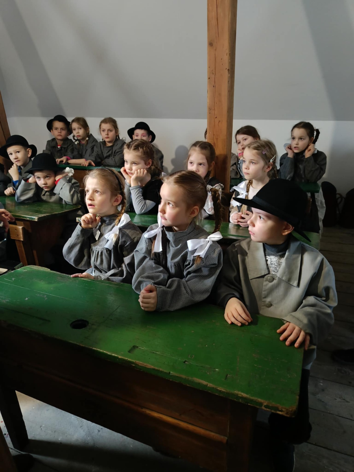 Oddział "0" w poniedziałkowy poranek odwiedził miejsce pamięci historycznej, które znajduje się w Dzielicach w gm. Rozdrażew. Podczas pobytu w sali lekcyjnej z dawnych lat dzieci przebrane w stroje, które noszono w odległych czasach wysłuchały ciekawych informacji z czasów wojennych związanych ze szkołą.