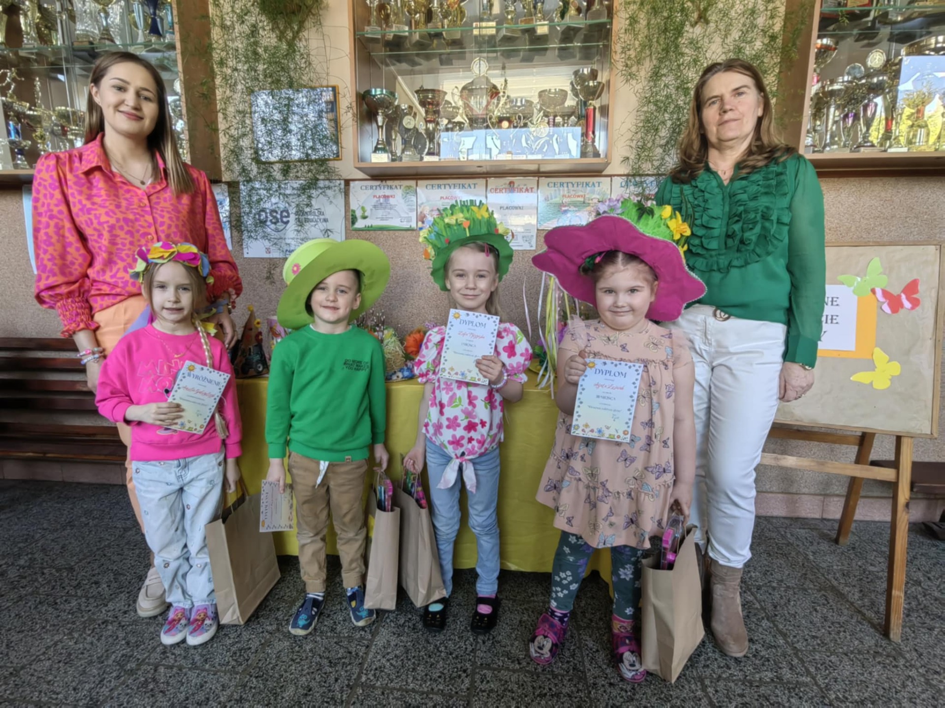 Dzieci z grupy 4-5 latki wraz z rodzicami wzięły udział w wiosennym konkursie na nakrycie głowy. Dostarczone prace wykonane były z niezwykłą starannością oraz kreatywnością. Wszystkie dzieci otrzymały dyplomy i upominek. Jury wyłoniło również zwycięzców: