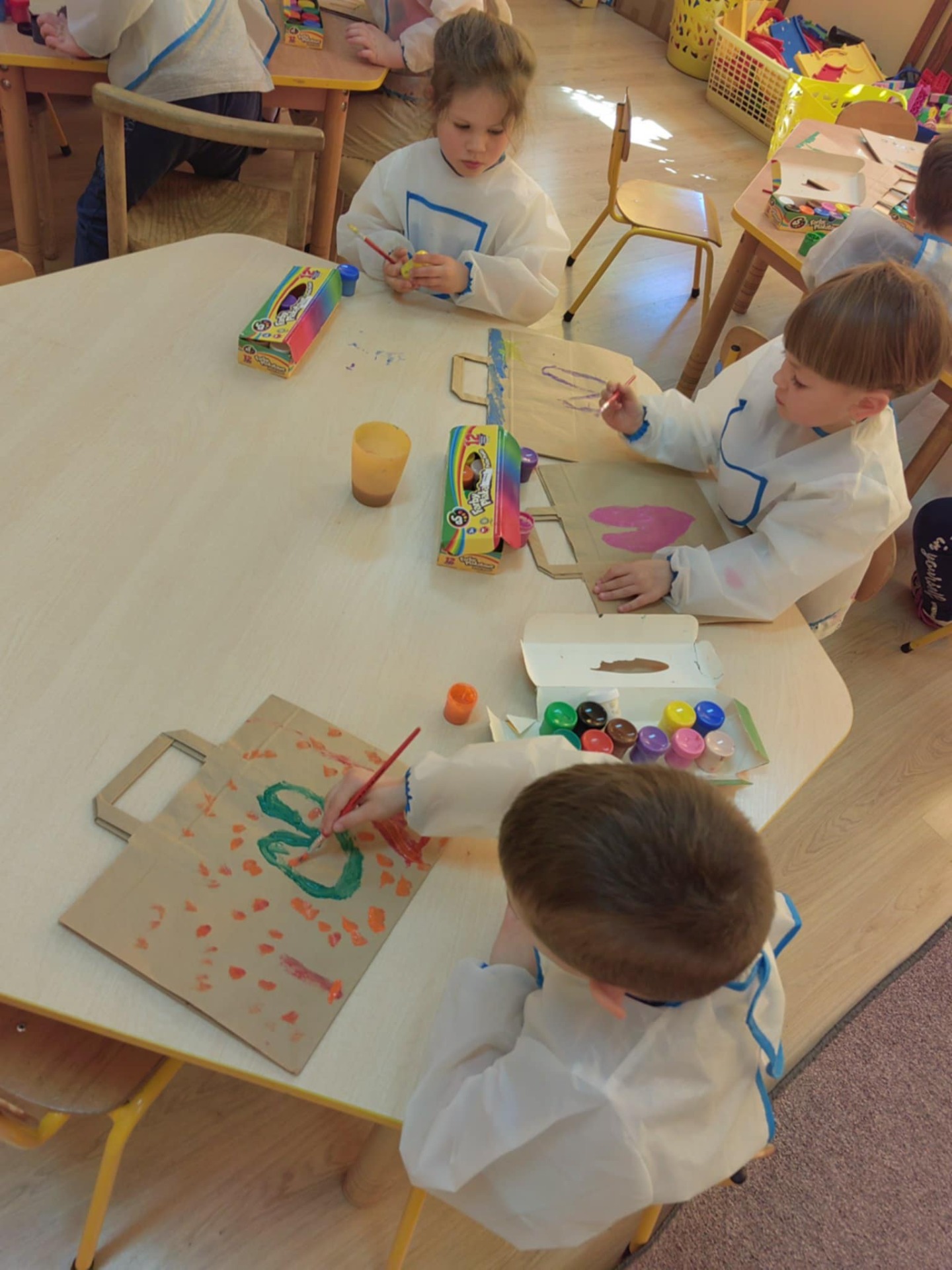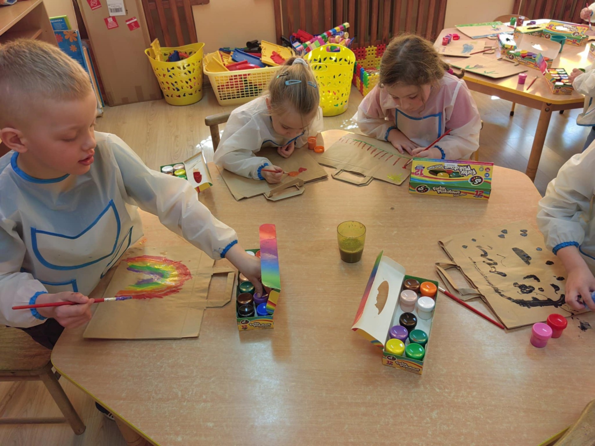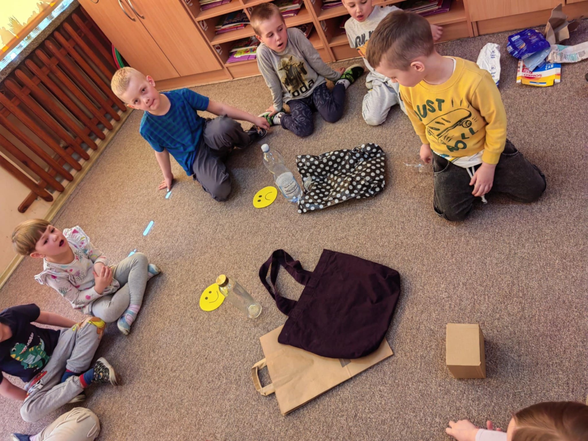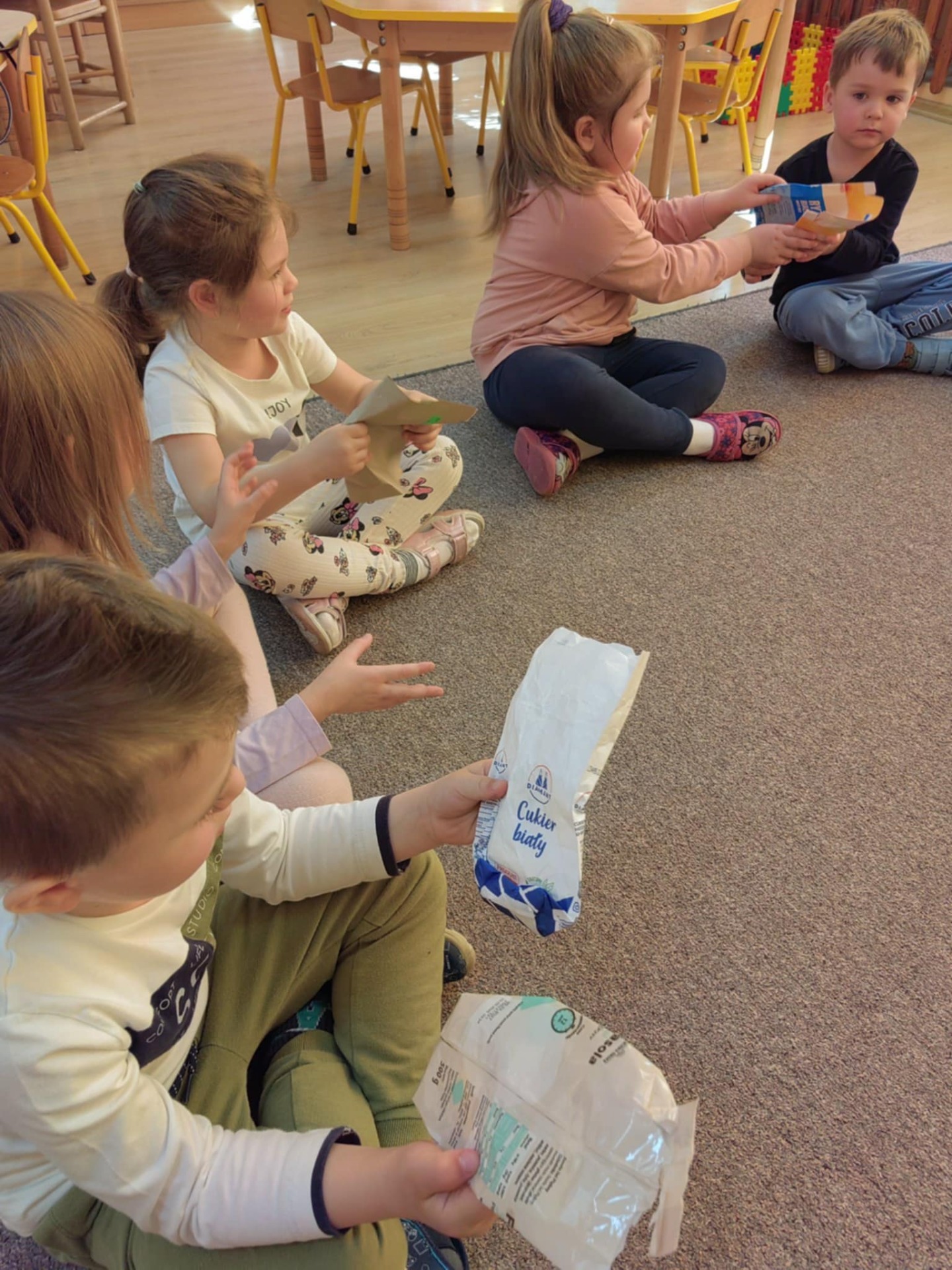 Dzieci z grupy 4-5 latki zrealizowały kolejne zadanie w ramach programu edukacyjnego „Gotuj się na zmiany”. Celem zajęć było zapoznanie dzieci z zasadami recyklingu i sortowania odpadów. Poznanie różnych rodzajów opakowań i surowców. Podczas realizacji wysłuchały ilustrowanej bajki „Paka z warzywniaka i tajemnica zaginionej listy zakupowej”, z której zapamiętały cenną radę- warto zrobić listę zakupów wybierając się do sklepu. Jednym z kluczowych punktów tego modułu było zadanie konkursowe- nasza grupa stworzyła bazar- ozdobę zero waste. Na zakończenie dzieci wykonały eko torby, z którymi wybiorą się na kolejne zakupy.