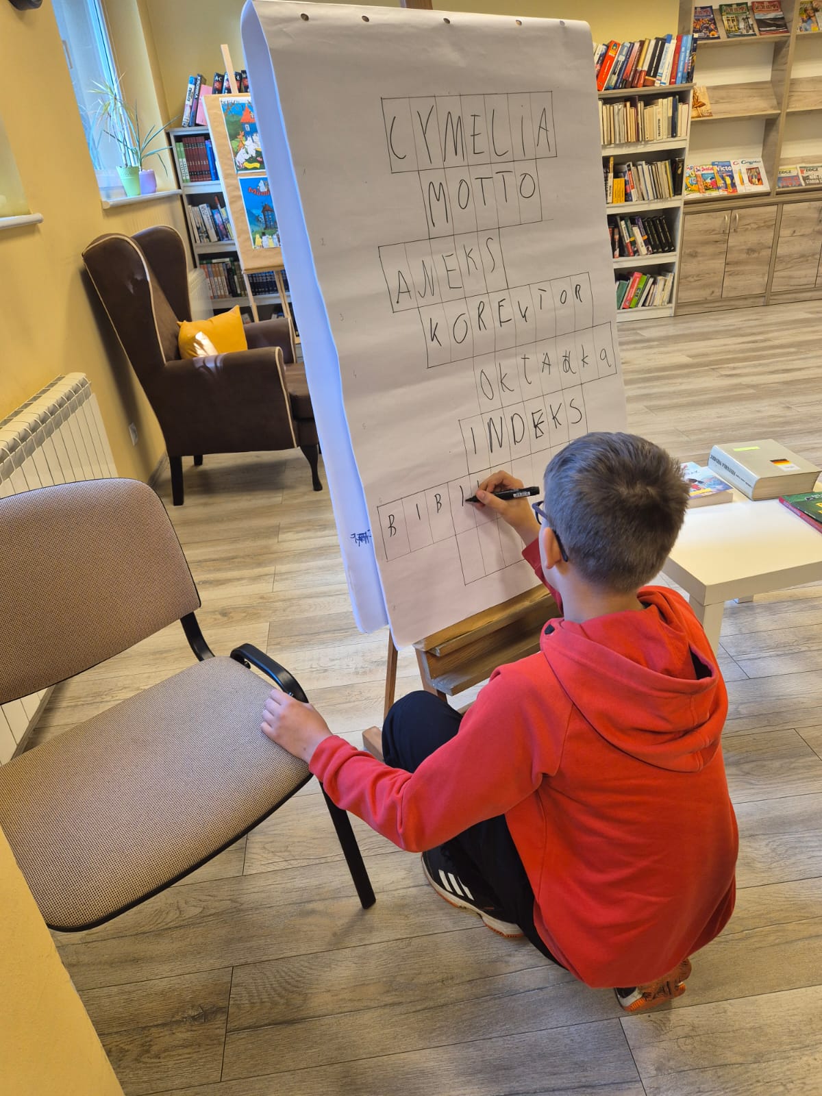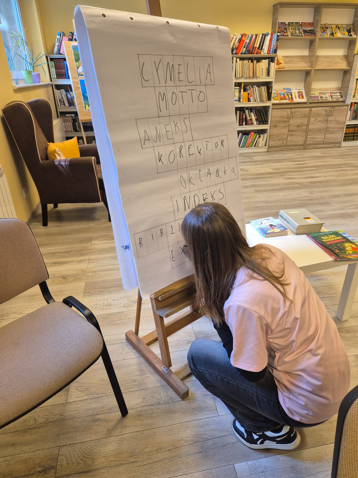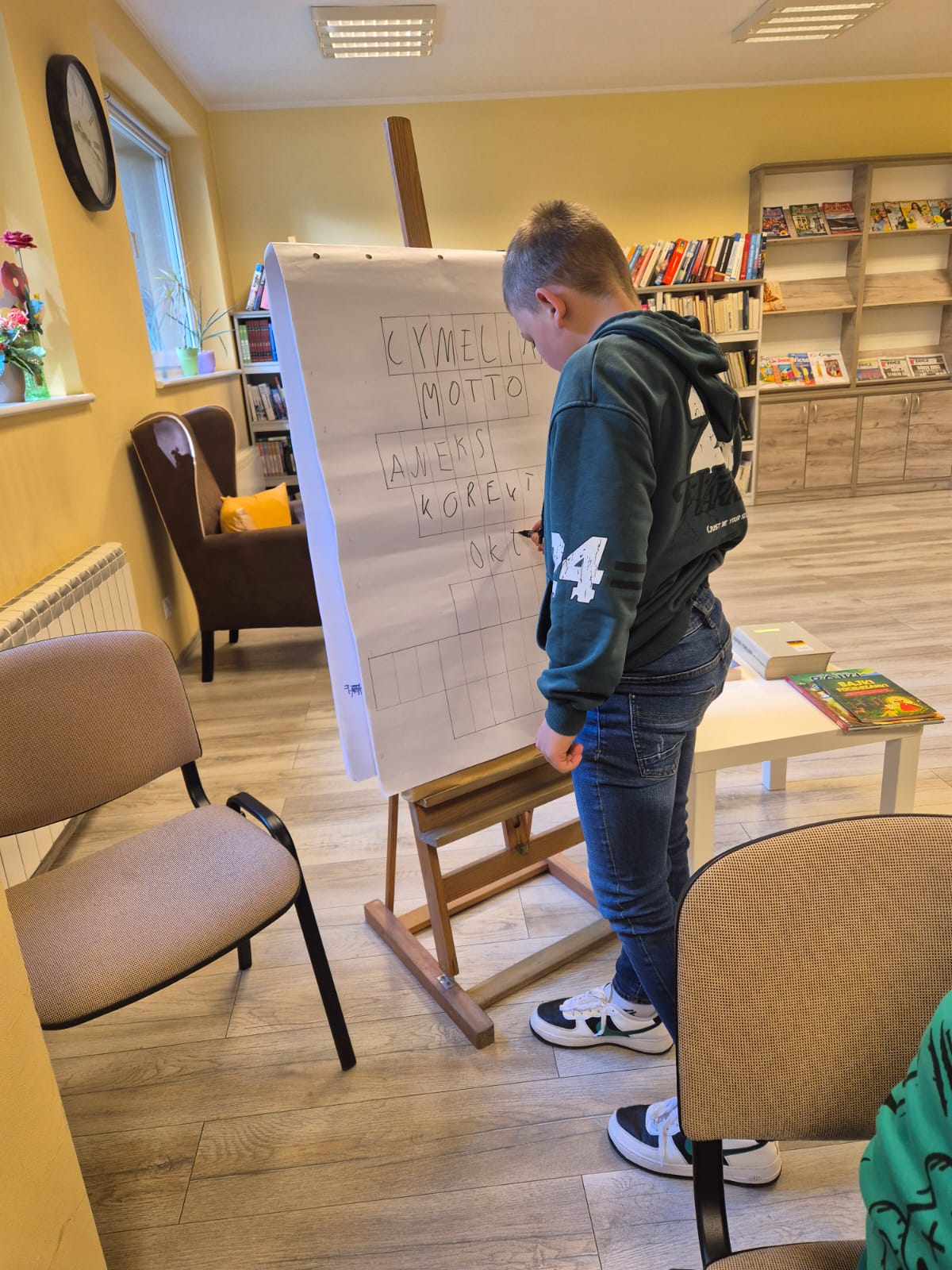Wycieczkę rozpoczęliśmy od lekcji "Moje spotkanie z książką" w Bibliotece Publicznej. Przypomnieliśmy sobie kilka wyrazów związanych z książką (np. motto, dedykacja, przypisy...), a później rozwiązaliśmy krzyżówkę. Mogliśmy też pochodzić między regałami i rozejrzeć się, jakie książki są na półkach.