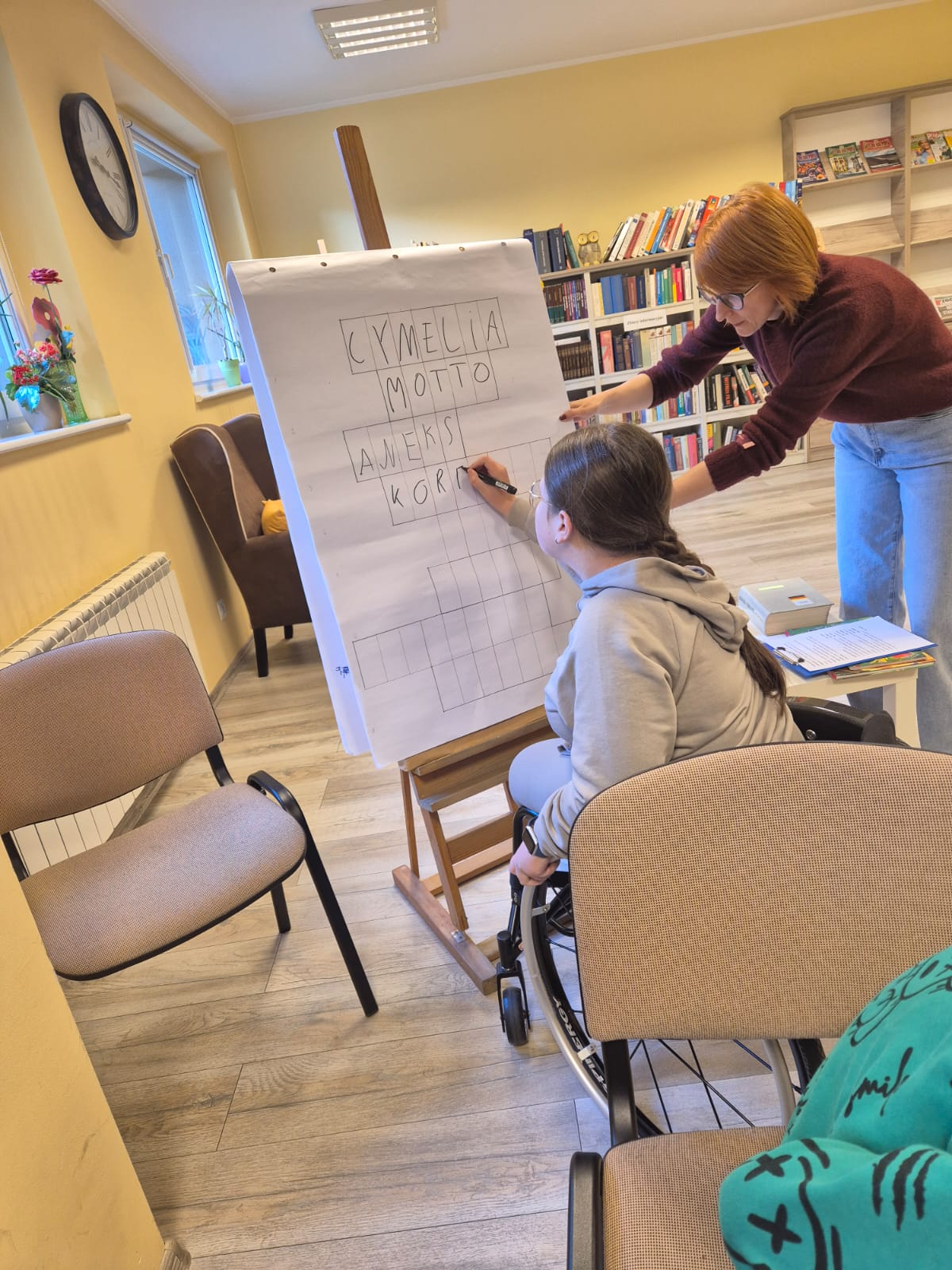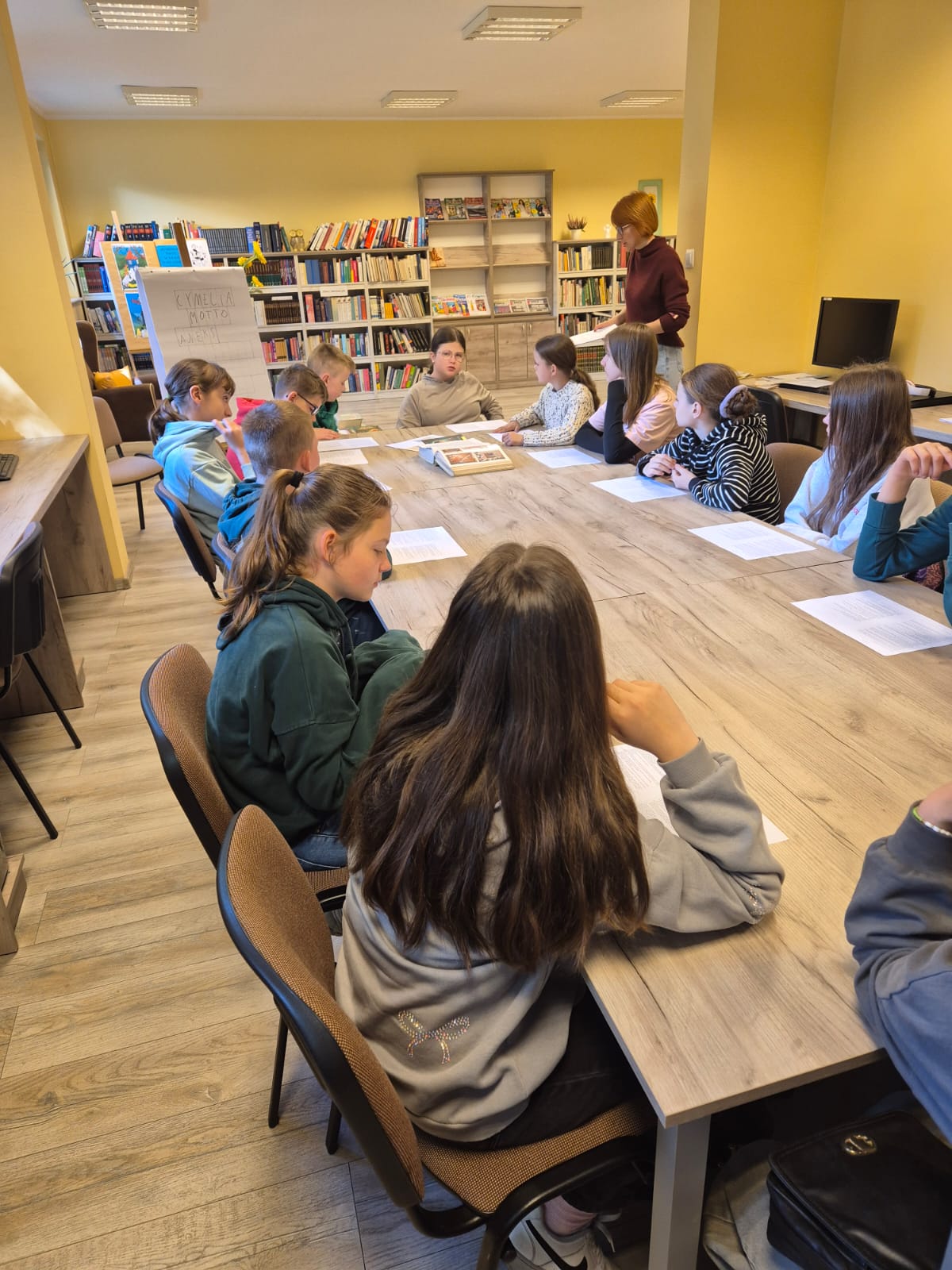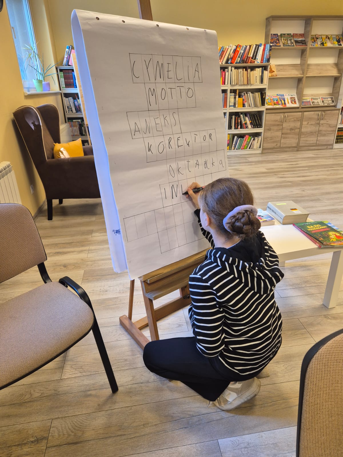 Wycieczkę rozpoczęliśmy od lekcji "Moje spotkanie z książką" w Bibliotece Publicznej. Przypomnieliśmy sobie kilka wyrazów związanych z książką (np. motto, dedykacja, przypisy...), a później rozwiązaliśmy krzyżówkę. Mogliśmy też pochodzić między regałami i rozejrzeć się, jakie książki są na półkach.
