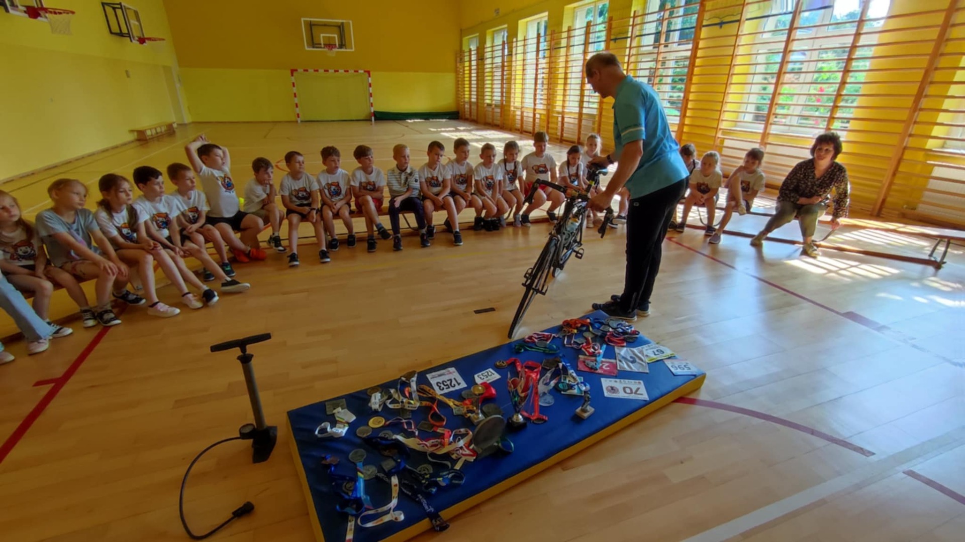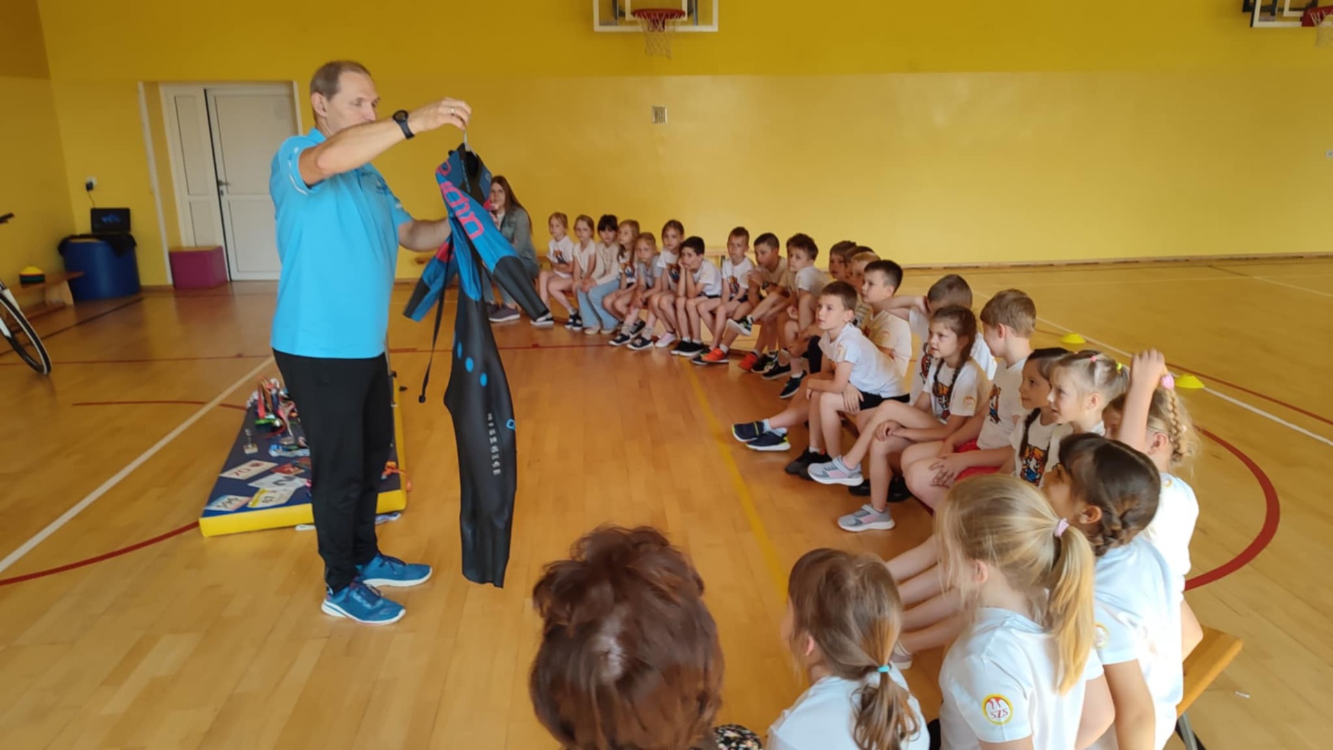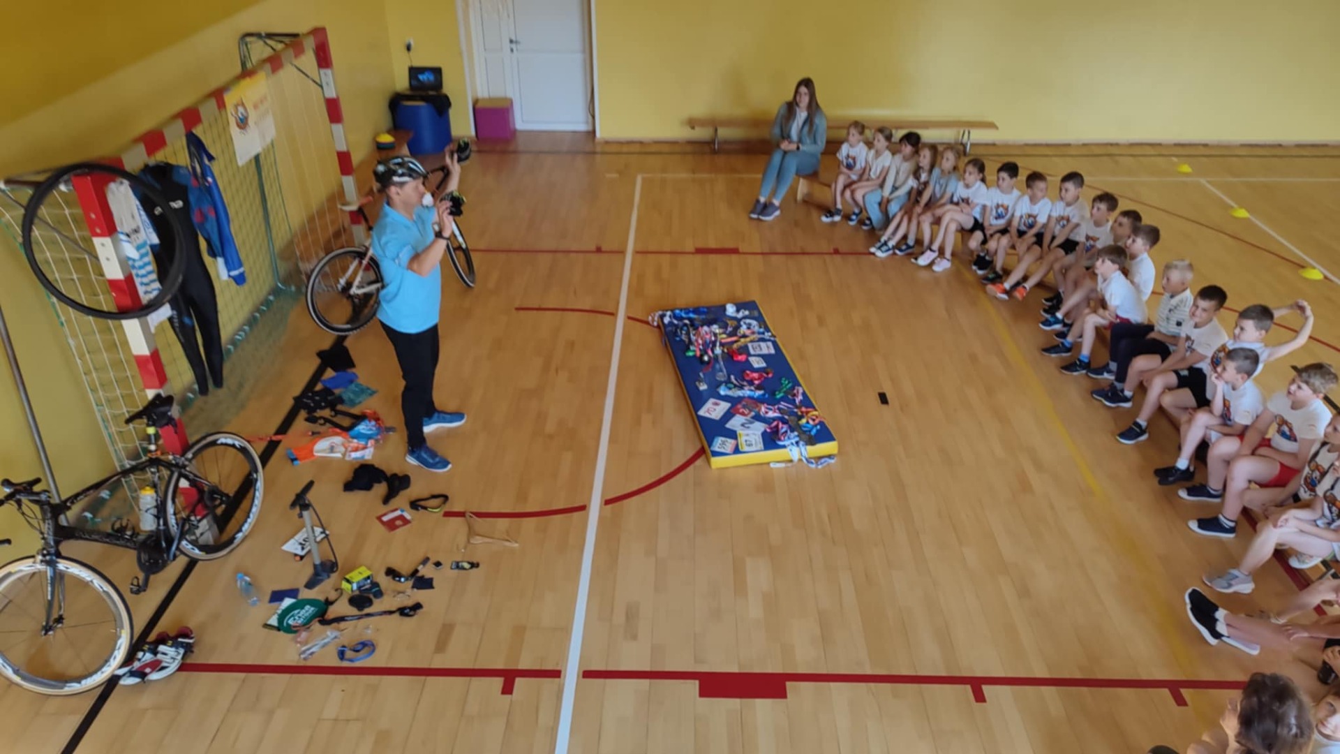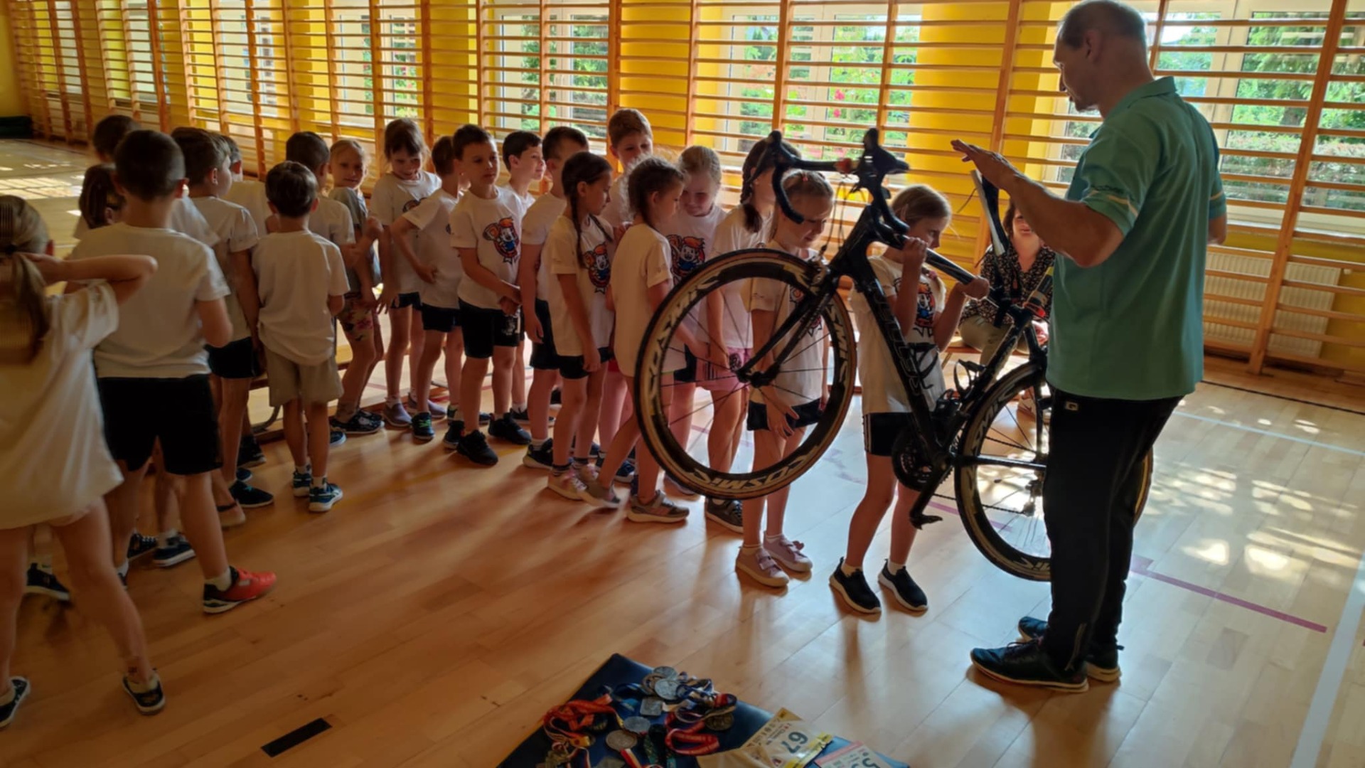 Prowadzący opowiedział na temat kolarstwa oraz triathlonu, zaprezentował sprzęt rowerowy oraz poćwiczył wspólnie z dzieci .