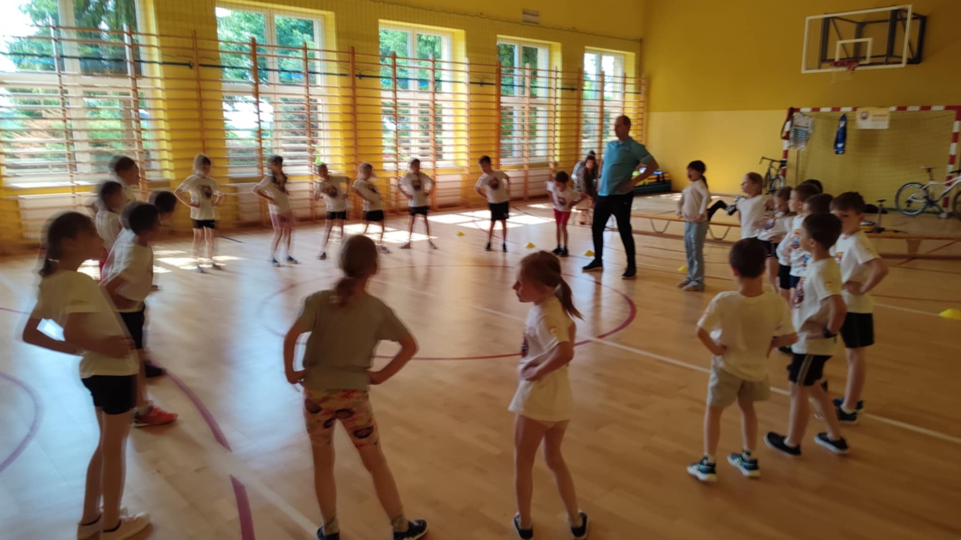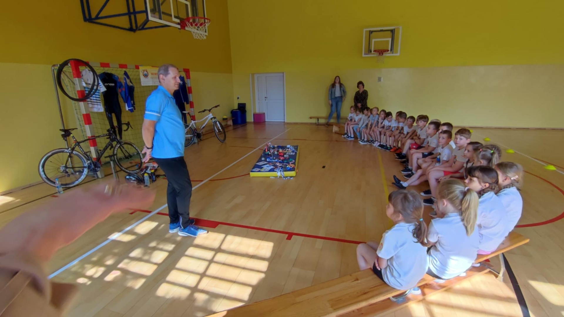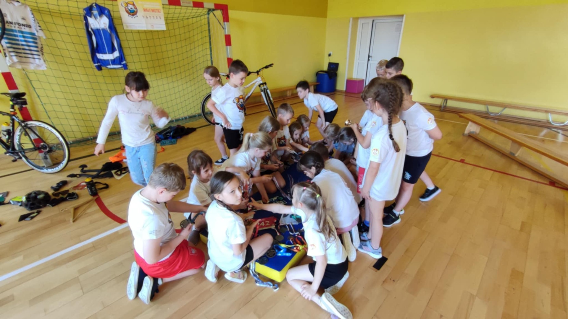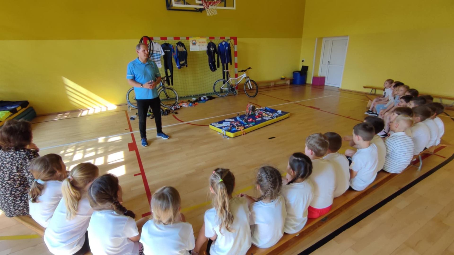 Prowadzący opowiedział na temat kolarstwa oraz triathlonu, zaprezentował sprzęt rowerowy oraz poćwiczył wspólnie z dzieci .