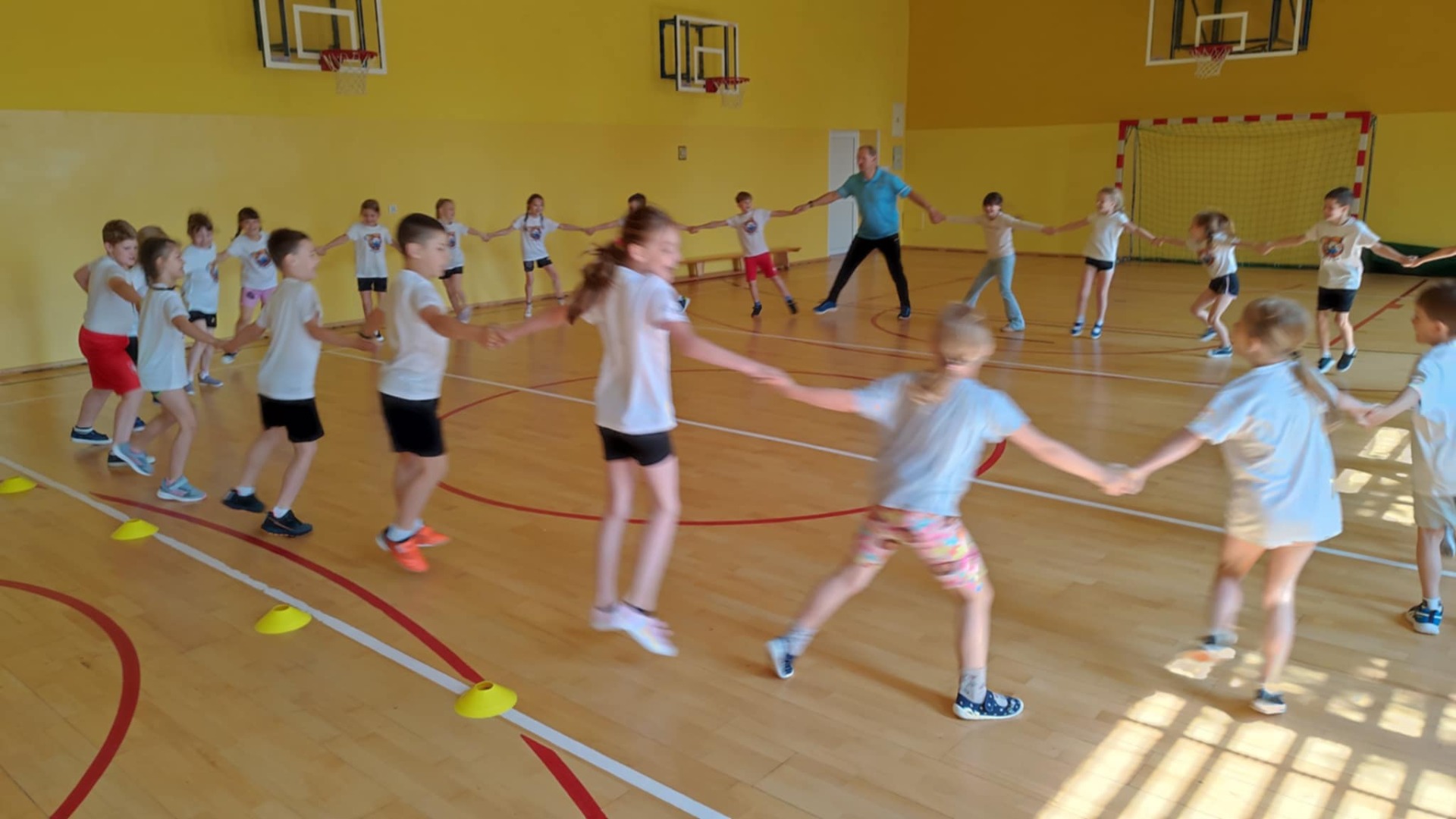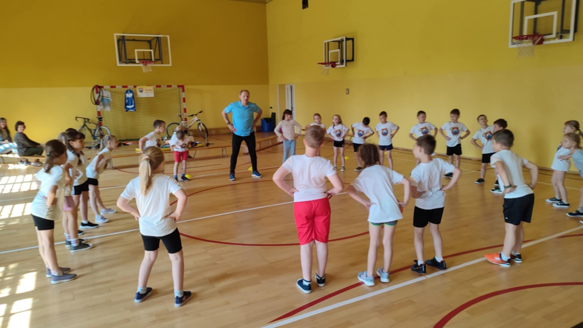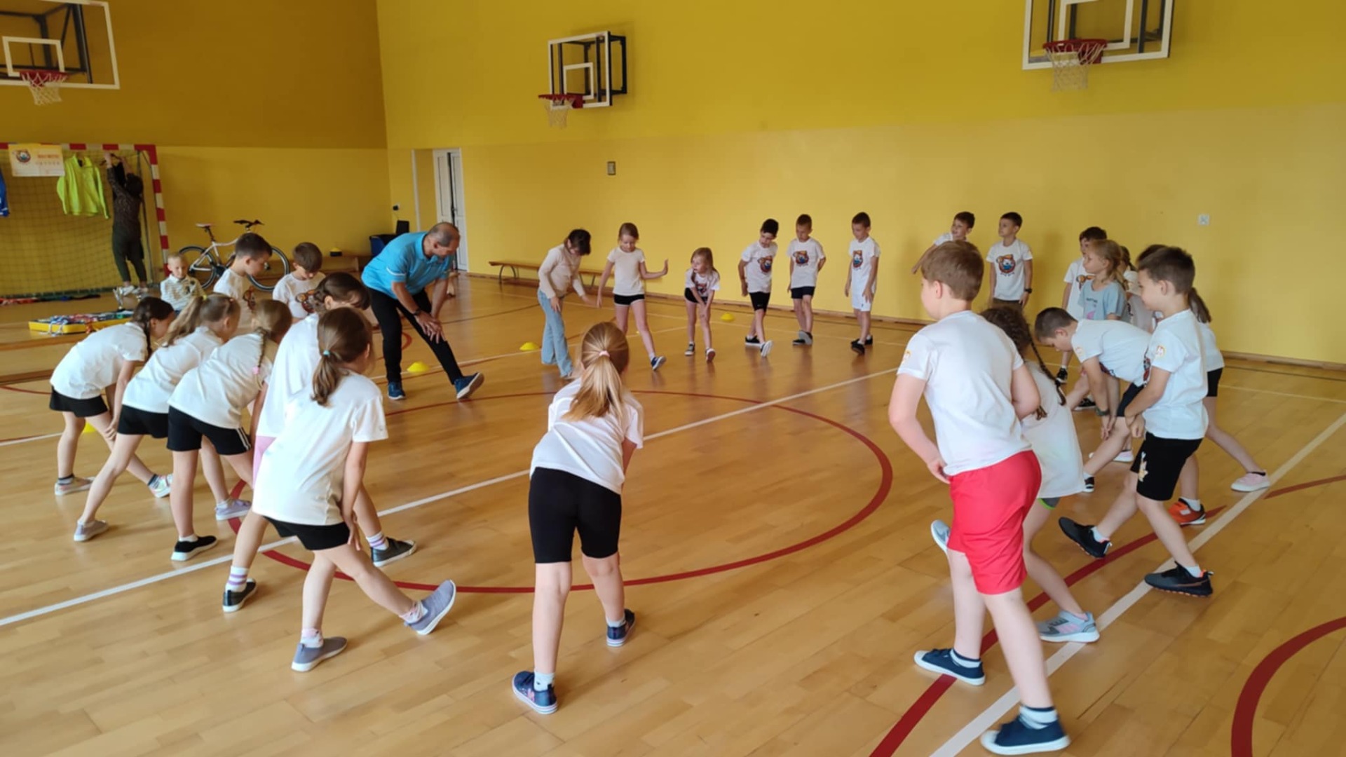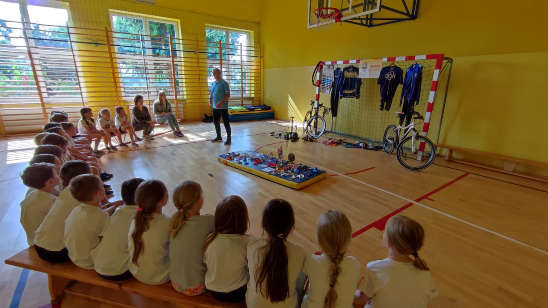 Prowadzący opowiedział na temat kolarstwa oraz triathlonu, zaprezentował sprzęt rowerowy oraz poćwiczył wspólnie z dzieci .