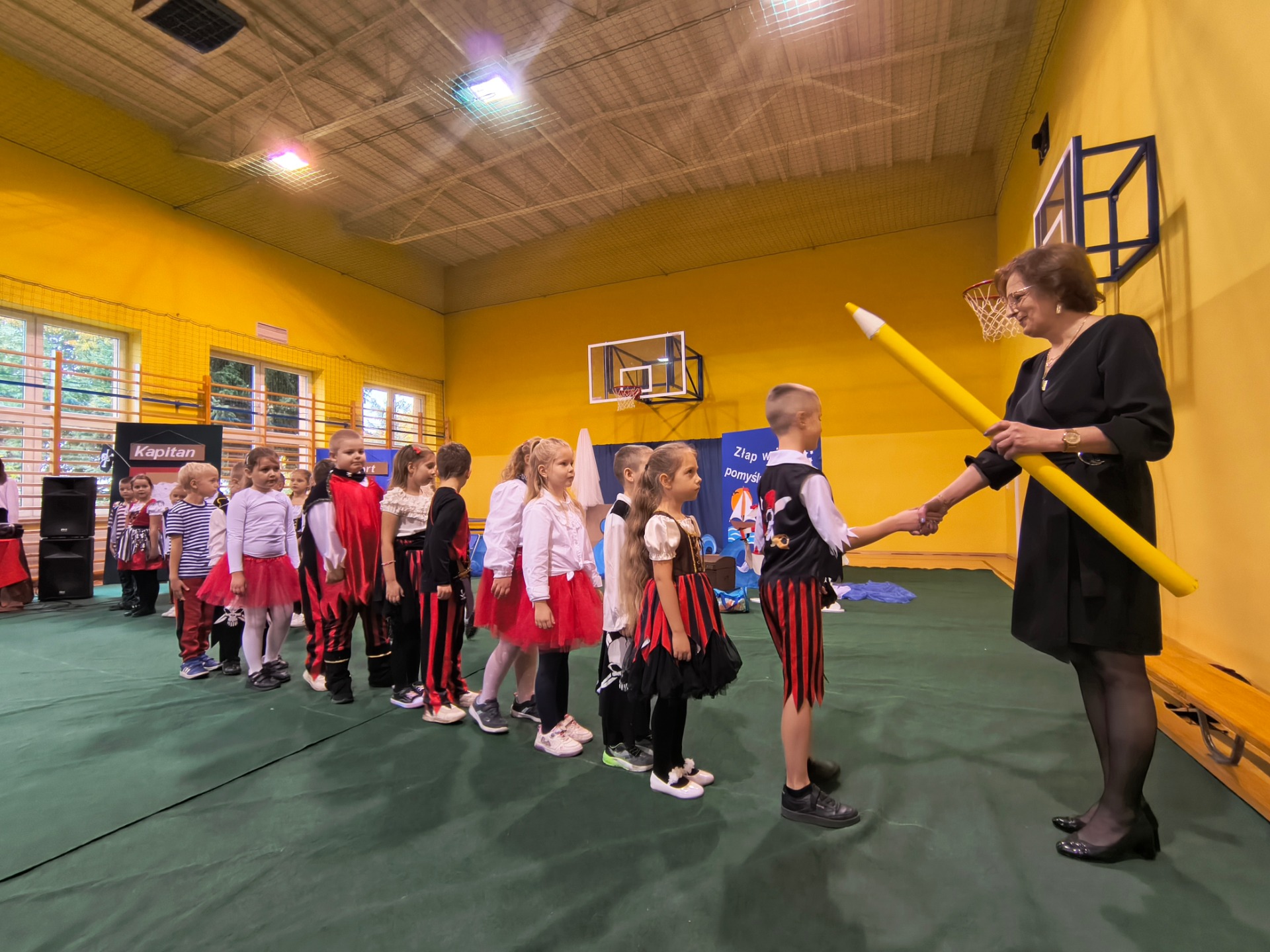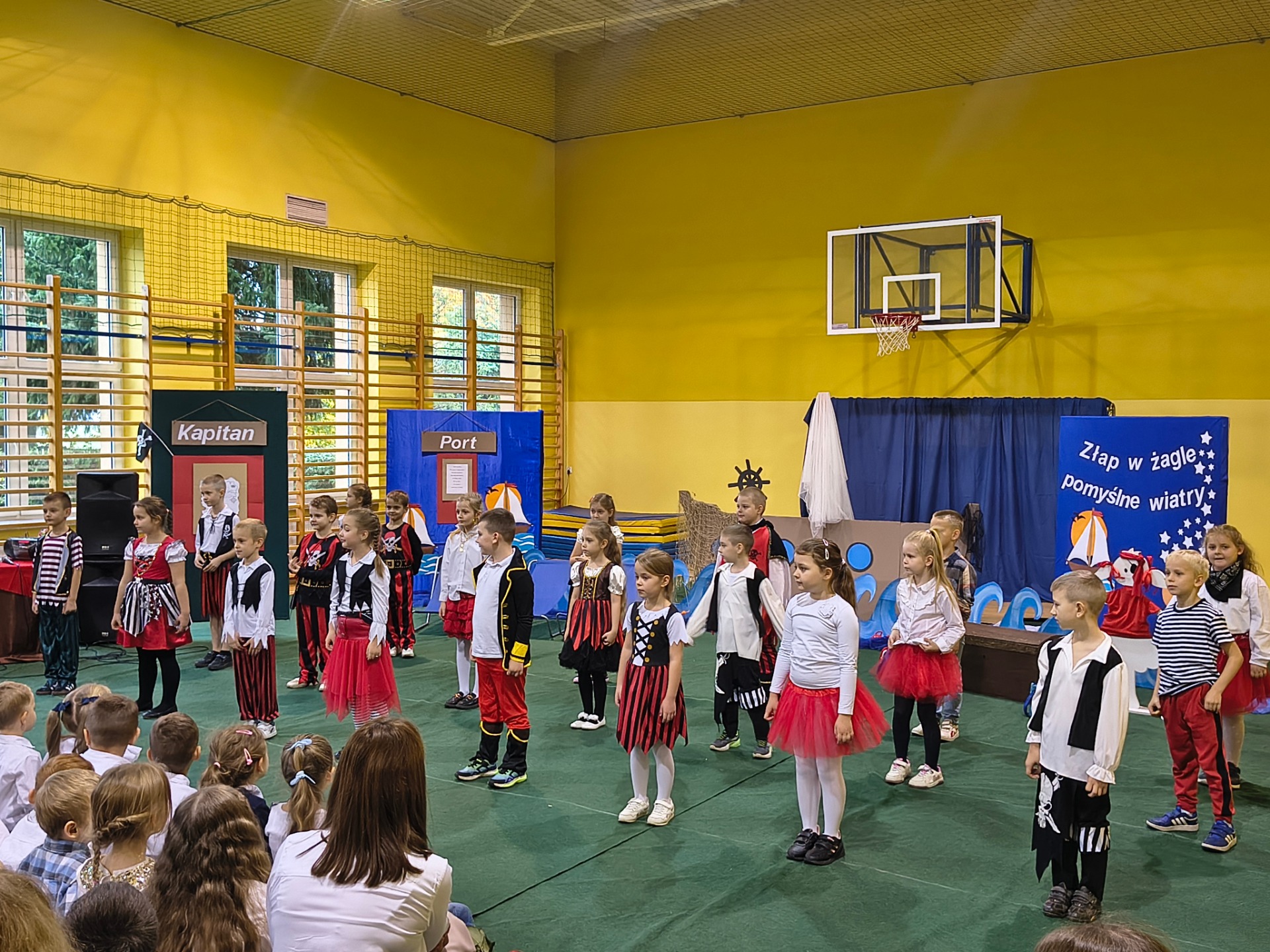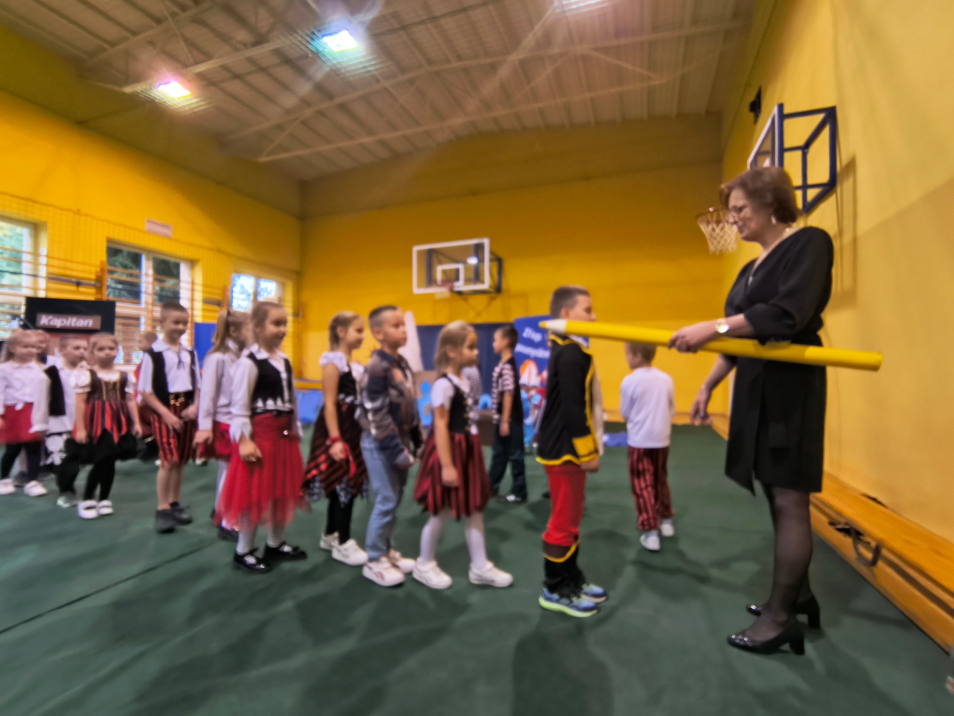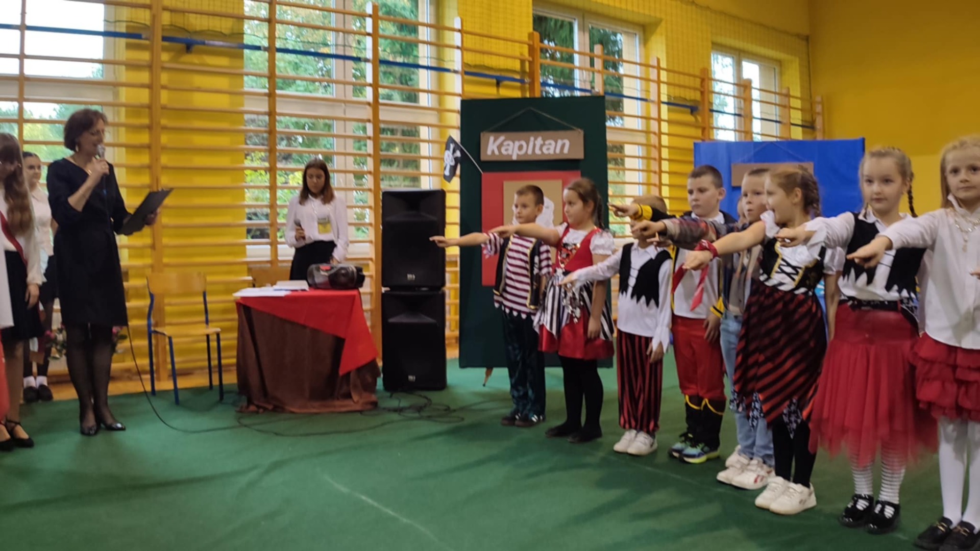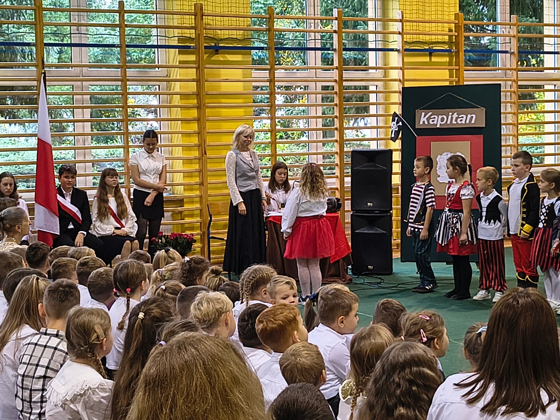 Po tej części nadszedł długo wyczekiwany moment – pasowanie na ucznia klasy pierwszej. Tegoroczna ceremonia miała wyjątkowy, bajkowo-przygodowy charakter. Pierwszoklasiści przedstawili „Piracką opowieść”, w której jako dzielna załoga wyruszyli w symboliczny ośmioletni rejs po morzach nauki. Nad ich podróżą czuwała kapitan – pani wychowawczyni Beata Klause, zapraszając dzieci do wspólnej, pełnej przygód szkolnej wyprawy.