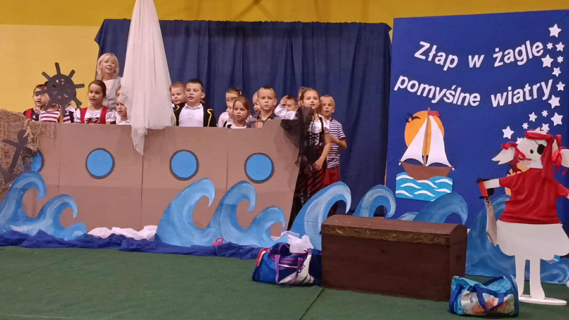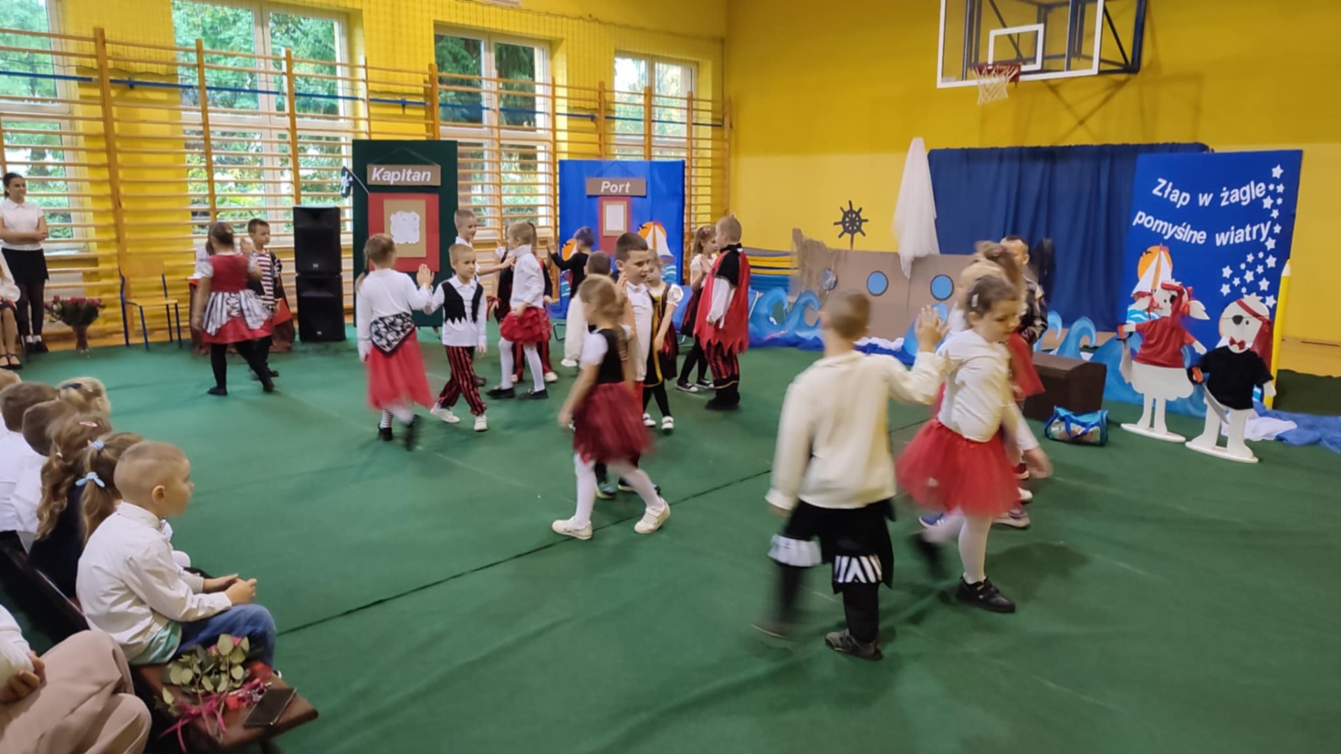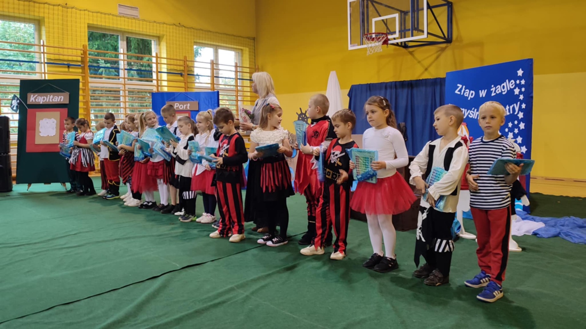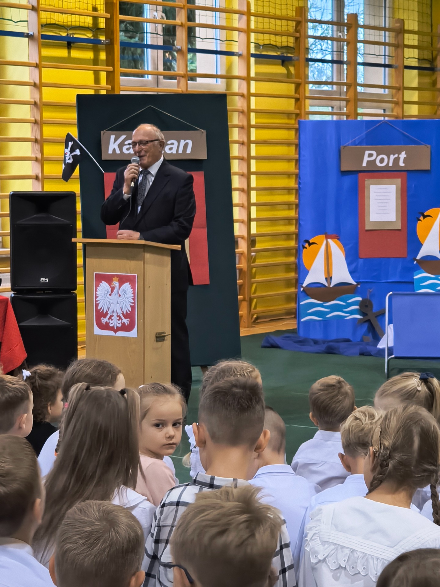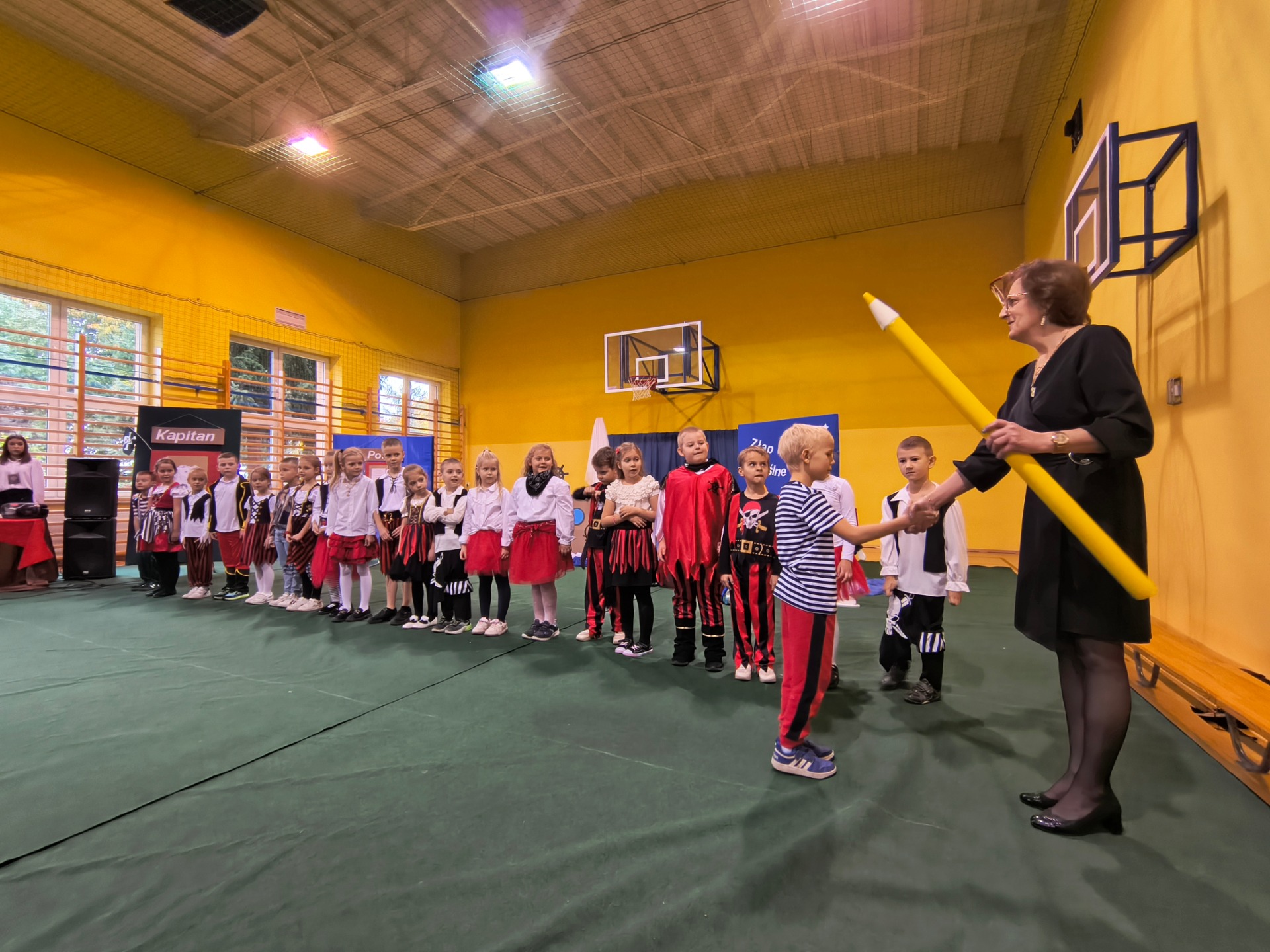 Po tej części nadszedł długo wyczekiwany moment – pasowanie na ucznia klasy pierwszej. Tegoroczna ceremonia miała wyjątkowy, bajkowo-przygodowy charakter. Pierwszoklasiści przedstawili „Piracką opowieść”, w której jako dzielna załoga wyruszyli w symboliczny ośmioletni rejs po morzach nauki. Nad ich podróżą czuwała kapitan – pani wychowawczyni Beata Klause, zapraszając dzieci do wspólnej, pełnej przygód szkolnej wyprawy.