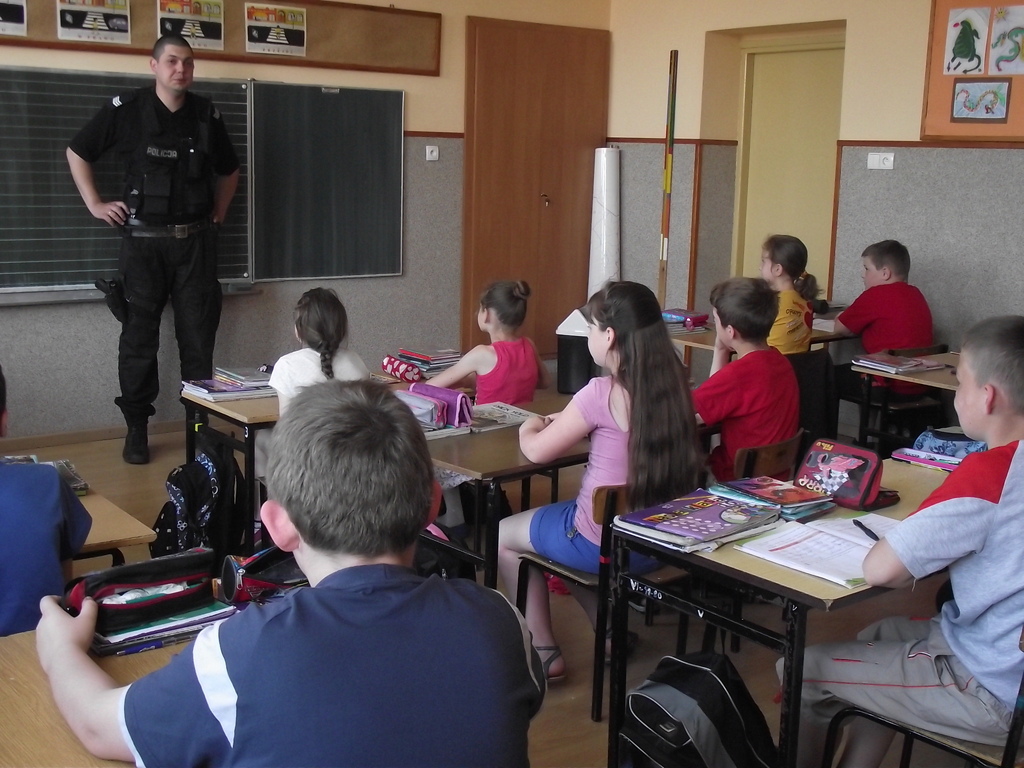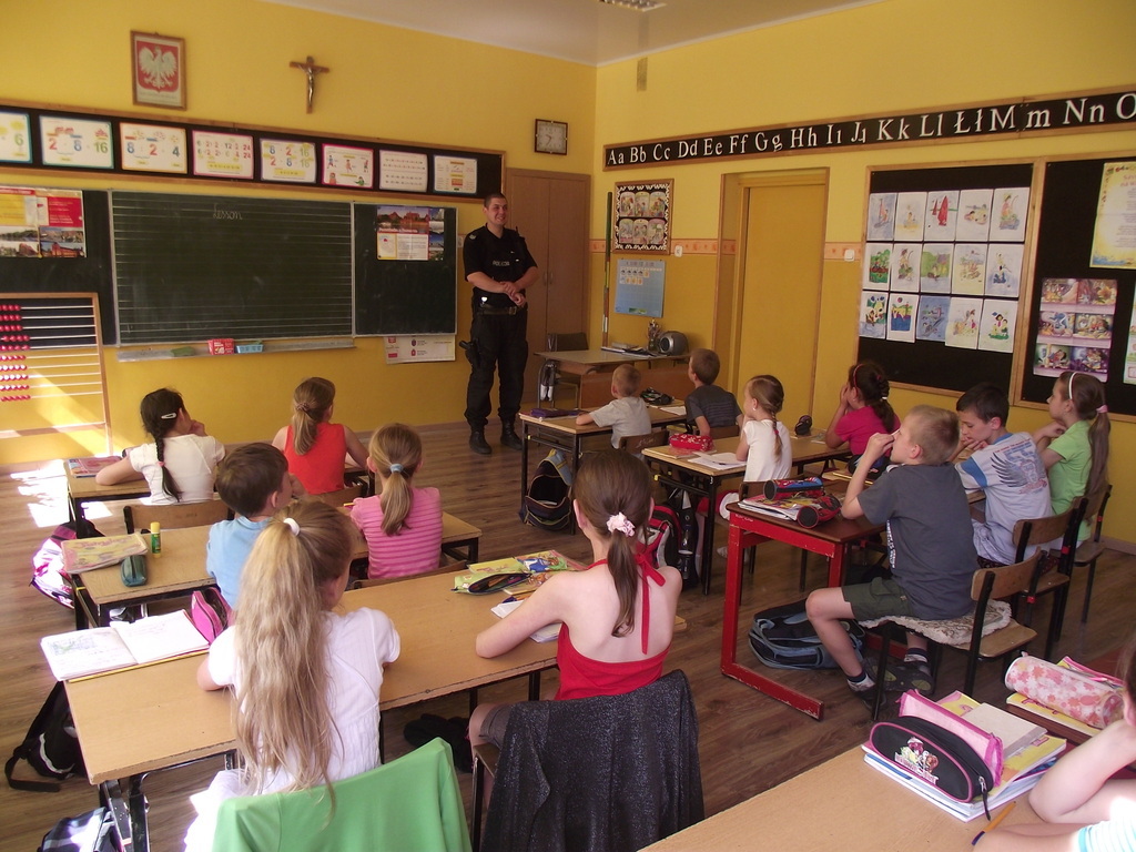 Tuż przed zakończeniem roku szkolnego i rozpoczęciem wakacji letnich naszą szkołe odwiedził pan dzielnicowy sierż. sztab. Dawid Klarzyński. Policjant spotkał się z uczniami najmłodszych klas, przeprowadził krótką pogadankę na temat bezpieczeństwa podczas wakacji oraz zwrócił szczególną uwagę na ostrożność podczas prac w gospodarstwie rolnym. Pan dzielnicowy przypomnił również, że poruszanie się w ruchu drogowym i przebywanie w miejscach nieodpowiednich do zabawy, powinno odbywać się tylko w obecności osób dorosłych. Dzieci w trakcie pogadanki mogły zadawać nurtujące je pytania, a na koniec obiecały panu policjantowi, że będą przestrzegać podstawowych zasad bezpieczeństwa podczas letniego wypoczynku zarówno w domu jak i podczas wakacyjnych wyjazdów.
