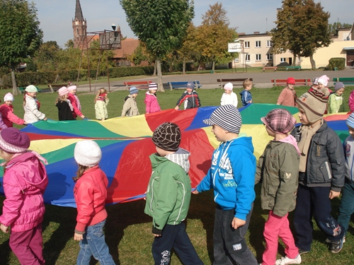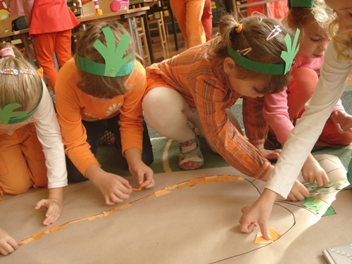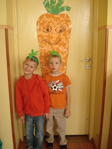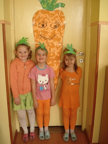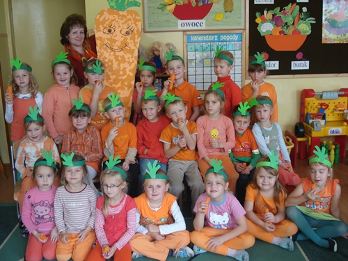 W ramach działań wychowawczo- dydaktycznych wychowawczyni oddziału starszaków - B. Kukfisz - opracowała całotygodniowy cykl zajęć pod tytułem: "Tydzień dla zdrowia". Dzieci miały więc okazję poznać piramidę żywienia i źródło najcenniejszych witamin z owocami i warzywami w roli głównej. Śpiewały piosenki i uczyły się wierszy; dowiedziały się, dlaczego należy jeść śniadanie, unikać zadymionych pomieszczeń oraz uprawiać sport. Ten ostatni zrealizowaliśmy wspólnie z grupą p. D. Staniewskiej na zabawach rekreacyjnych z chustą animacyjną. Sześciolatki podczas zajęć plastycznych wykonały albumy ze zdrową żywnością. Własnoręcznie wykonały również sałatkę warzywną, którą z apetytem zjadły na drugie śniadanie. Uwieńczeniem całotygodniowej tematyki prozdrowotnej było Święto Marchewki. Dzieci przebrane za to popularne warzywo wspólnie wykonały gigantyczną marchewkę. Nie mogło oczywiście w tym dniu zabraknąć marchewkowych potraw oraz soku Kubuś. Dzień owocował w wiele wrażeń i emocji, a to bez wątpienia pozwala osiągnąć cel edukacyjny.