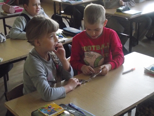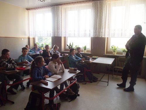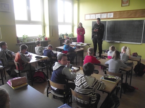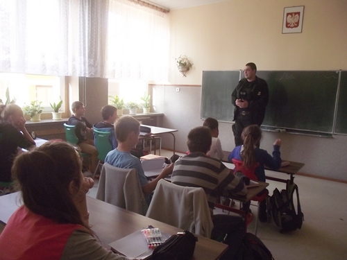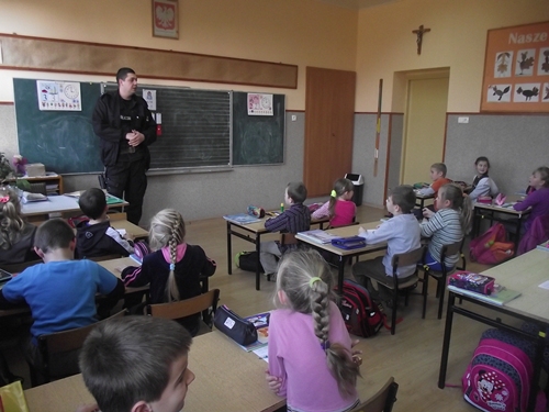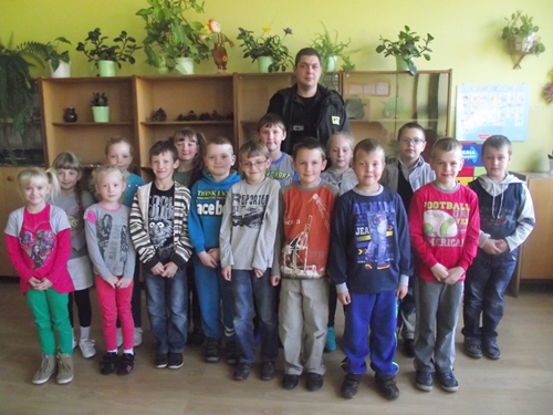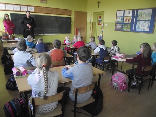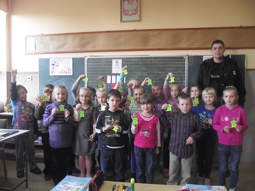 15 października 2013 r. uczniów naszej szkoły odwiedził pan dzielnicowy mł.asp. Dawid Klarzyński. Funkcjonariusz spotkał się z uczniami klas I i II oraz VI. W młodszych klasach przeprowadził krótką pogodankę na temat bezpieczeństwa w drodze do i ze szkoły, podczas zabawy i w czasie prac w gospodarstwie rolnym. Szczególną uwagę zwrócił przede wszystkim na zachowanie ostrożności w kontaktach z nieznajomymi, przestrzegał przed przyjmowaniem od obcych ludzi jakichkolwiek słodyczy czy upominków, a także przed wsiadaniem do samochodu obcej osoby. Dzieci z zapartym tchem i podziwem słuchały pana policjanta, zadawały nurtujące je pytania. Uczniowie klasy II potrafili przedstawić w jakiej pozycji uchronić się przed atakującym, groźnym psem, a także jak prawidłowo przechodzić przez jednię. W nagrodę przedstawiciel koźmińskiej policji pokazał uczniom jeden z atrybutów każdego policjanta - kajdanki, które dzieci mogły dokładnie obejrzeć i dotknąć. Pan mł.asp. Dawid Klarzyński dla klas I i II przywiózł upominki w postaci planów lekcji oraz znaczków odblaskowych, które przypominają o przestrzeganiu bezpieczeństwa. Spotkanie z klasą VI miało także na celu przypomnienie podstawowych zasad obowiązujących w ruchu drogowym, wyjaśnienie i poinformowanie o rodzajach czynów karalnych, ich konsekwencjach i przestrzeganie przed kontaktami z osobami nieznajomymi.