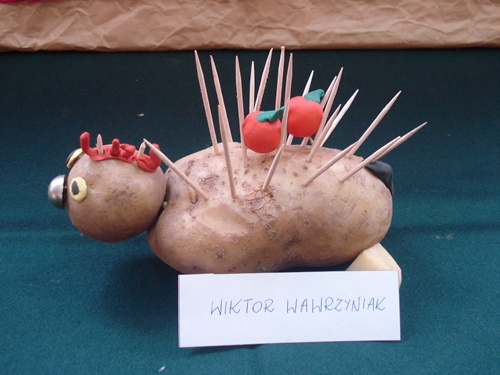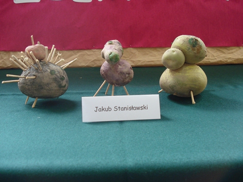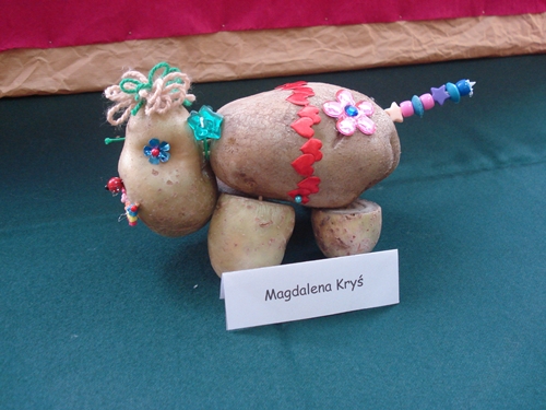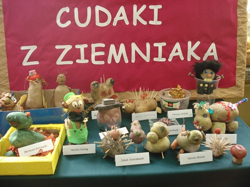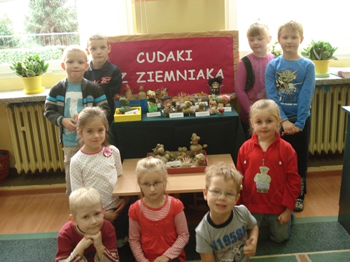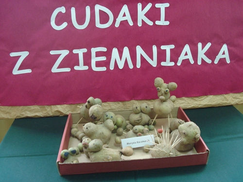 Aby ożywić wzajemne więzi i pogłębić rodzicielskie relacje, postanowiliśmy zaangażować rodziców do wspólnego przedsięwzięcia, jakim była wystawa: \"Cudaki z ziemniaka\". Okazuje się bowiem, że z ziemniaka można zrobić (prawie) wszystko - tak jak w wierszu Hanny Łochockiej: \" Co można zrobić? O, ho! Mówiąc najprościej: Sto różnych różności\". Sprawdziliśmy to i...Rzeczywiście, pomysłów na wspólne dzieło było mnóstwo. I to nic nie szkodzi, że dzieci były przede wszystkim pomysłodawcami i miały marzenia, a rodzice musieli je zrealizować. Liczył się efekt; wspólne rodzinne dzieło. A ile przy tym było zabawy i radości! Wszystkie prace dzieci przyniosły na wystawę. Cieszyła się ona ogromnym zainteresowaniem wszystkich z wykonawcami na czele. Trudno było wybrać najładniejszy pomysł i najładniejszą pracę. Na wyróżnienie zasłużyli wszyscy: i rodzice, i dzieci. Zresztą zobaczcie to sami!