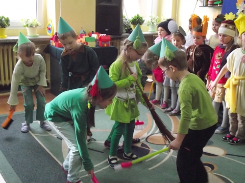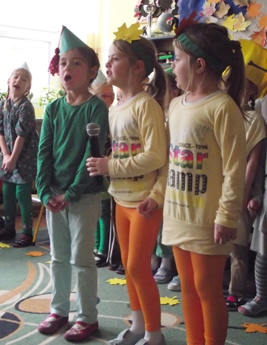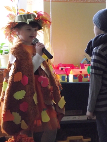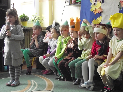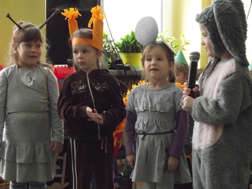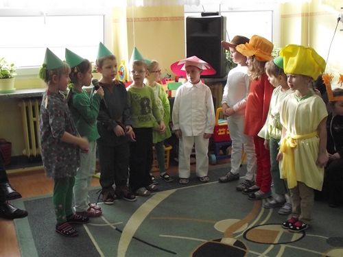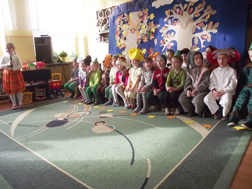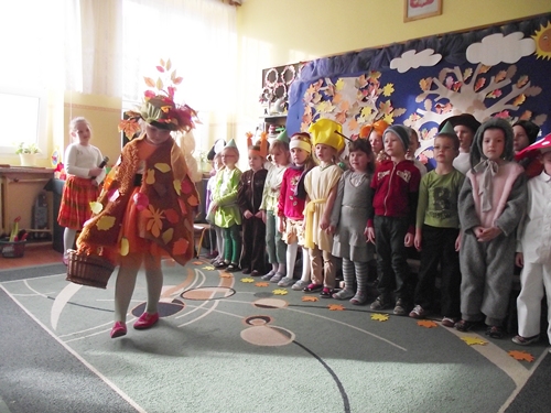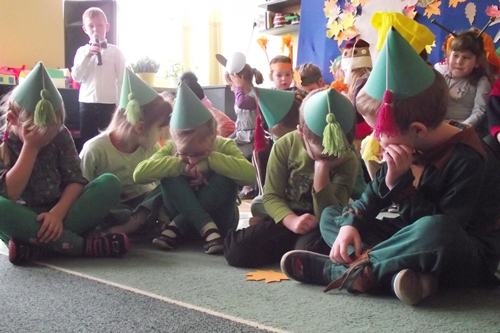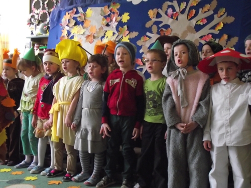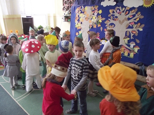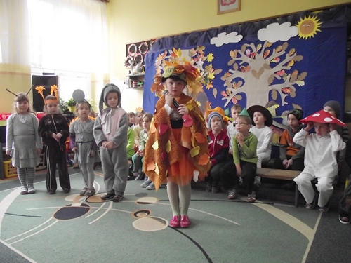 W dniu 29.11.br. dzieci z oddziału 5,6-latków wystawiły przedstawienie na pożegnanie jesieni pt. "Leśne duszki i grzyby". Było ono podsumowaniem całej tematyki jesiennej i jednocześnie uwieńczeniem trzymiesięcznej pracy w ramach przedszkolnego teatrzyku. Mali aktorzy zaprosili na swój sceniczny debiut rodziców oraz najbliższych. Honorowym gościem był także Pan Dyrektor J. Baszczyński. Przedstawienie - oparte na motywach znanego utworu literatury dziecięcej - w nowej aranżacji, wzbogacone piosenkami i tańcami, urzekło wszystkich widzów. Niemałe wrażenie zrobiły solowe partie piosenek o jesieni. Na całość złożyły się również proste, a zarazem piękne stroje przygotowane przez rodziców, a także scenografia. Nad tą ostatnią pracowały wszystkie dzieci malując elementy jesiennego krajobrazu. Choć niektóre dzieci długo walczyły z tremą przed publicznym występem, w efekcie wszystko przebiegło zgodnie ze scenariuszem. Widzowie byli pod wrażeniem, o czym świadczyły gorące brawa.