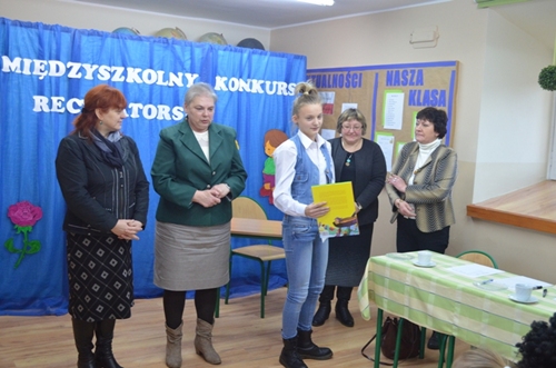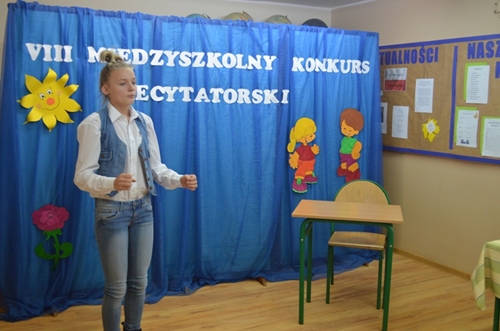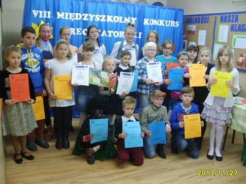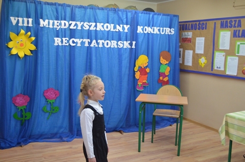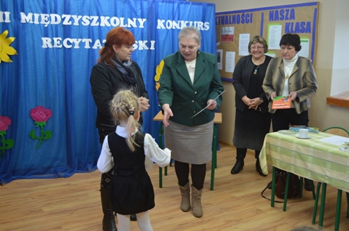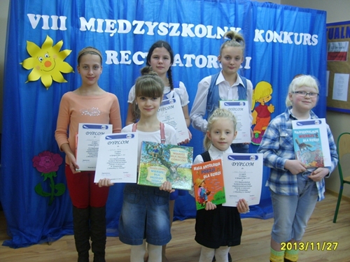 W dniu 27 listopada 2013 r. czwórka dziewcząt godnie reprezentowała naszą szkołę w VIII Międzyszkolnym Konkursie Recytatorskim pod hasłem " Dziecko w poezji M. Konopnickiej, J. Brzechwy i J. Tuwima" zorganizowanym przez Zespół Szkolno - Przedszkolny im. Marii Konopnickiej w Borzęciczkach. Nasze reprezentantki zostały wyłonione do międzyszkolnego konkursu po trudnych zmaganiach w eliminacjach szkolnych. W kategorii klas I-III wystąpiły Marita Wojtaszyk oraz Maria Krawczyk, natomiast w kategorii klas starszych reprezentowały naszą szkołę Marta Banaszak oraz Florentyna Rybczyńska.