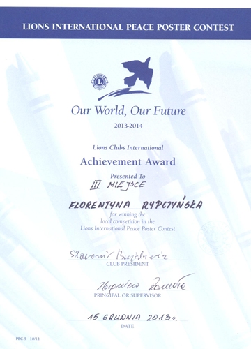 Nasza uczennica Florentyna Rybczyńska z klasy VI zdobyła III miejsce w konkursie plastycznym o tematyce pokojowej, organizowanym przez Krotoszyński Lions Clubs International. Gratulujemy!!