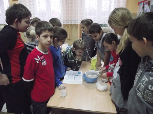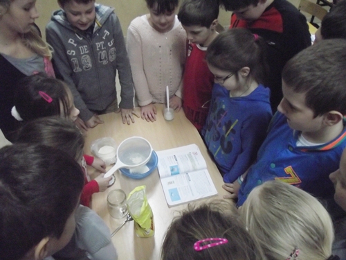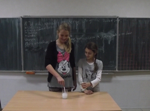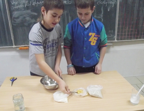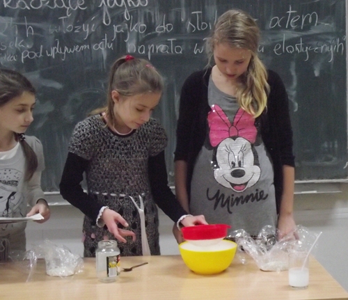 Uczniowie klasy IV wraz z nauczycielką przyrody panią Aliną Rączką przygotowali kilka doświadczeń na podstawie produktów, które można znaleźć w każdej kuchni. Jedni wcielili się w rolę prowadzących doświadczenia, inni byli ich asystetami. Zajęcia były bardzo ciekawe, a doświadczenia w prosty sposób zobrazowały procesy zachodzące w przyrodzie. Uczniowie m.in. mieszali cała stałe z ciekłymi czyli otrzymywali mieszaniny jednorodne, obserwowali proces krystalizacji jak i proces odwracalności. Niesamowite wrażenie wywołało "skaczące jajko" przygotowane przez Huberta Roszczaka, które w wyniku reakcji z octem nabrało właściwości elastycznych. Była to lekcja niezwykle ciekawa, atrakcyjna i pouczająca.